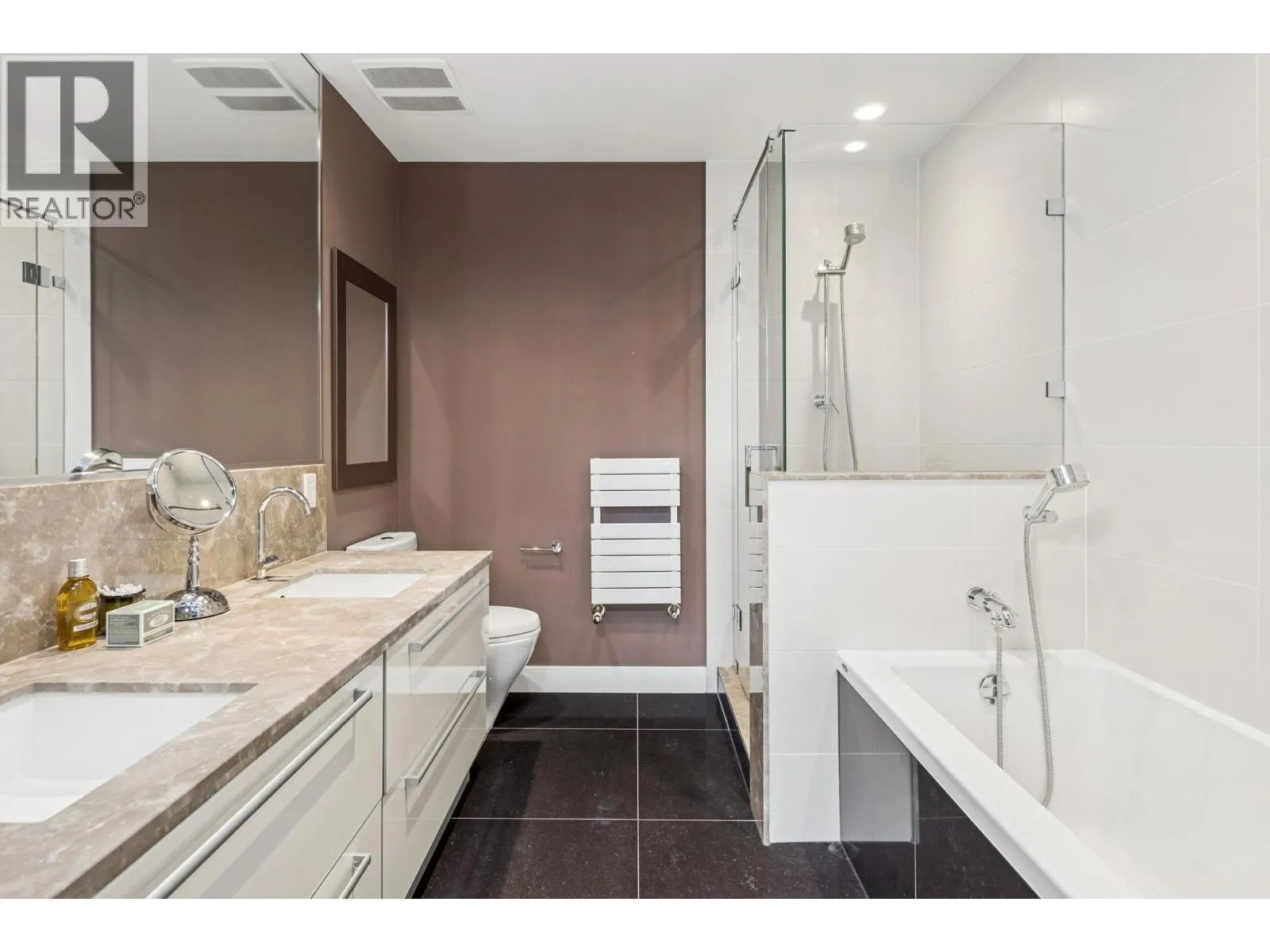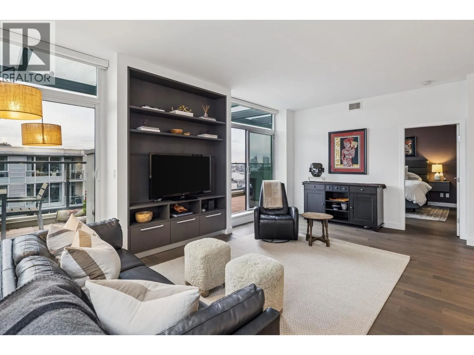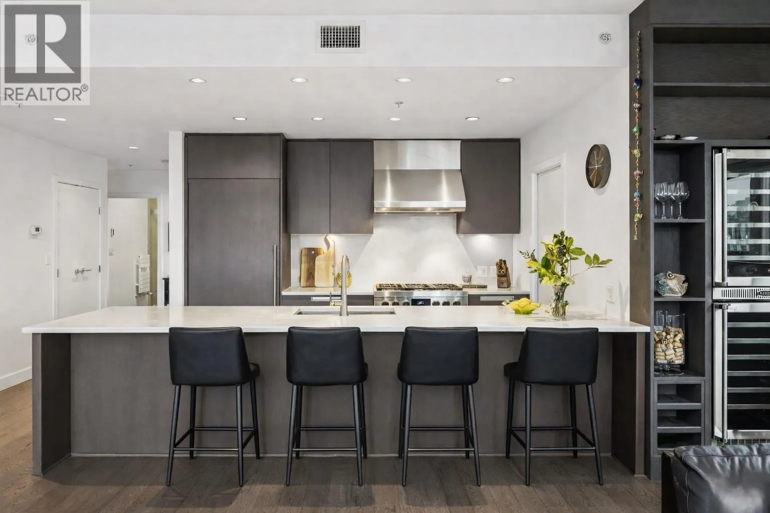 Luxurious 2 BED, 2 BATH + DEN with WATER VIEWS at 'The James' by Cressey offers over 1,200 sqft of thoughtfully designed, expansive interior living. Feat. incl, sleek hardwood flooring, high-end S/S & Miele appliances, A/C, radiant in-floor heating, 2 integrated beverage fridges, custom millwork, extensive in-suite storage & primary walk-in closet, & a dedicated pantry. Floor-to-ceiling windows provide western exposure with open views of Downtown, False Creek, and Mount Pleasant. A massive private terrace with a gas fireplace creates an exceptional extension of the living space, ideal for entertaining. Includes two parking stalls with EV capability, concierge, gym, and rooftop terrace & lounge with BBQ area. Impeccably maintained, steps to the seawall & endless restaurants + cafes. A true gem. OPEN HOUSES SAT/SUN FEB 7/8, 2-4PM. (id:27476)
