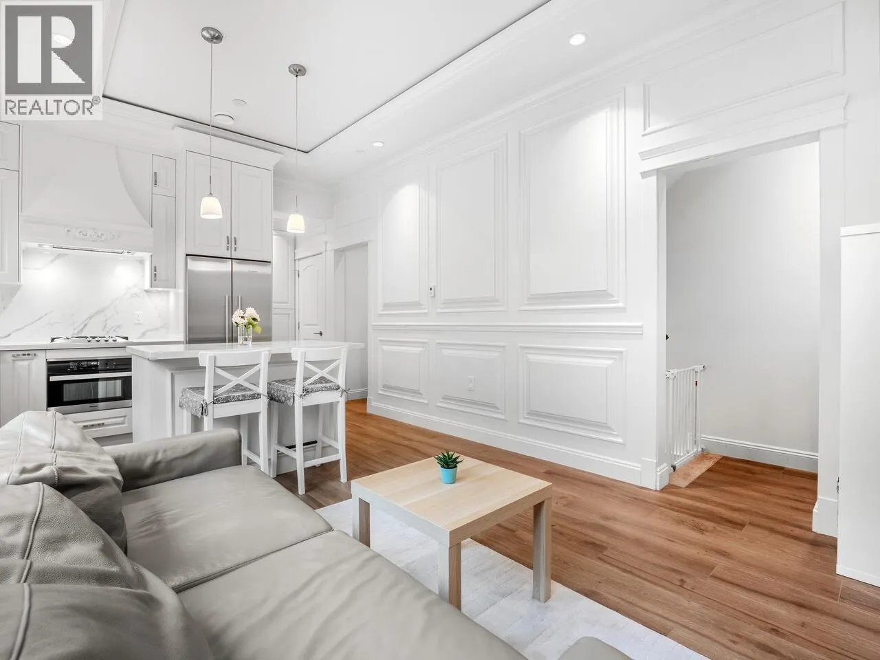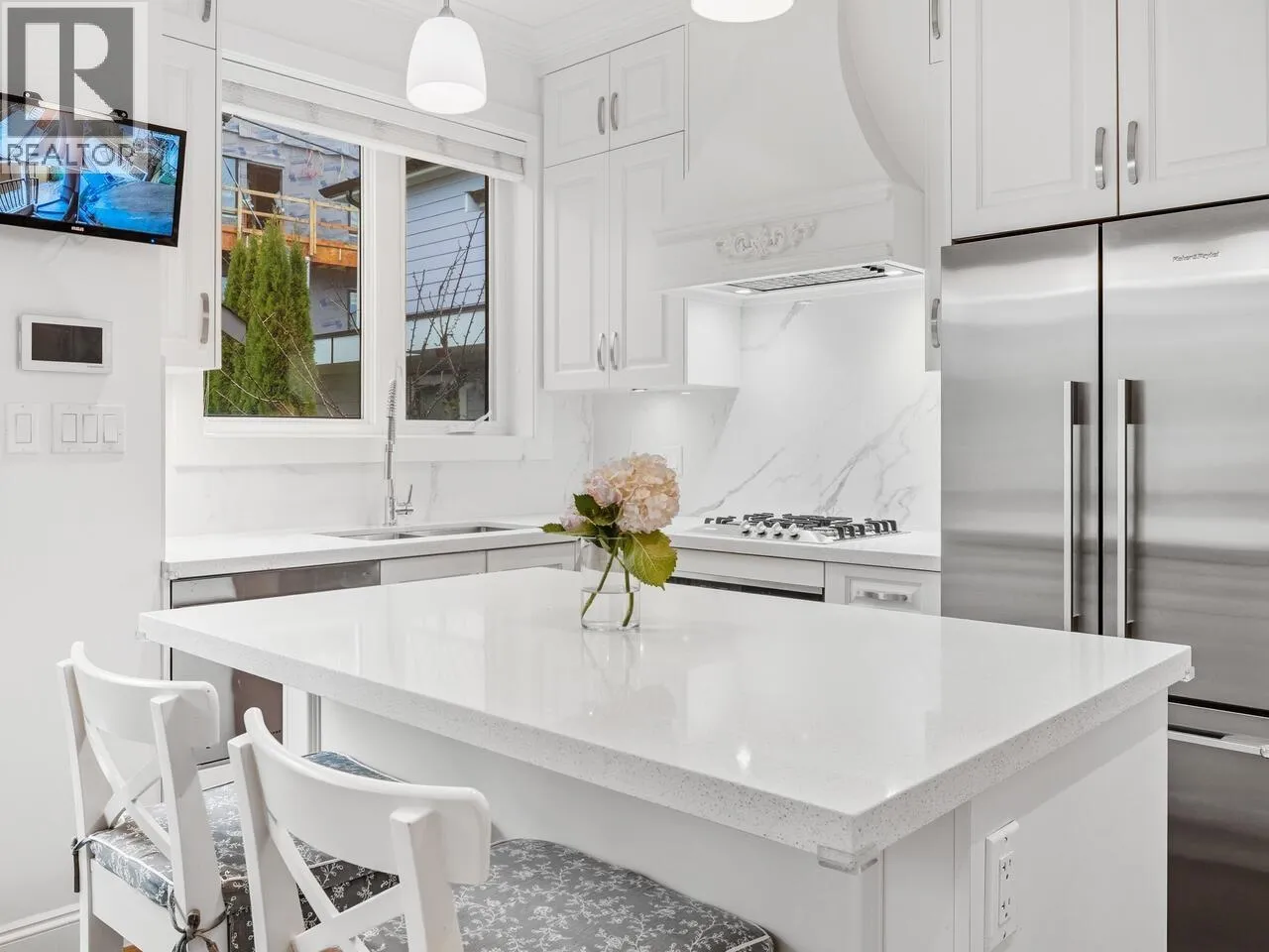 Incredible Collingwood half duplex tucked off the street. Tree-lined patio leads to tile entry with abundant built-ins and a two-piece bath. Quartz-topped island, white cupboards, marble backsplash, stainless steel appliances. Oversized sliding doors open from the living room to a deck overlooking the patio. Soaring ceilings with crown moulding and built-in speakers. Upstairs: second bedroom with private balcony and three-piece en suite; primary with built-ins, deep soaker tub, and separate marble shower. Ground-floor self-contained studio with separate entrance. Radiant heated floors and A/C. One block from Kingsway's restaurants, amenities, and transit. 3D virtual tour at Realtor's site. (id:27476)