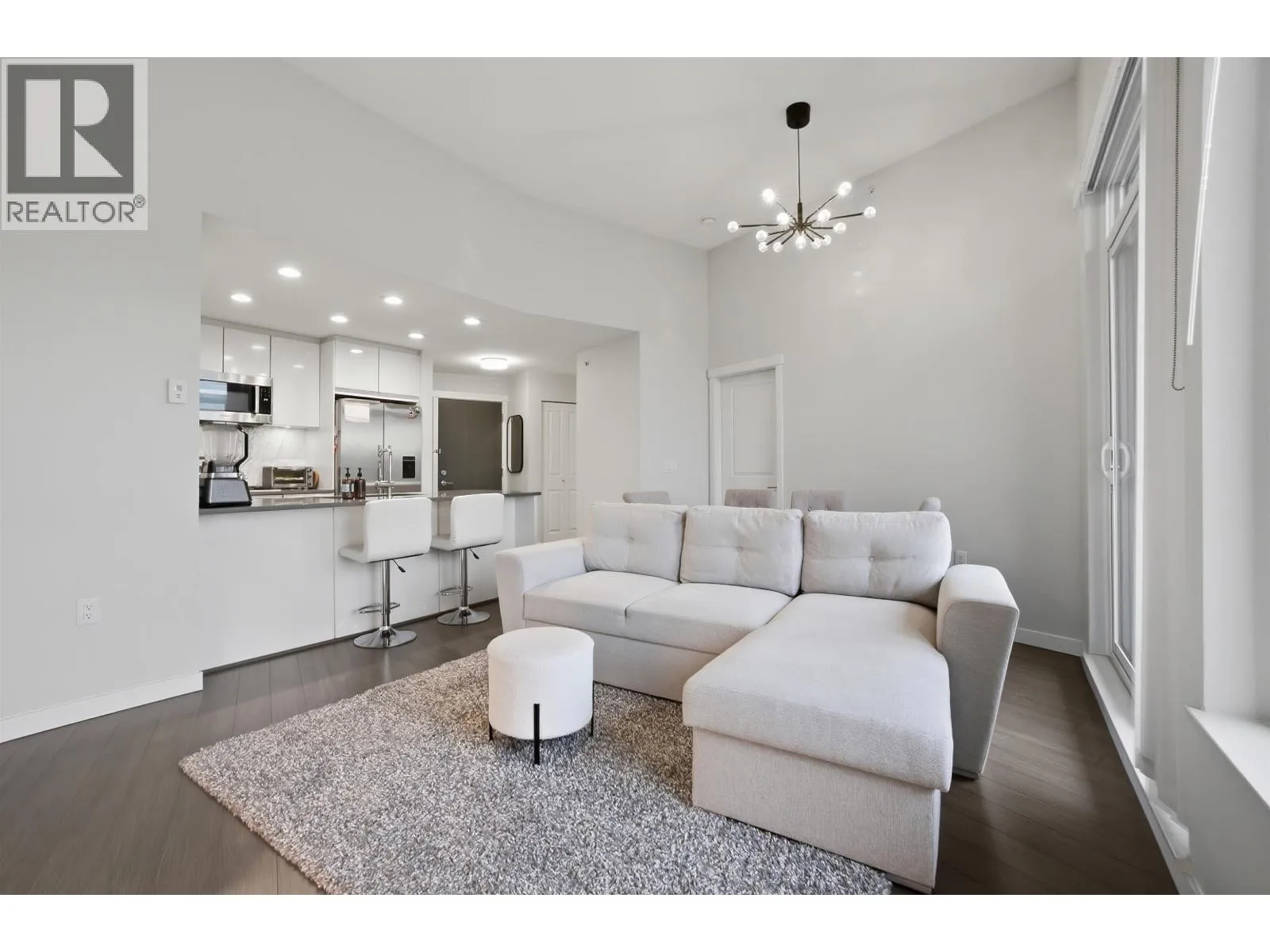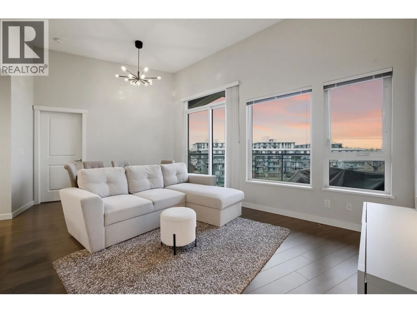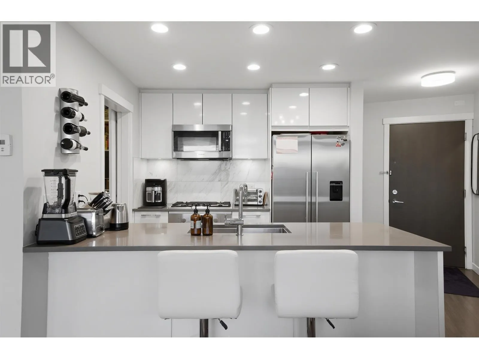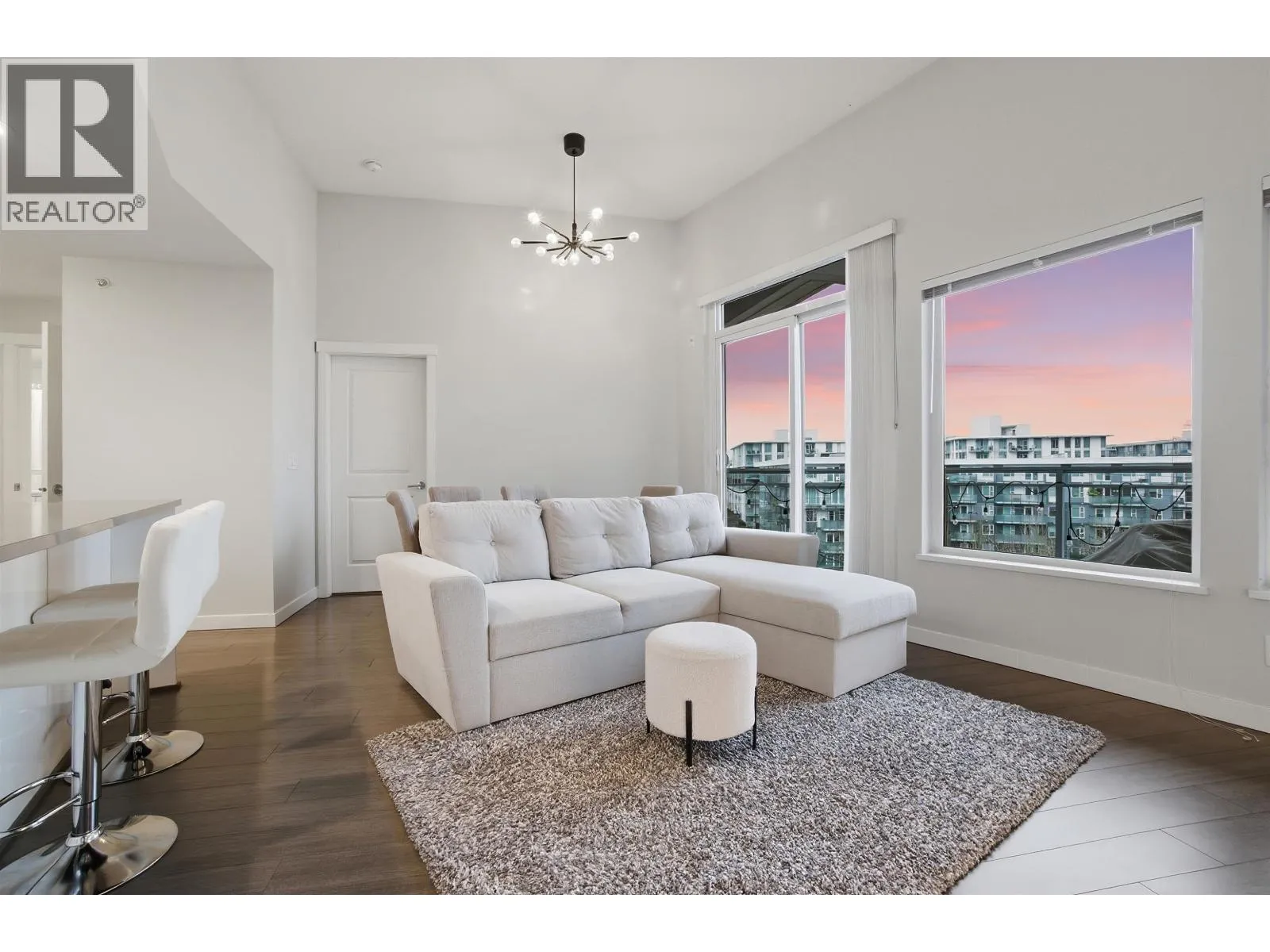 Discover this rare, top-floor southwest-facing home at Rhythm by Polygon, perfectly positioned on the quiet side of the building - not facing Marine Drive. Flooded with natural light, this beautifully designed suite features soaring ceilings, in-floor radiant heating, and a gourmet kitchen equipped with a gas cooktop, Bosch oven and dishwasher, Fisher & Paykel fridge, and elegant quartz countertops. A standout feature is the in-suite storage room, offering the flexibility to use it as a den, office, or additional storage space. Step outside to a spacious private balcony, ideal for relaxing or entertaining. Residents enjoy access to exceptional amenities, including a stylish clubhouse, fully equipped gym, garden courtyard, bike room, and pet wash station. Located in the rapidly expanding River District, you´re steps from scenic riverside trails, vibrant restaurants, grocery stores, and everyday conveniences. Parking stall #288 includes an EV charger and is conveniently located close to the building entrance. (id:27476)