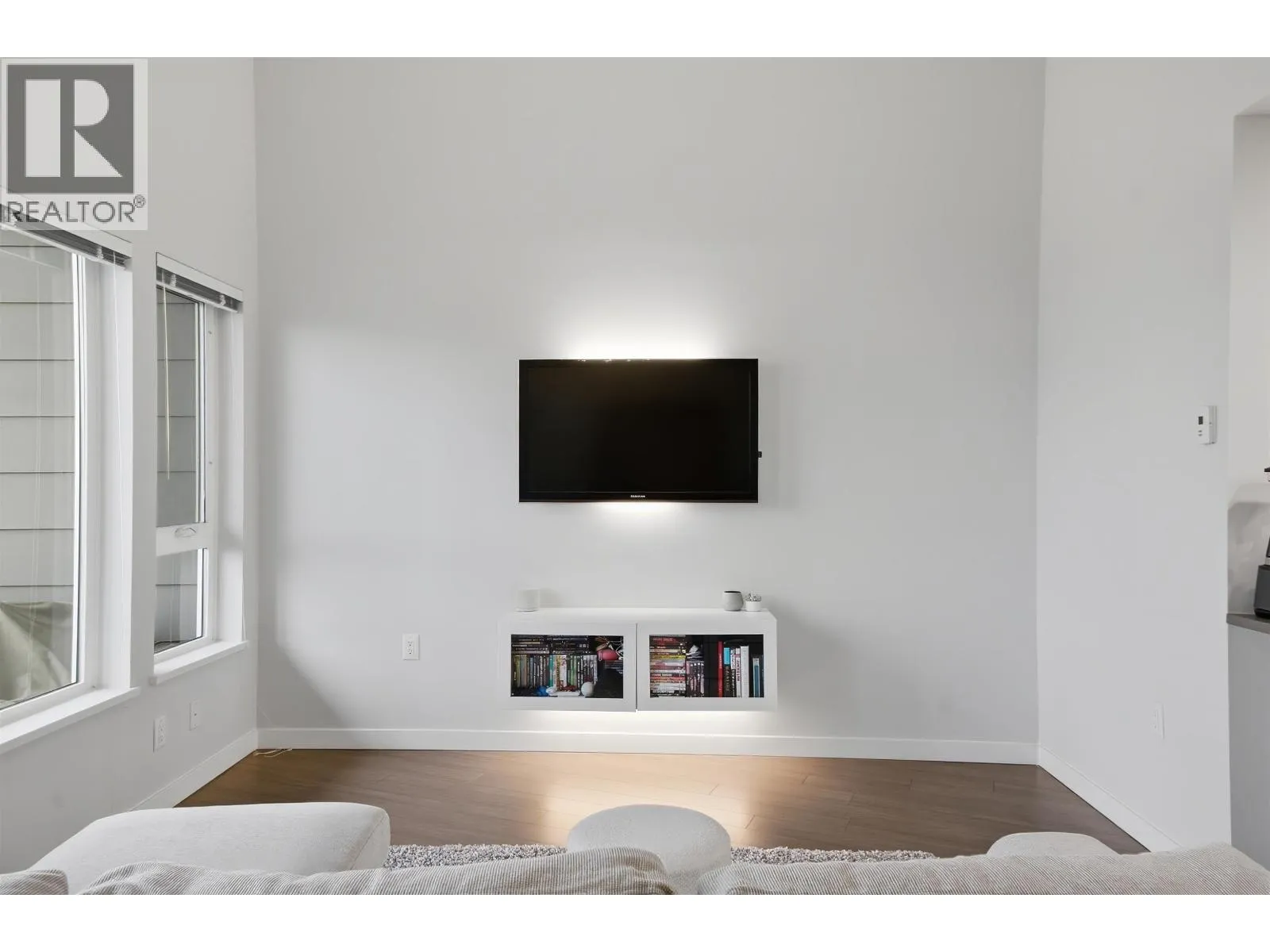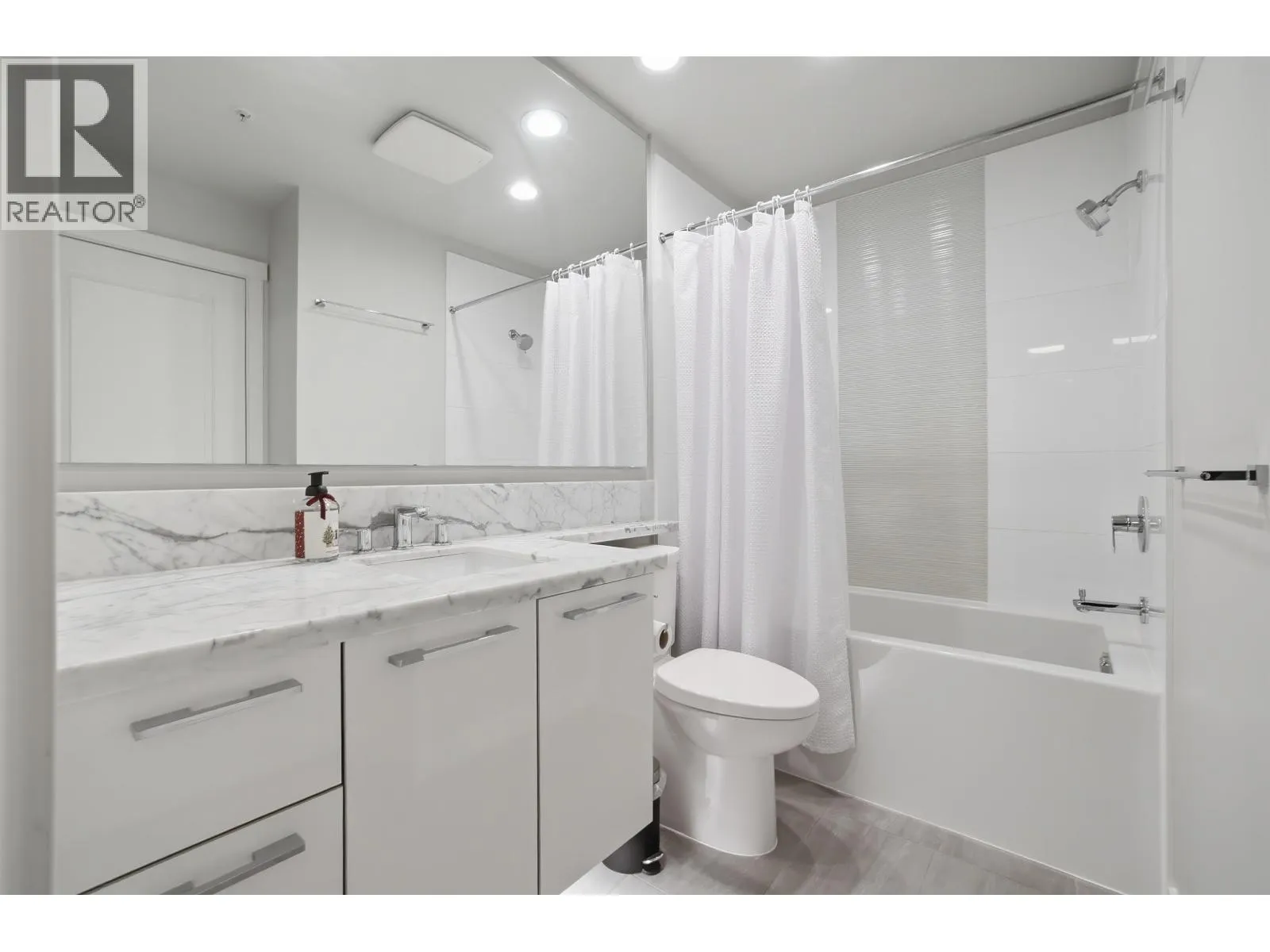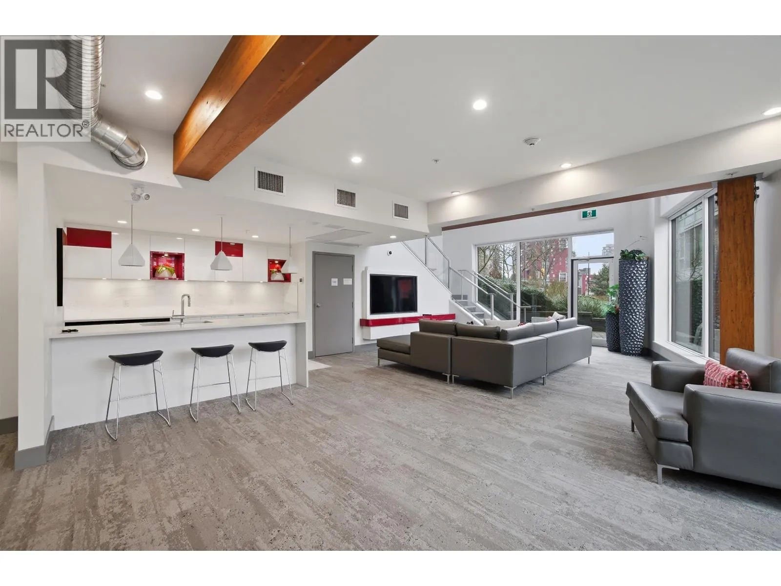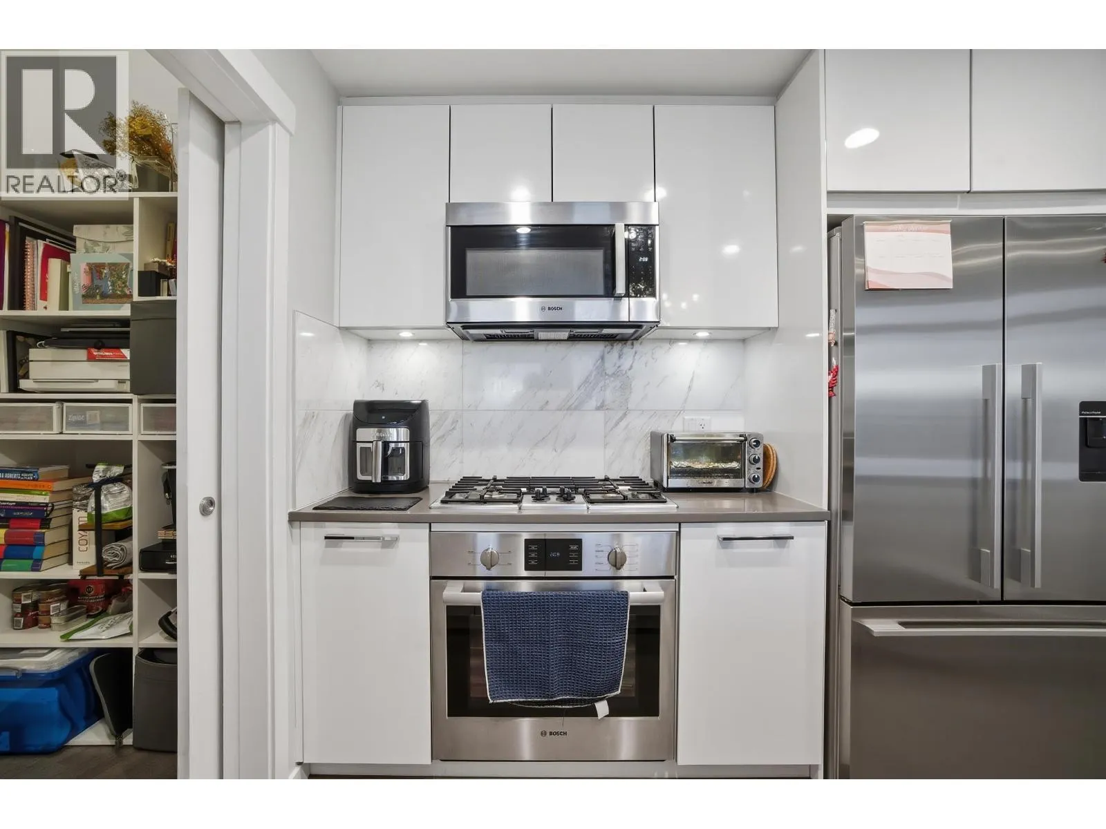 Discover this rare, top-floor southwest-facing home at Rhythm by Polygon, perfectly positioned on the quiet side of the building - not facing Marine Drive. Flooded with natural light, this beautifully designed suite features soaring ceilings, in-floor radiant heating, and a gourmet kitchen equipped with a gas cooktop, Bosch oven and dishwasher, Fisher & Paykel fridge, and elegant quartz countertops. A standout feature is the in-suite storage room, offering the flexibility to use it as a den, office, or additional storage space. Step outside to a spacious private balcony, ideal for relaxing or entertaining. Residents enjoy access to exceptional amenities, including a stylish clubhouse, fully equipped gym, garden courtyard, bike room, and pet wash station. Located in the rapidly expanding River District, you´re steps from scenic riverside trails, vibrant restaurants, grocery stores, and everyday conveniences. Parking stall #288 includes an EV charger and is conveniently located close to the building entrance. (id:27476)