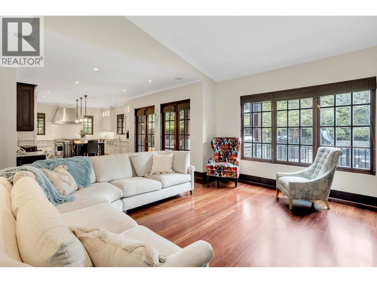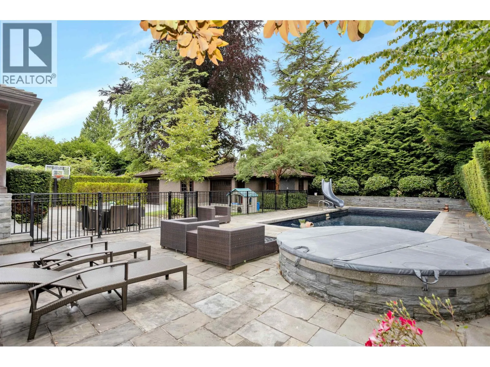 Stunning custom-built residence on a 13,800 sq.ft. lot in the heart of UBC's most prestigious neighbourhood. This 5,800 sq.ft. home showcases impeceable craftsmanship with rich hardwood floors, a gourmet kitchen featuring top-of-the-line European appliances, and spacious living, dining, and office spaces on the main level. Upstairs offers 4 generous bedrooms, including a luxurious primary suite with a large private patio overlooking the beautifully landscaped backyard. Designed for entertaining, the outdoor space boasts an illuminated pool, hot tub, covered patio with built-in BBQ, fridge, roof heaters, and fireplace. The basement includes 3 additional bedrooms, a large rec room, home theatre, wine room, and geothermal heating. (id:27476)