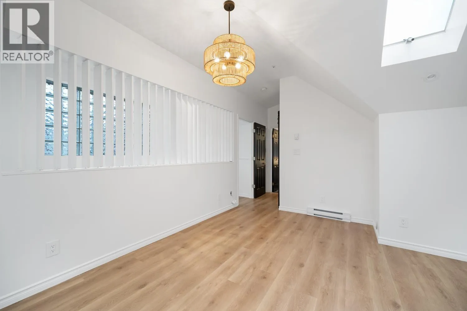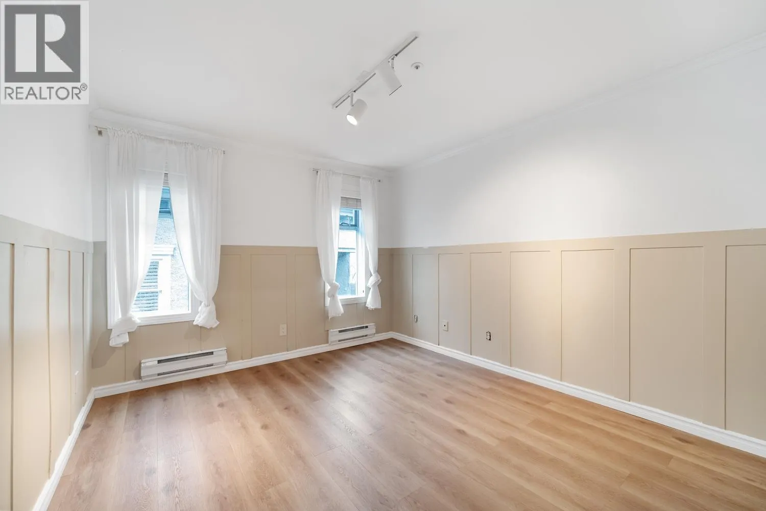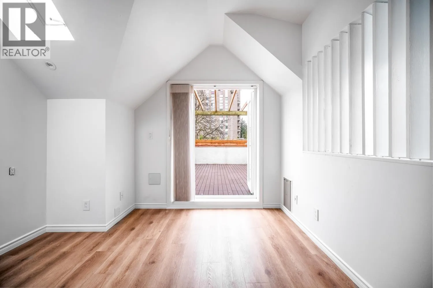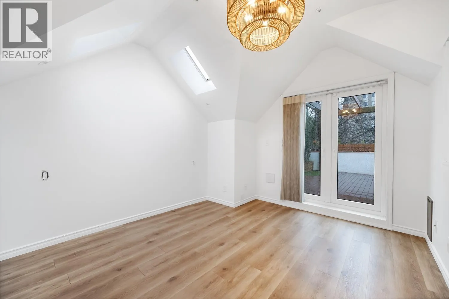 One of a kind! This top-floor, two-level townhouse features concrete and steel-stud construction and a private, oversized roof deck in the heart of the West End. Perched above one of two charming three-flat walk-ups flanking the historic 1904 Thomas Fee heritage house, this home offers a rare blend of character, privacy, and modern living. Part of an intimate boutique 8-unit development, it delivers the ease of strata living with the feel of a detached residence. The main level showcases an open-concept living and dining area with a tranquil, leafy outlook, along with a spacious second bedroom and full bathroom. Upstairs, the stunning primary bedroom retreat will truly wow-featuring new floors, two skylights, a generous bedroom, ensuite bath with skylights, Open House Sat Feb 14 2:00-4:00 (id:27476)