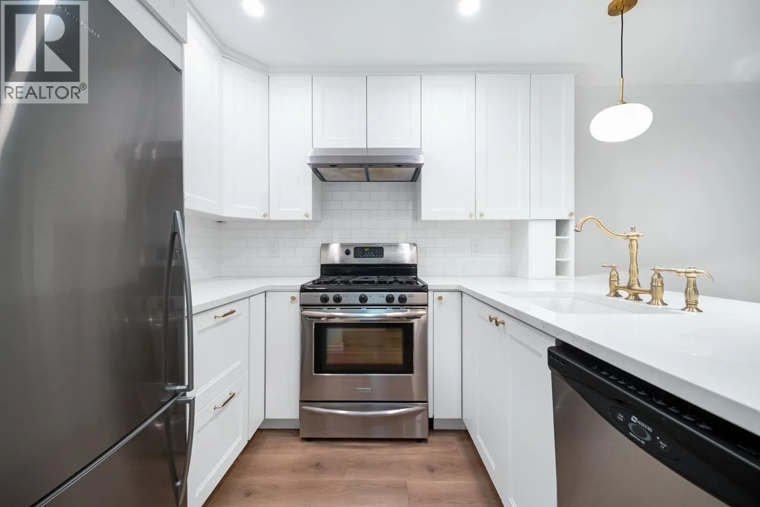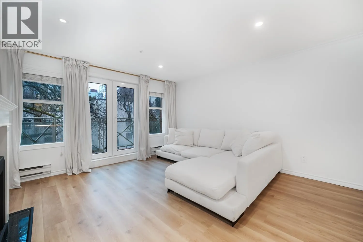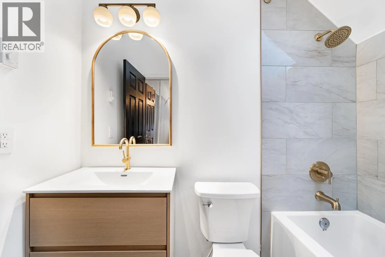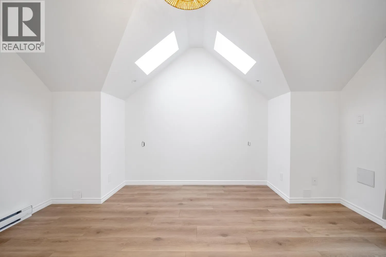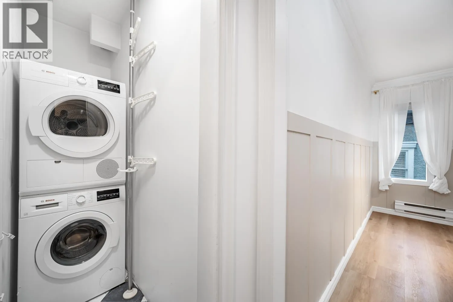One of a kind! This top-floor, two-level townhouse features concrete and steel-stud construction and a private, oversized roof deck in the heart of the West End. Perched above one of two charming three-flat walk-ups flanking the historic 1904 Thomas Fee heritage house, this home offers a rare blend of character, privacy, and modern living. Part of an intimate boutique 8-unit development, it delivers the ease of strata living with the feel of a detached residence. The main level showcases an open-concept living and dining area with a tranquil, leafy outlook, along with a spacious second bedroom and full bathroom. Upstairs, the stunning primary bedroom retreat will truly wow-featuring new floors, two skylights, a generous bedroom, ensuite bath with skylights, Open House Sat Feb 14 2:00-4:00 (id:27476)