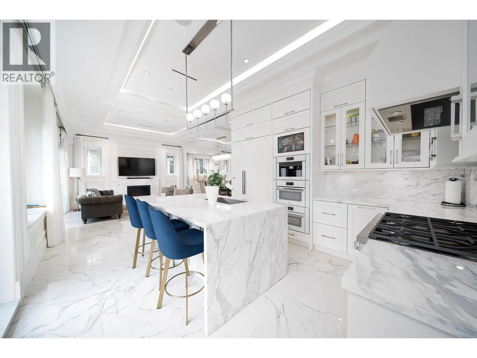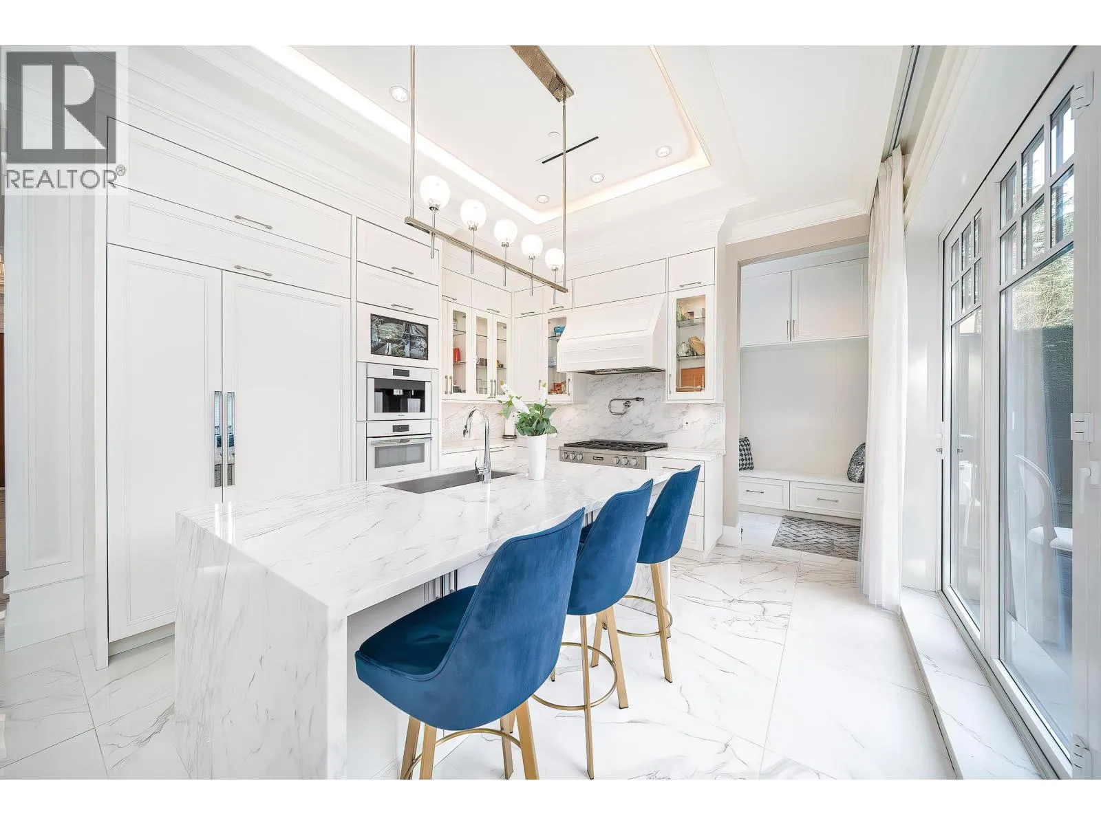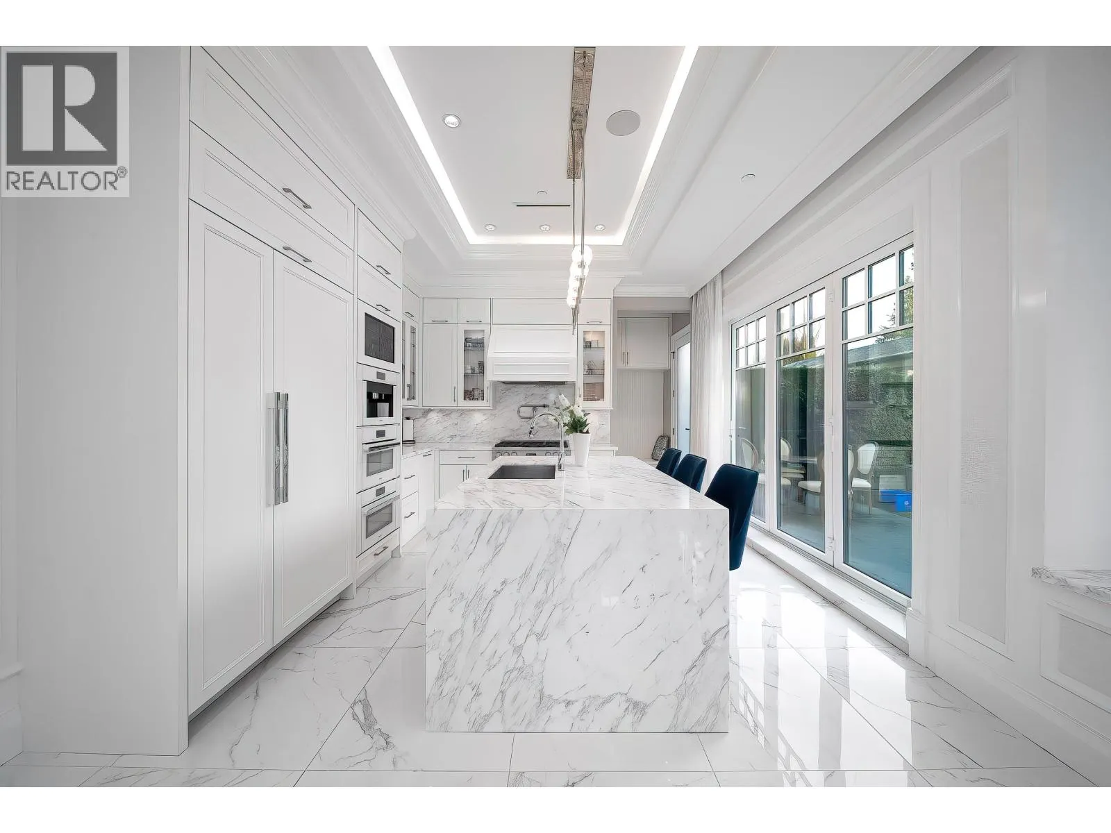 Stunning near-new Kerrisdale home offering 6 bedrooms and 7 bathrooms with a well-designed, spacious layout. Features include high ceilings, premium finishes, and elegant detailing throughout. Gourmet kitchen with high-end appliances and custom cabinetry, ideal for family living and entertaining. Bright living and dining areas open to a beautifully landscaped private backyard. Upstairs offers generous bedrooms with ensuites, including a luxurious primary suite with spa-inspired bathroom and walk-in closet. Fully finished basement provides additional living space. Situated on a rare 60´ lot on a beautiful Kerrisdale street, surrounded by newer luxury homes. Prime location close to Crofton House, Magee Secondary, Kerrisdale shopping, dining, community centre, and parks. (id:27476)