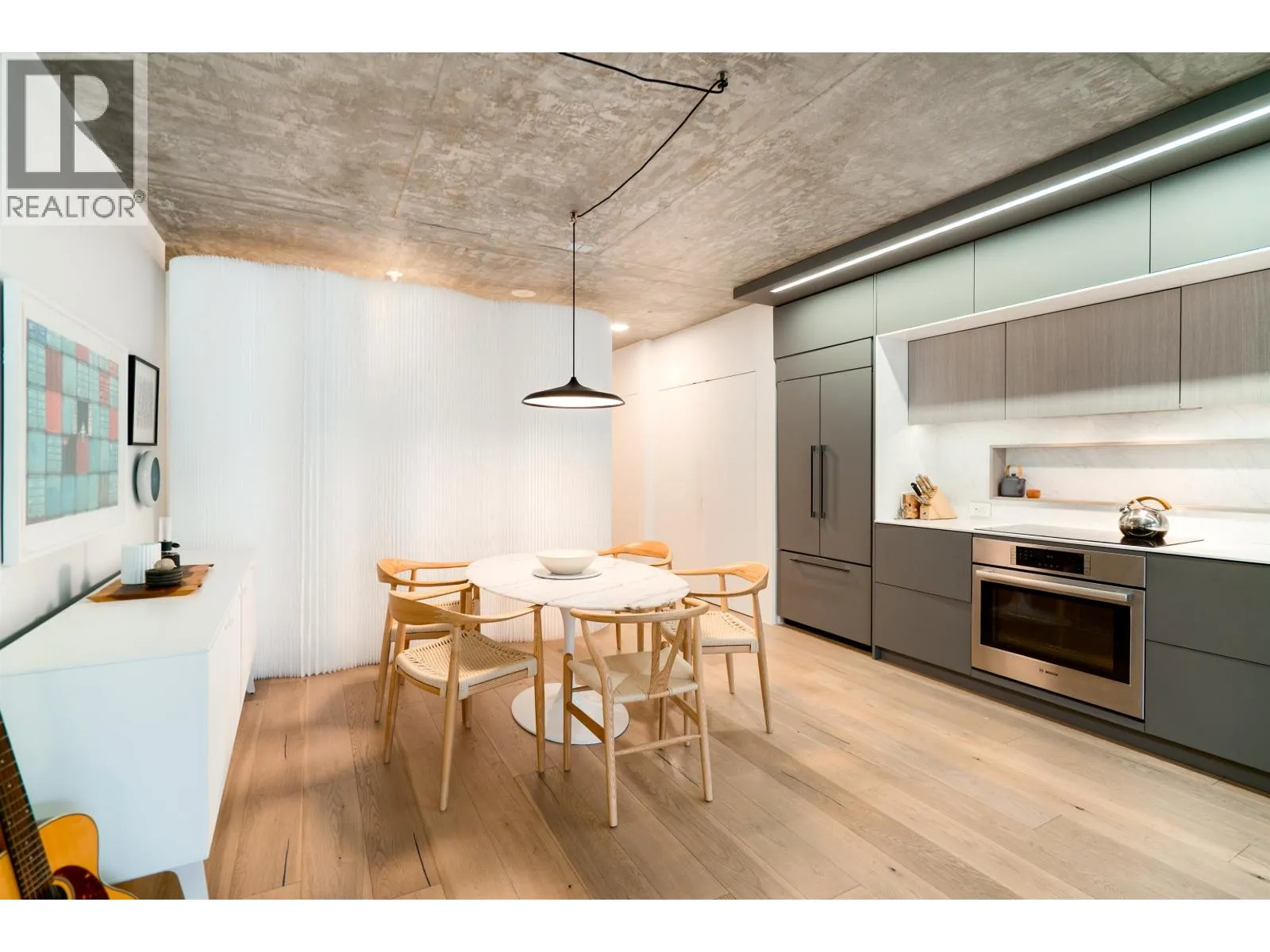 Over 900 sq. ft. of thoughtfully designed space featuring white oak flooring, polished concrete ceilings + floor-to-ceiling windows. The kitchen combines custom solid wood cabinetry with Bosch appliances, flowing seamlessly into the living + dining areas + so great for entertainingOriginally two bedrooms, the second bedroom is currently opened up with a Molo freestanding partition, creating flexible, living options. Custom updates throughout enhance the modern, refined aesthetic. Complete with one parking stall + two storage lockers, this home is located at V6A, between Strathcona + Chinatown on the Union Street bike path..just minutes from downtown, Olympic Village, the Seawall, top restaurants, cafes + the future St. Paul´s Hospital. (id:27476)