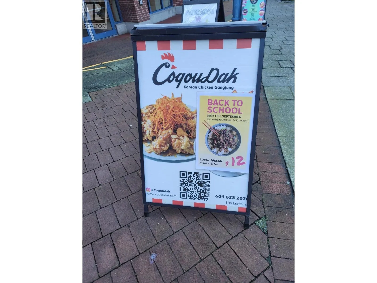 Well-established, profitable take-out fried chicken shop located in the Vancouver Chinatown food court for sale. 2 full commercial ventilation hoods. Monthly rent is approximately $2,750. Lease has 4 years remaining, plus a 5-year renewal option. (Landlord: City of Vancouver) Open 11:00 AM to 8:00 PM (closed Sundays) Perfect for a small family, couple or by yourself alone to operate. Money-making business with easy operations. A very rare opportunity. Contact the listing agent for more information. (id:27476)