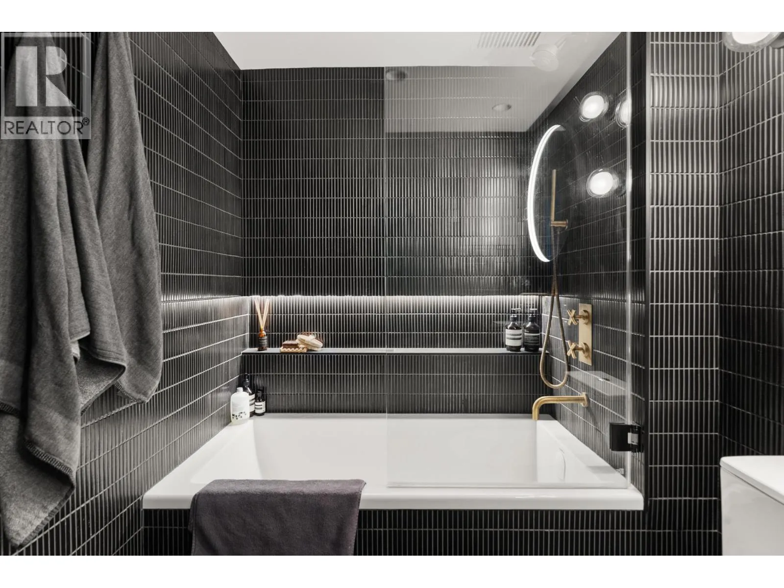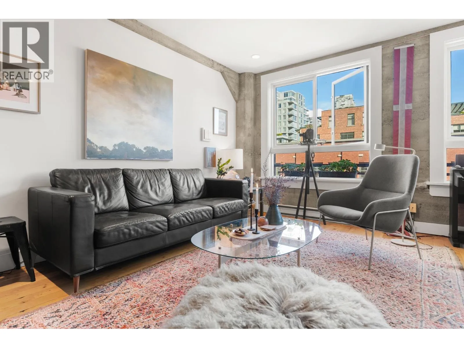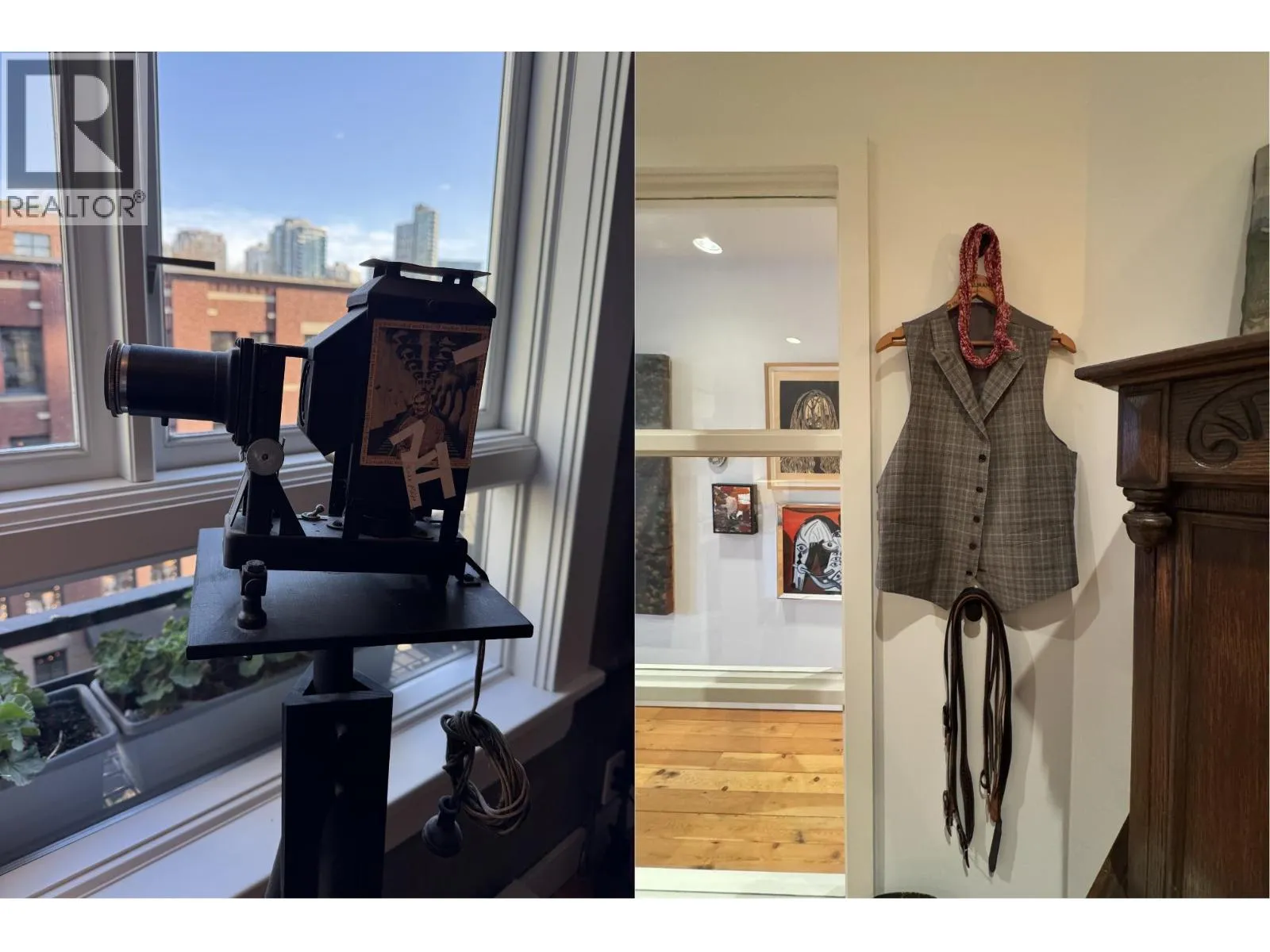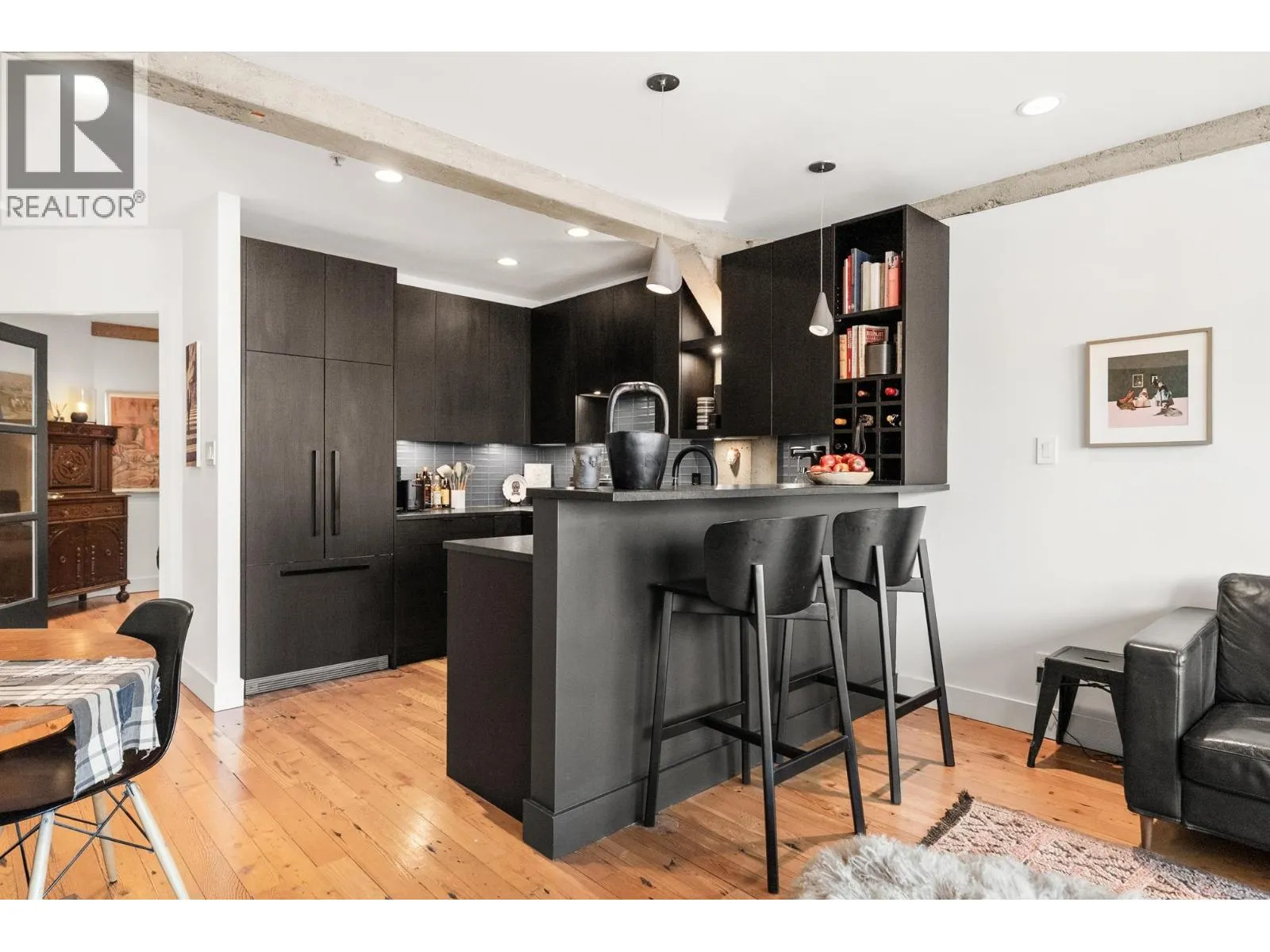 In the rarely available Murchie's building, this l bed l bath 813' home is made for design lovers & architecture buffs. Renovated in 2024, it features original wood floors, oversized heritage windows & exposed concrete beams. The custom kitchen features solid wood cabinetry, granite counters & statement Bocci pendants that anchor the space. The bathroom is equally dialed-in with black tiles, Americh tub & Duravit toilet & sink delivering a refined, spa-like feel without losing the raw character. The living & dining areas flow seamlessly & every detail leans into that modern heritage aesthetic that's hard to find and even harder to recreate. The rooftop deck is a true lifestyle feature & very rare in this building is the 1 secure parking spot included: GOLD in this neighbourhood! (id:27476)