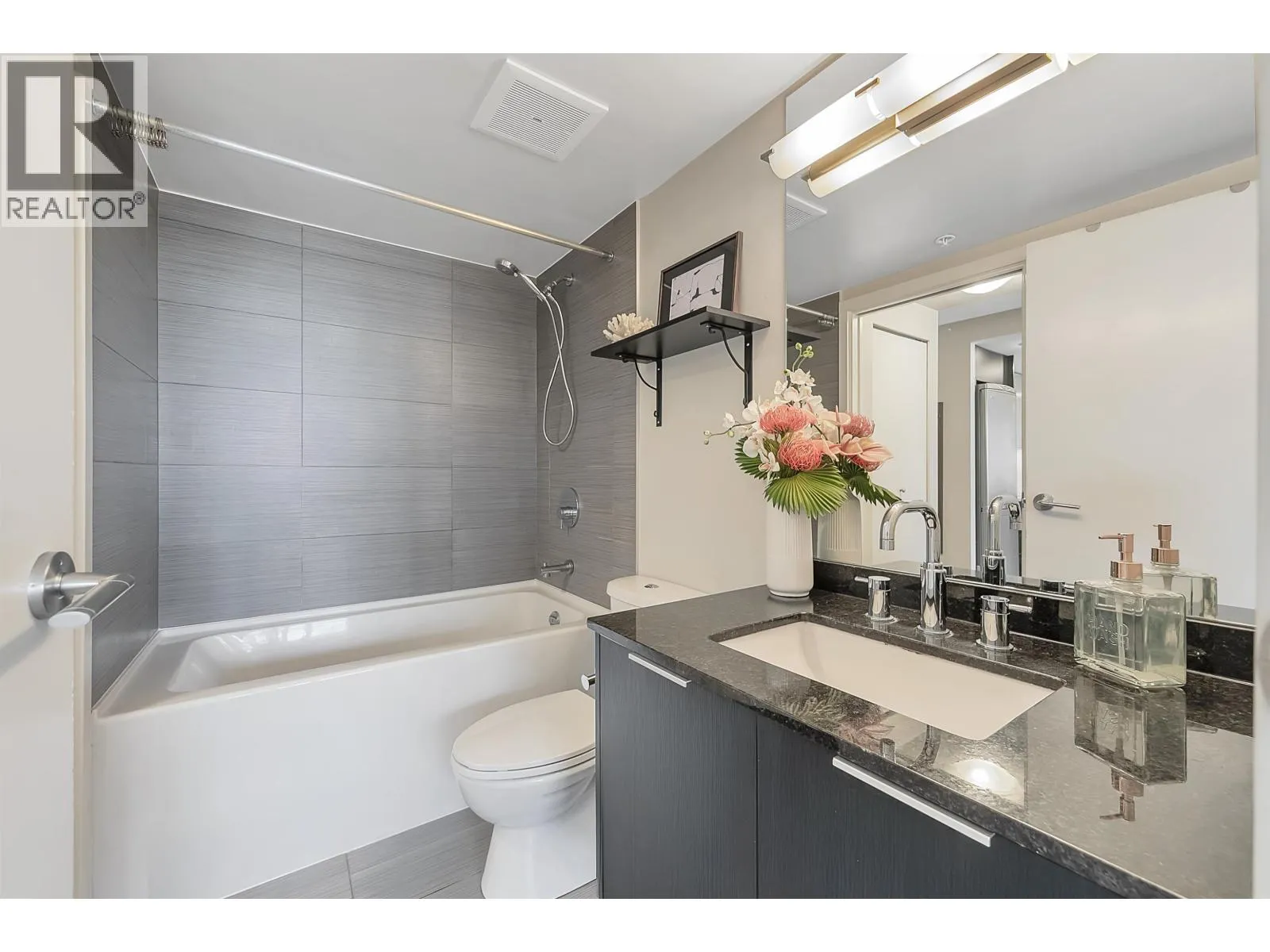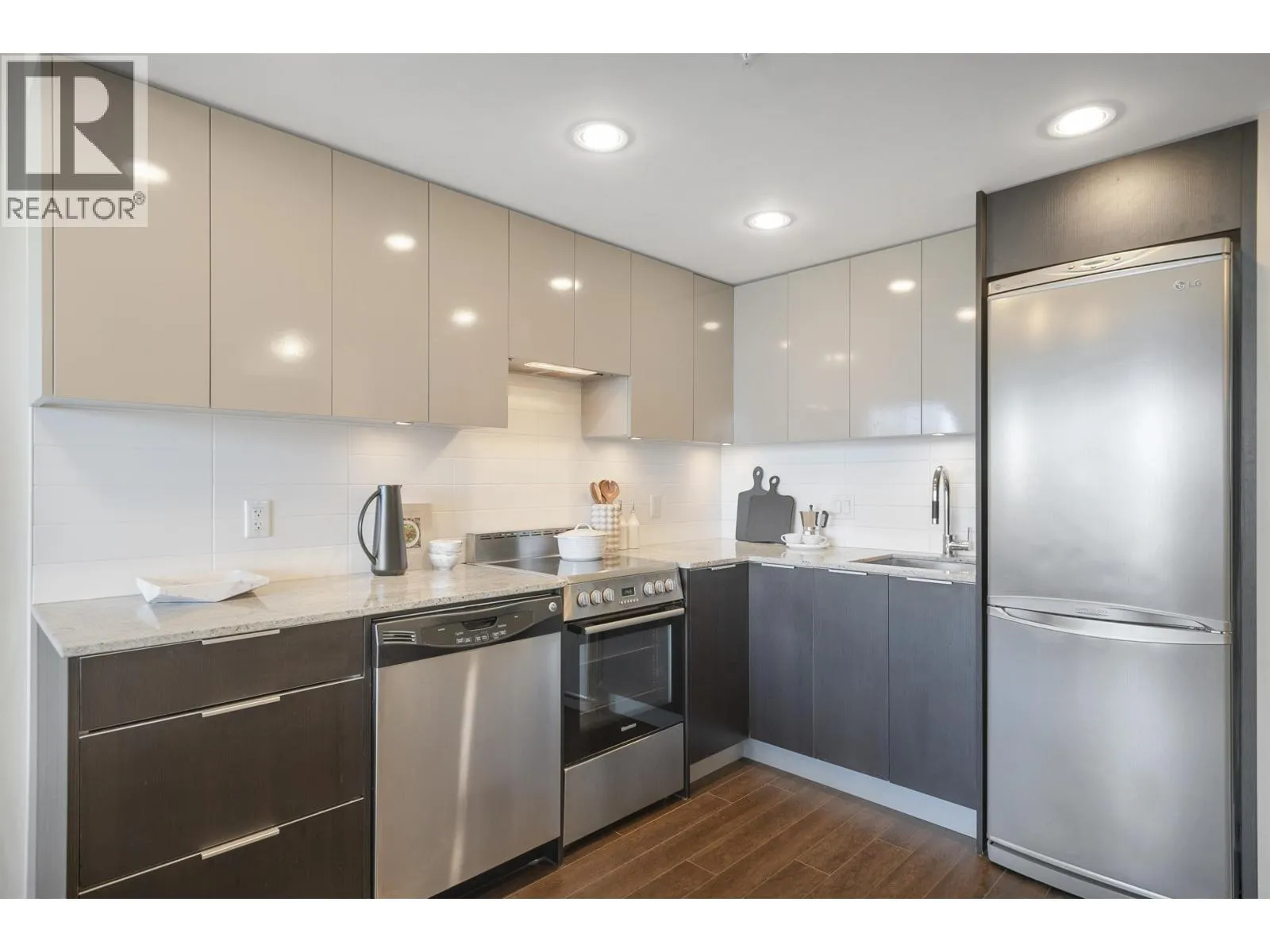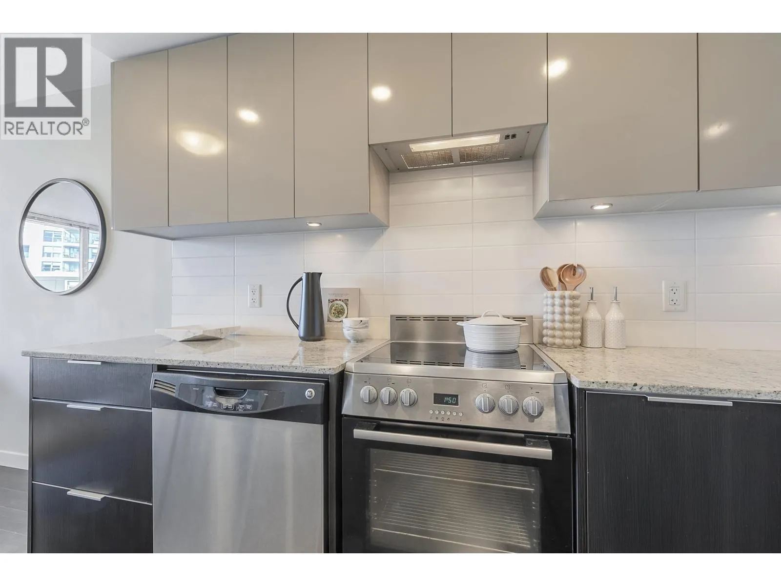 Discover the best of urban living at Maynards Block, a premier concrete building in the heart of Olympic Village. This bright, east-facing 1-bedroom plus den features a functional open-concept layout with engineered hardwood, granite countertops, and premium stainless steel appliances. The home offers a spacious private balcony and generous in-suite storage. Residents enjoy luxury amenities including a fitness center, yoga studio, concierge, and common garden plots. Located just steps from the Seawall and only 2 minutes from the Olympic Village Skytrain station, you have effortless access to the Canada Line, Millennium Line, and UBC. Perfectly positioned near top-tier dining and shops, this home is an ideal choice for both owners and investors. (id:27476)