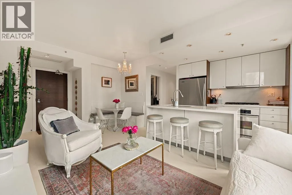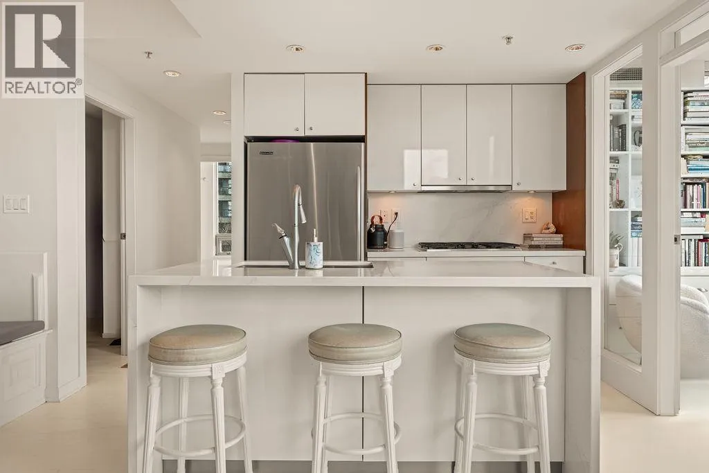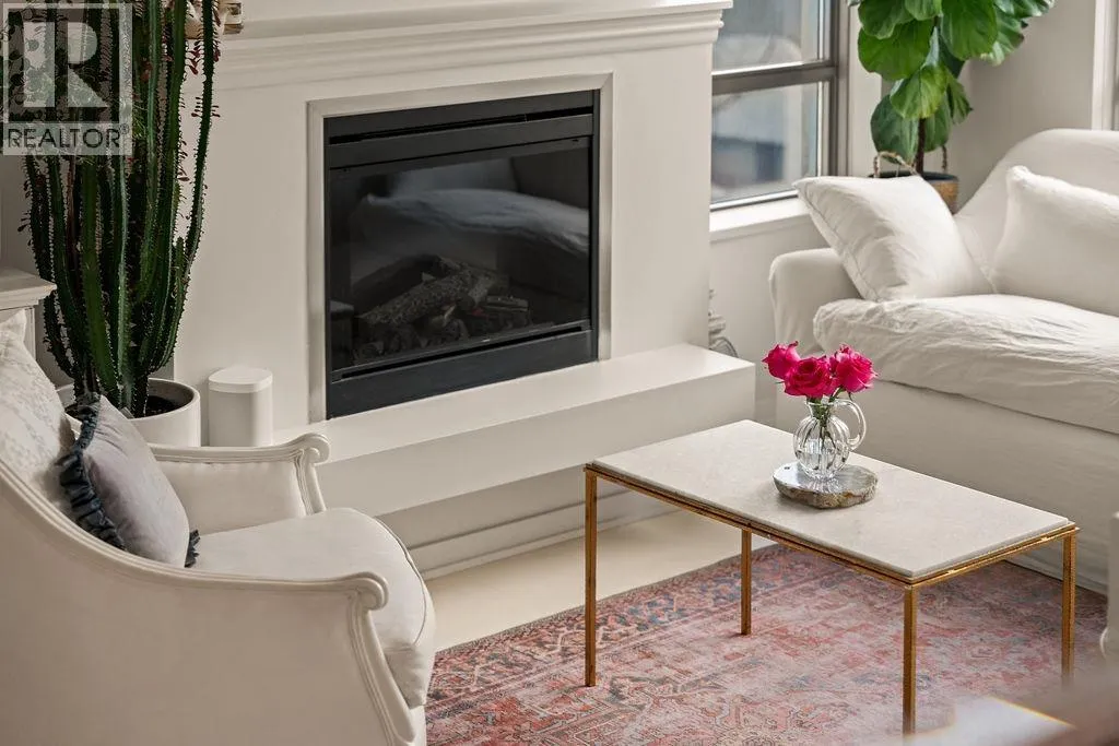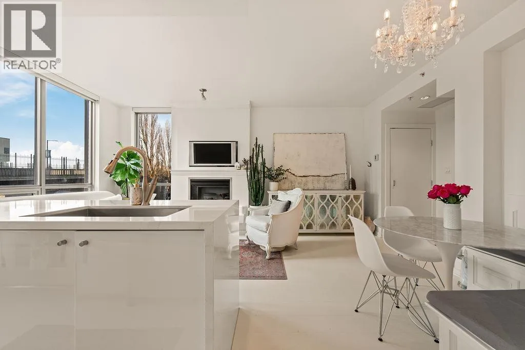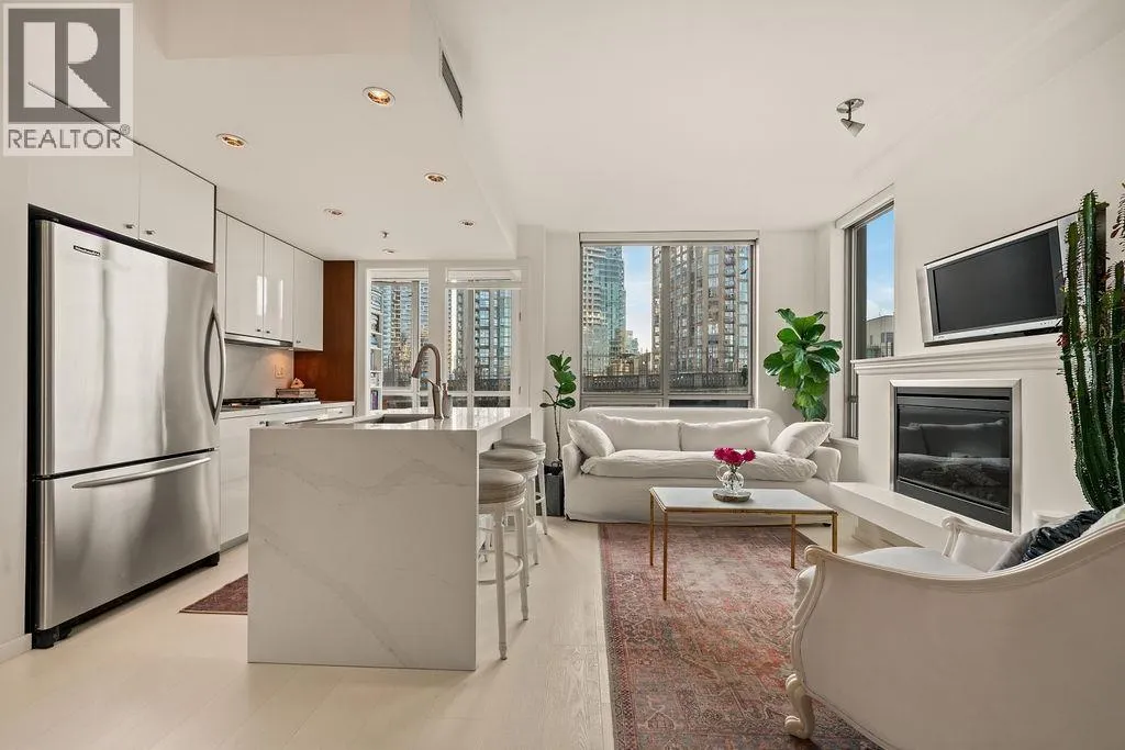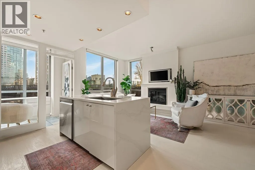 Experience refined coastal living at Alvar, in sought-after BEACH DISTRICT! This beautifully renovated 1 BED + DEN home offers an elegant, open-concept layout in one of the BEST BUILDINGS in the area. Expansive windows flood the space with natural light, complementing the airy 9-foot ceilings and the sophisticated white interior feels warm, welcoming & effortlessly timeless! Storage is abundant with a huge pantry and storage locker. The den/office with built-ins creates the perfect work-from-home retreat. Cozy fireplace anchors the living space, adding charm & comfort. A/C, 1 parking and pet-friendly (2 pets), it's a dream! Building amenities include a BBQ, Gym, Media Room, Hot Tub.Every detail has been carefully curated, resulting in a space that feels elevated, serene, and move-in ready. (id:27476)