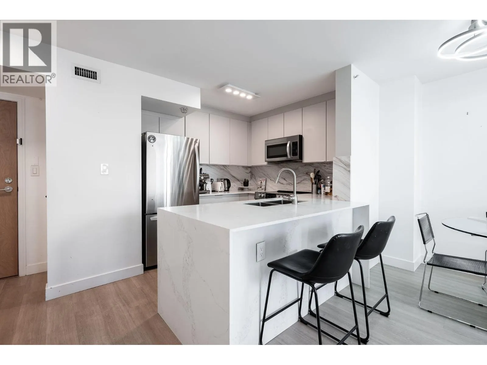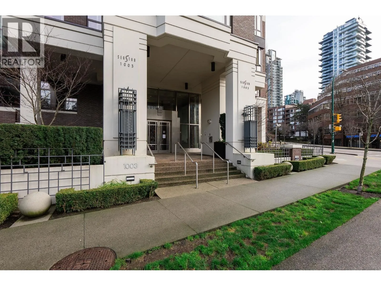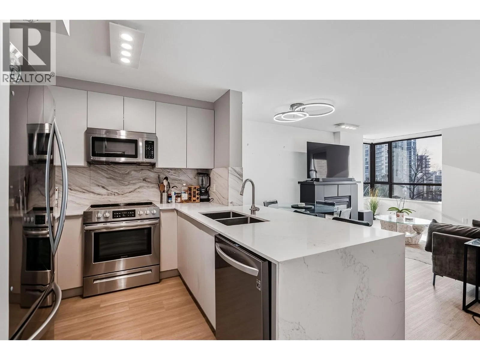 STUNNING FULLY RENOVATED extra-large 1 bed, 1 bath + den + solarium in this highly sought-after, Bosa-built concrete high-rise! Complete top-to-bottom renovation - nothing left untouched. GORGEOUS kitchen with high-end EuroRite cabinetry, quartz countertops & elegant marble backsplash. LUXURIOUS bathroom with heated tile floors for year-round comfort & deep soaker tub. Beautiful LVP flooring throughout, updated lighting & all new appliances & fixtures. Custom closets maximize every inch of space. Solid concrete construction means peace & quiet in your urban retreat. UNBEATABLE LOCATION directly across from Sunset Beach - enjoy walking the sea wall, stunning sunsets & the best of downtown living steps from your door. This is move-in ready perfection. One parking. Pets OK! Don´t miss it! (id:27476)