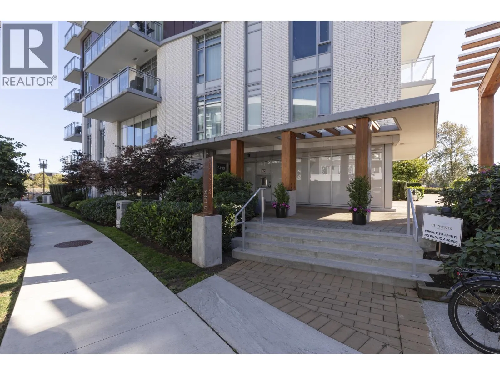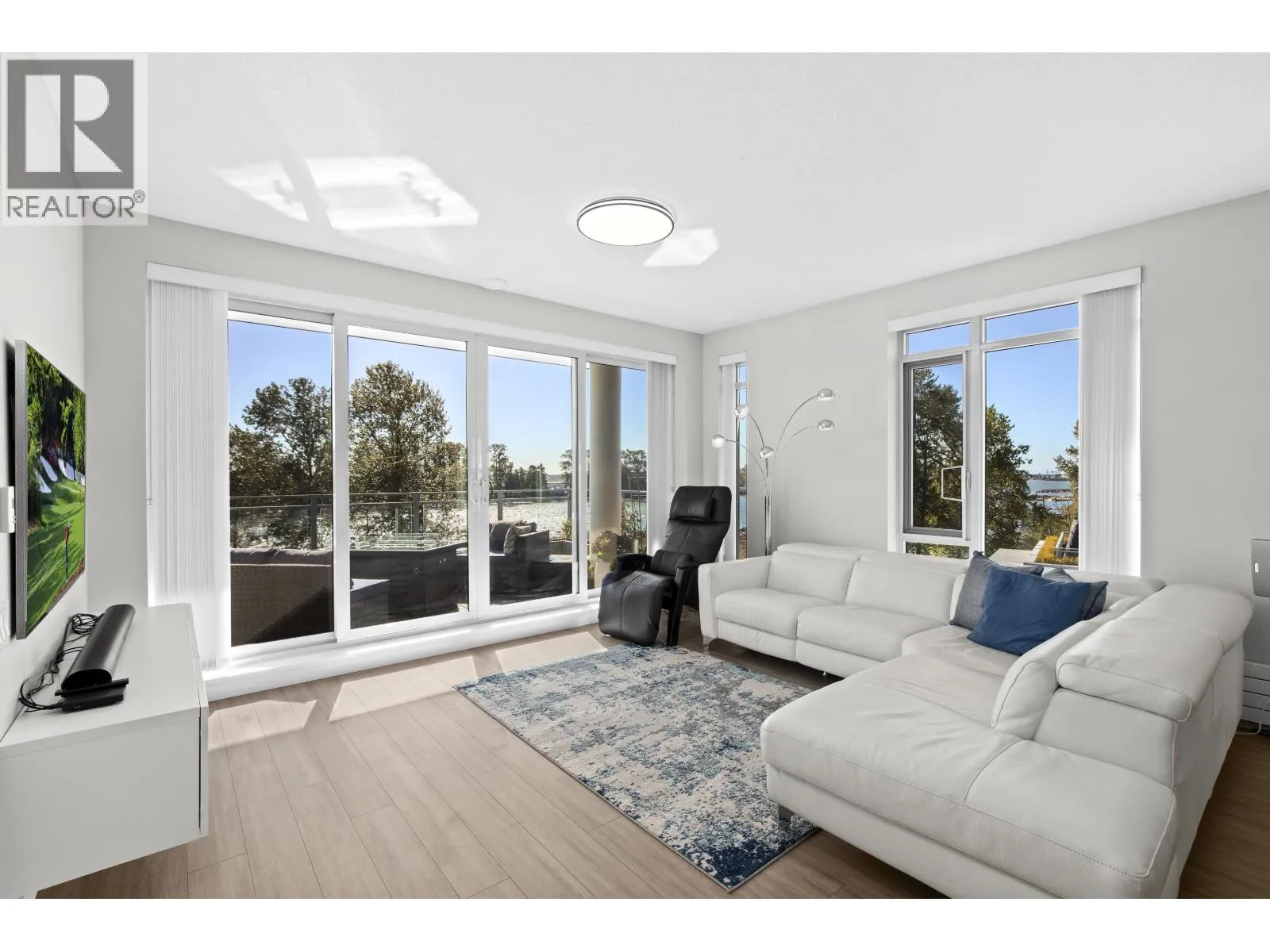 Indulge in breathtaking 180° water views from this pristine corner home, with a perfect vantage to revel in the outlook of the Fraser River from every room. Spanning a generous 1,138 sqft, discover 2 bedrooms, 2 full baths, & a dedicated office. Relish in the chef-inspired kitchen showcasing a gas stove, high-end Bosch appliances, & a vast island - perfect for entertaining. The primary suite promises relaxation with its walk-in closet & resort-style ensuite. Admire the architectural beauty of over-height ceilings & an open, airy design. Embrace outdoor living with a 200 sqft South-facing balcony. Enjoy unmatched conveniences: an exclusive storage room on your floor & 2 parking spaces (1 EV). Walk the waterfront trails & enjoy the nearby shops & restaurants. (id:27476)