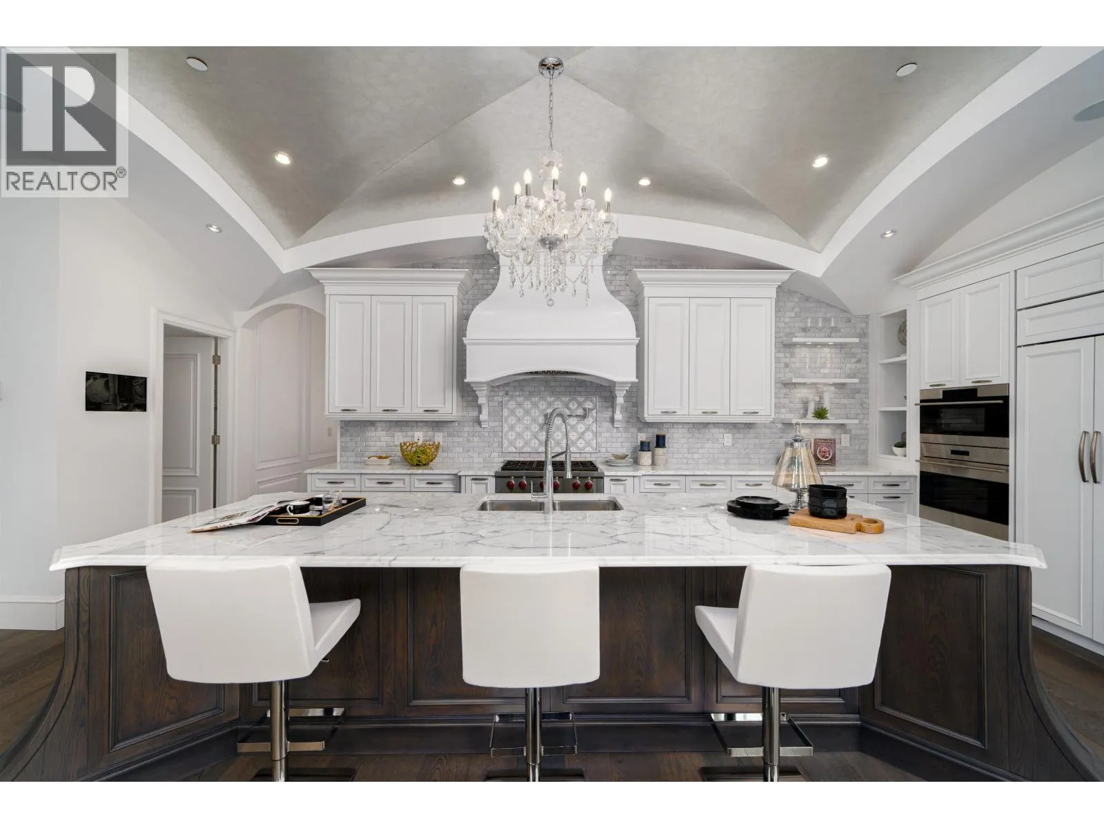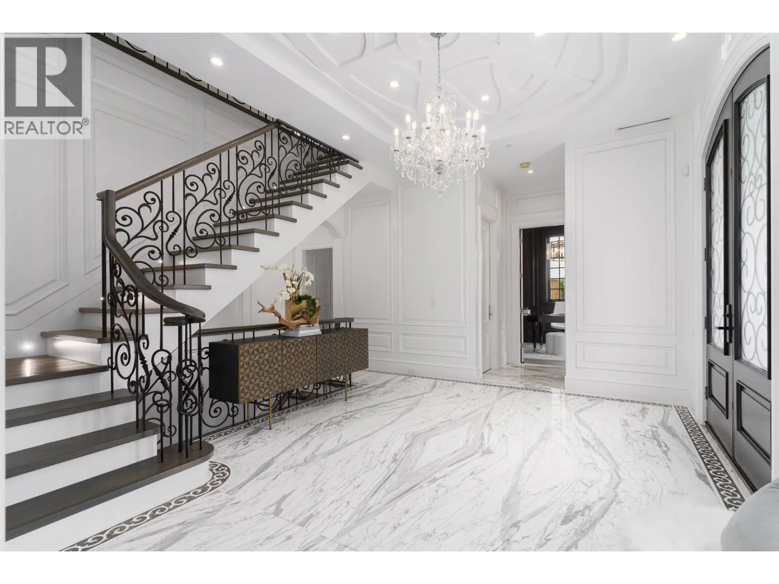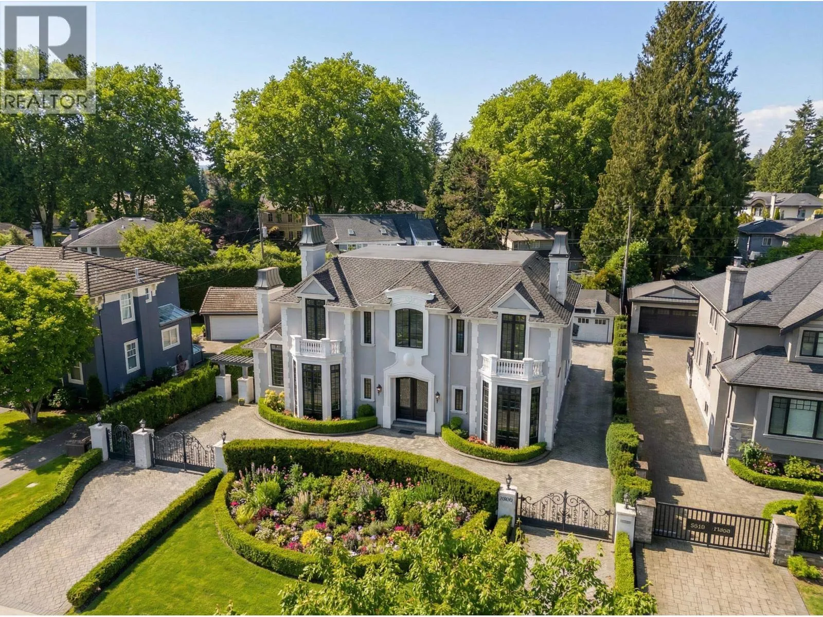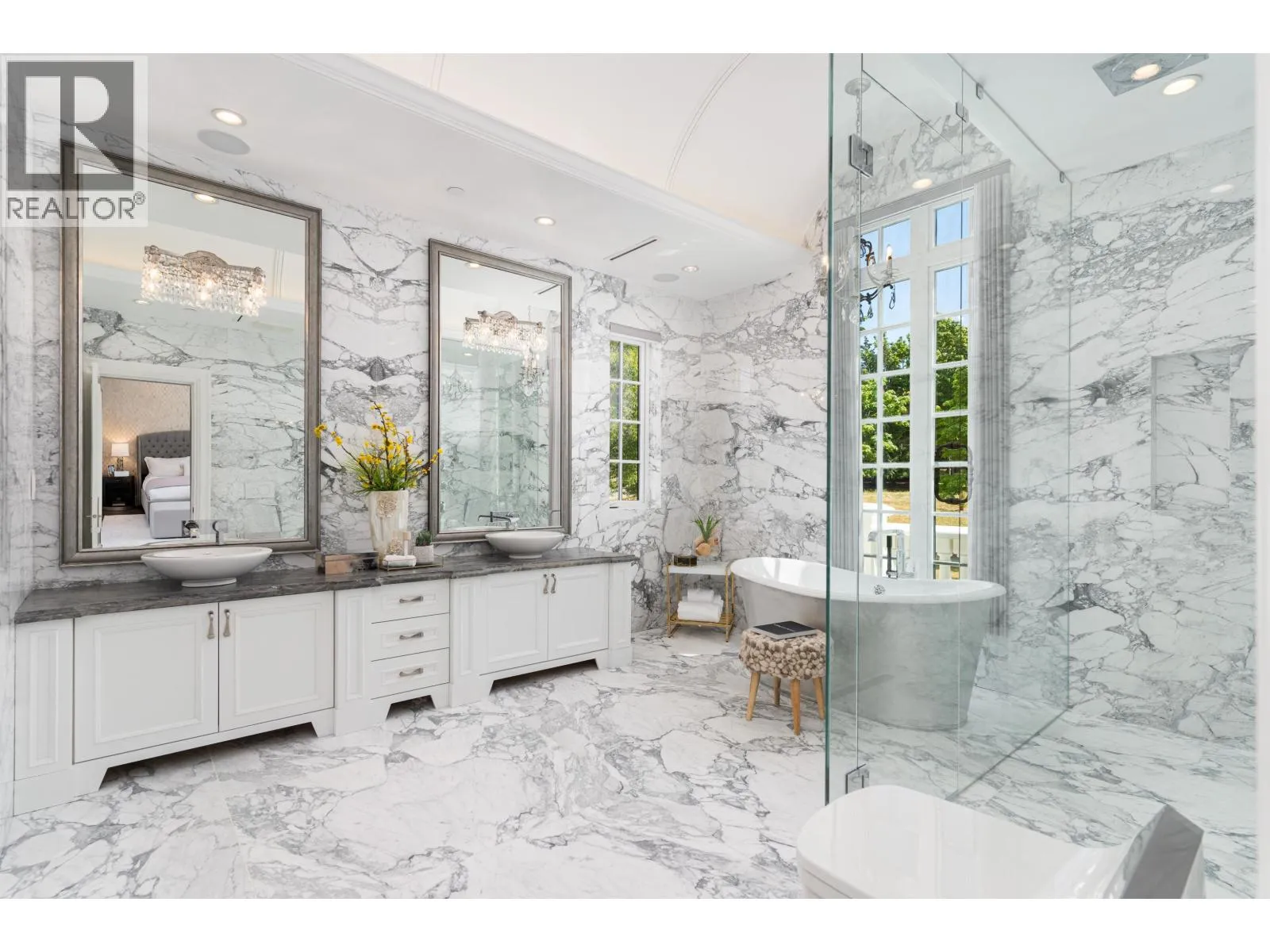 Château de Bellevue - An exquisite, world-class mansion in Southwest Marine that seamlessly blends elegance with class. Stunning statuario marble finishes with waterjet inlay details, European hand-made lead glass ceiling, custom silver-leafed pressed groin-vaulted ceiling, full indoor SPA, including a pool, jacuzzi, steam room, sauna, and gym. Custom-built 12-person theatre, chef's kitchen with WOLF Range & Sub Zero appliances, wok kitchen with WOLF Range, custom curved stained white oak pedestal island, 500 bottle wine cellar, full bar, 4-Car garage, Control 4 Home Smart System, wrap-around auto-court, exterior clad limestone custom moulding, custom maple cabinetry, all bedrooms ensuited, two laundry rooms, 4-Bed, 7-Bath, 5,900sqft. You can feel the quality of the finishes as you walk through Château de Bellevue - Welcome home. (id:27476)