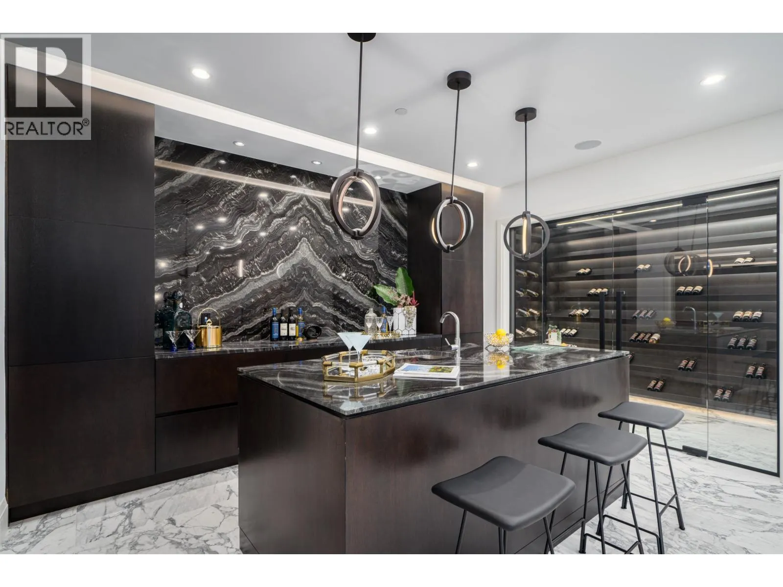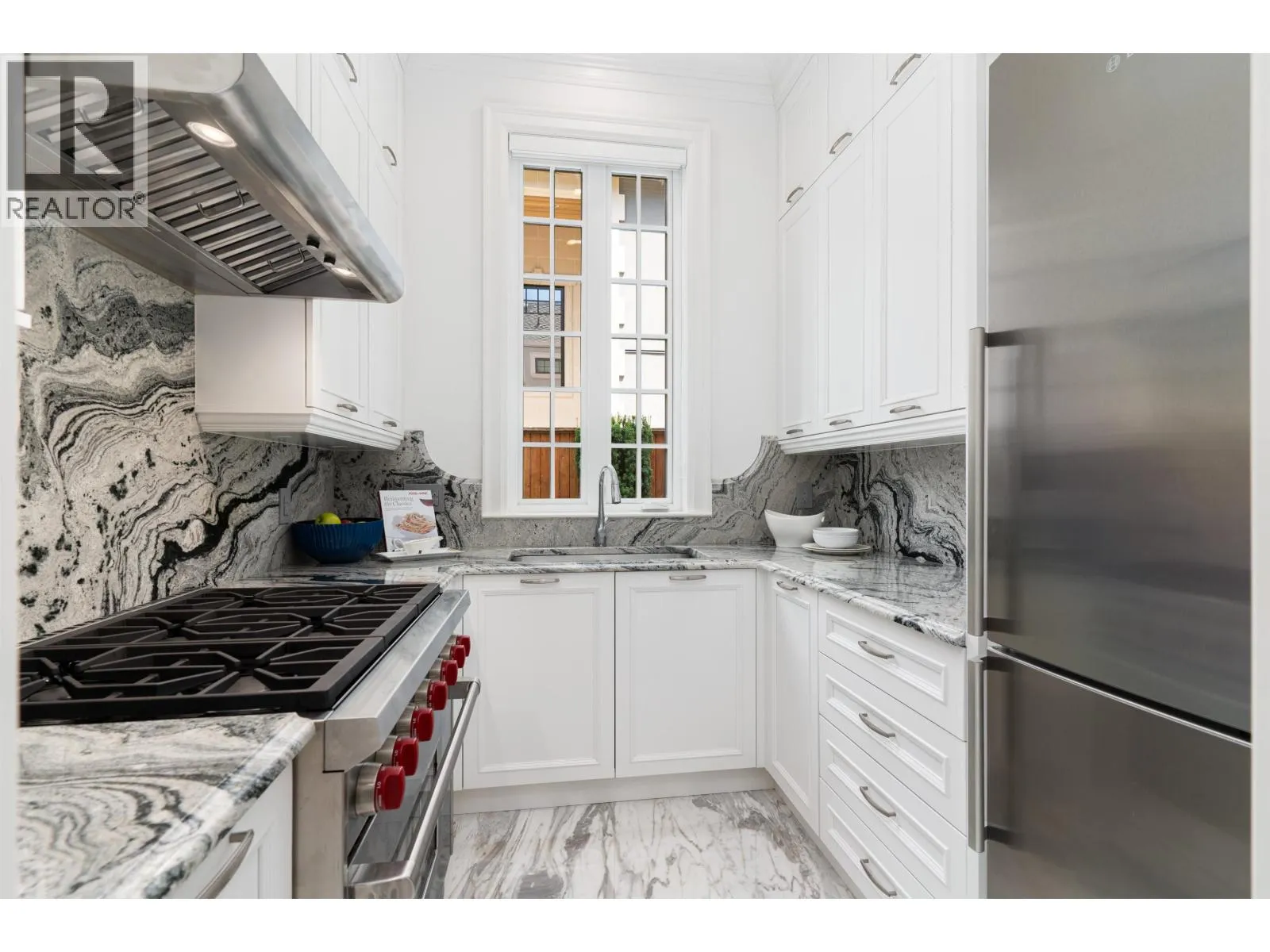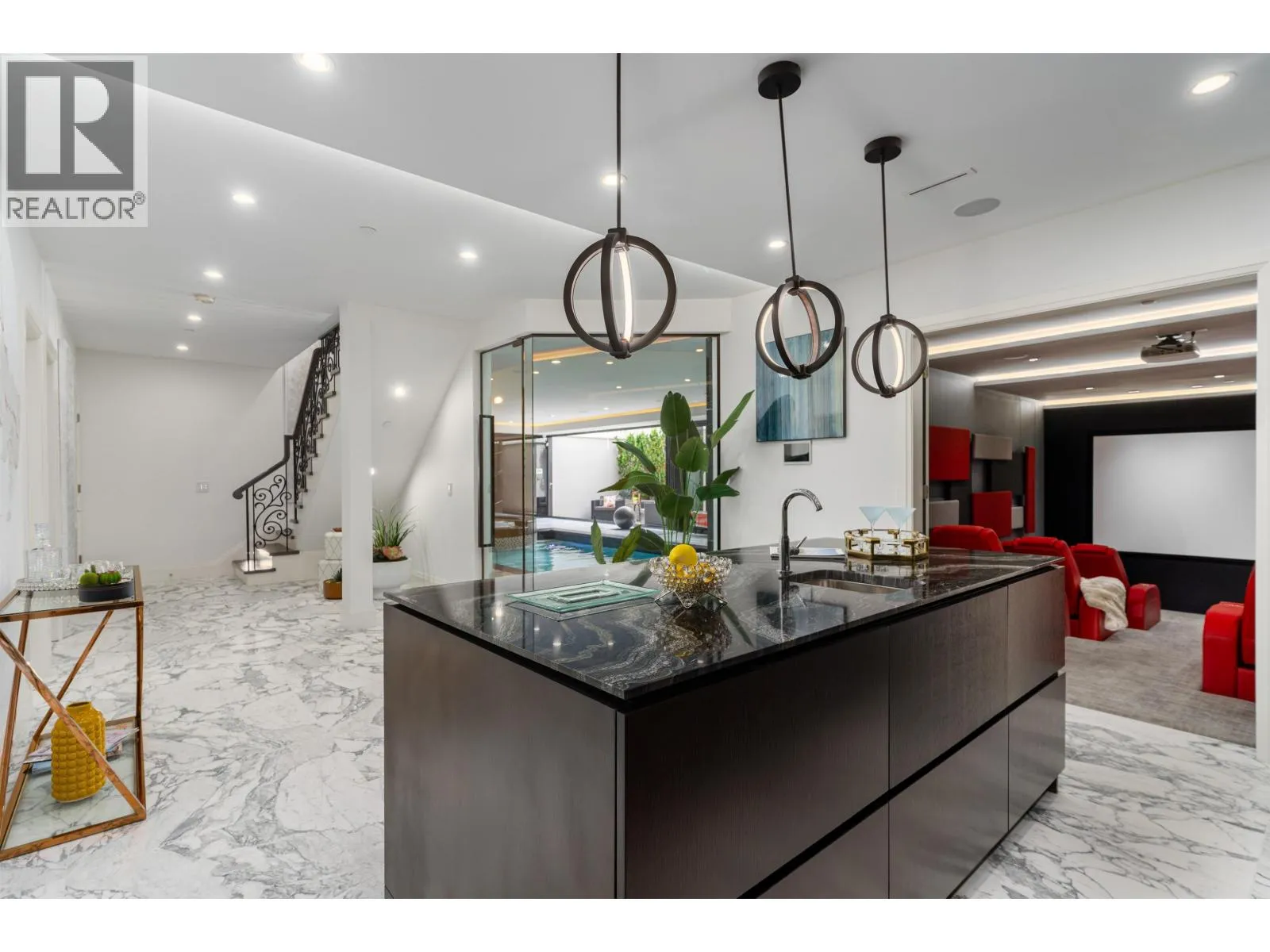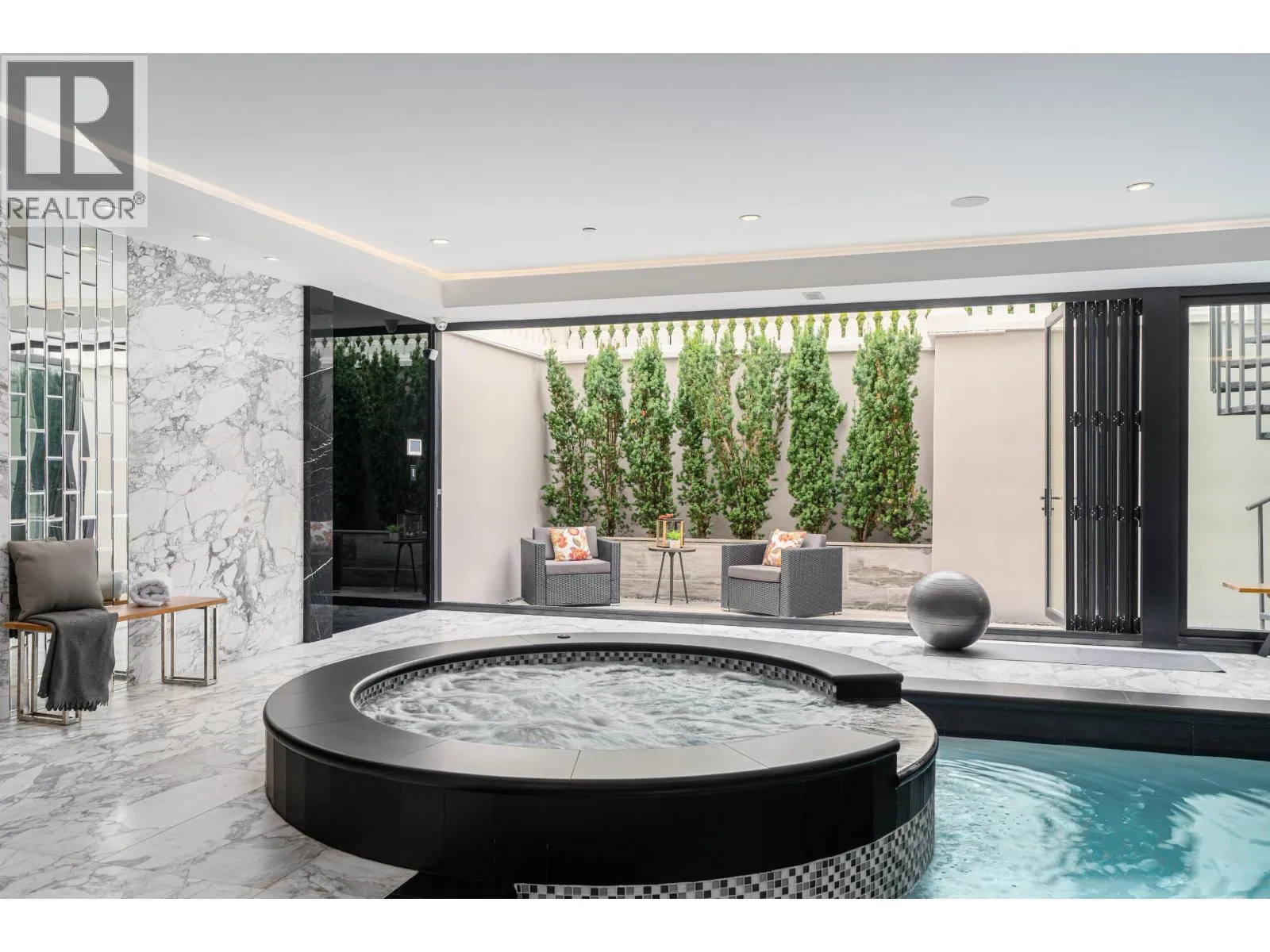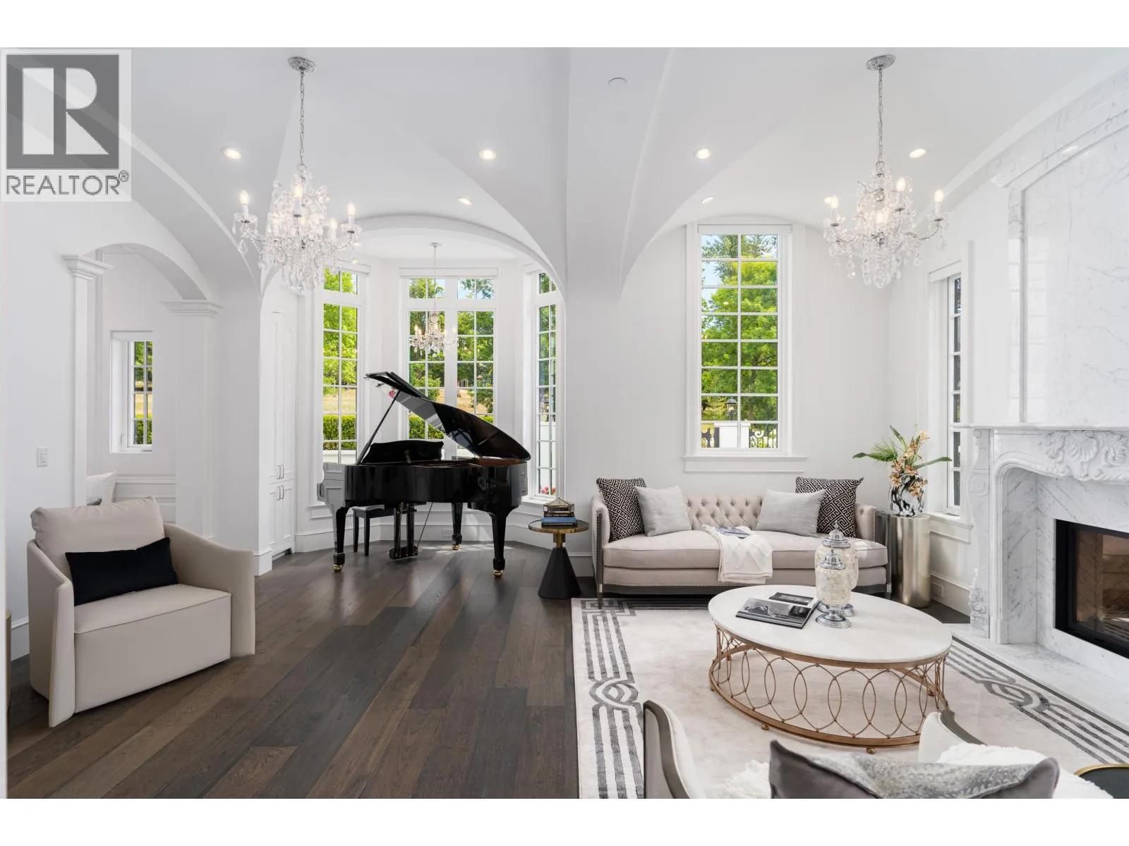 Château de Bellevue - An exquisite, world-class mansion in Southwest Marine that seamlessly blends elegance with class. Stunning statuario marble finishes with waterjet inlay details, European hand-made lead glass ceiling, custom silver-leafed pressed groin-vaulted ceiling, full indoor SPA, including a pool, jacuzzi, steam room, sauna, and gym. Custom-built 12-person theatre, chef's kitchen with WOLF Range & Sub Zero appliances, wok kitchen with WOLF Range, custom curved stained white oak pedestal island, 500 bottle wine cellar, full bar, 4-Car garage, Control 4 Home Smart System, wrap-around auto-court, exterior clad limestone custom moulding, custom maple cabinetry, all bedrooms ensuited, two laundry rooms, 4-Bed, 7-Bath, 5,900sqft. You can feel the quality of the finishes as you walk through Château de Bellevue - Welcome home. (id:27476)