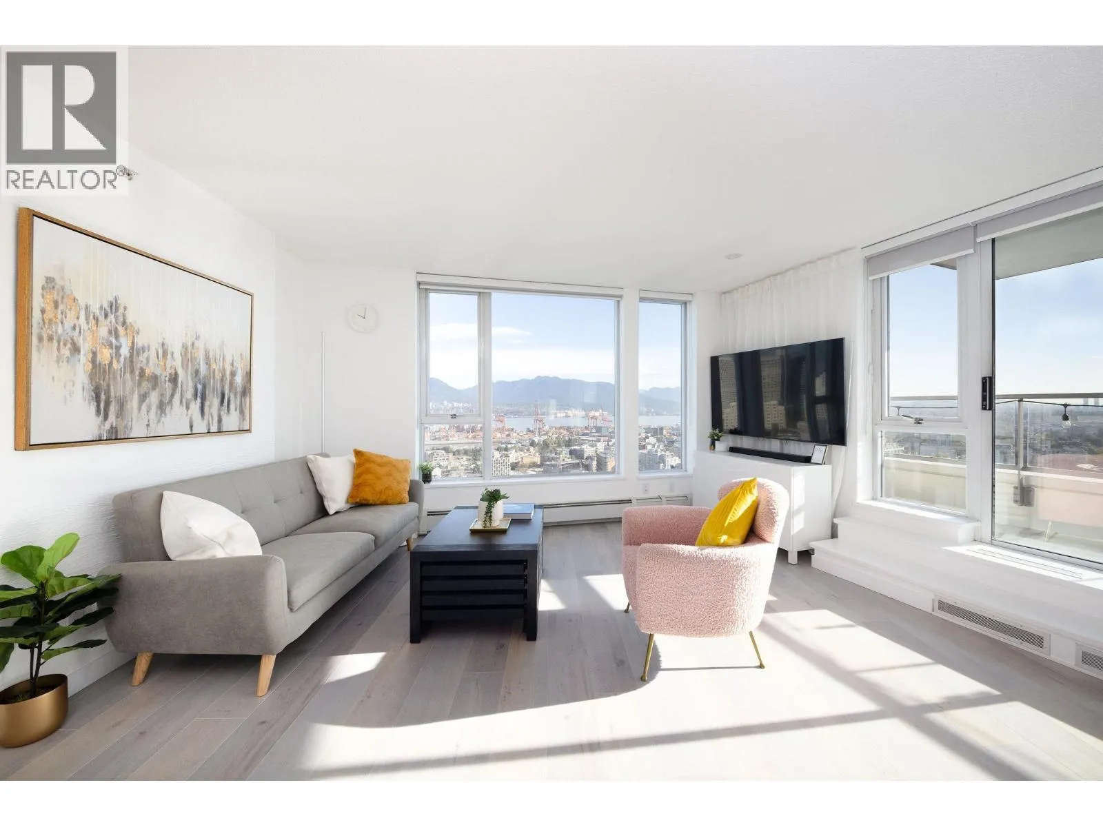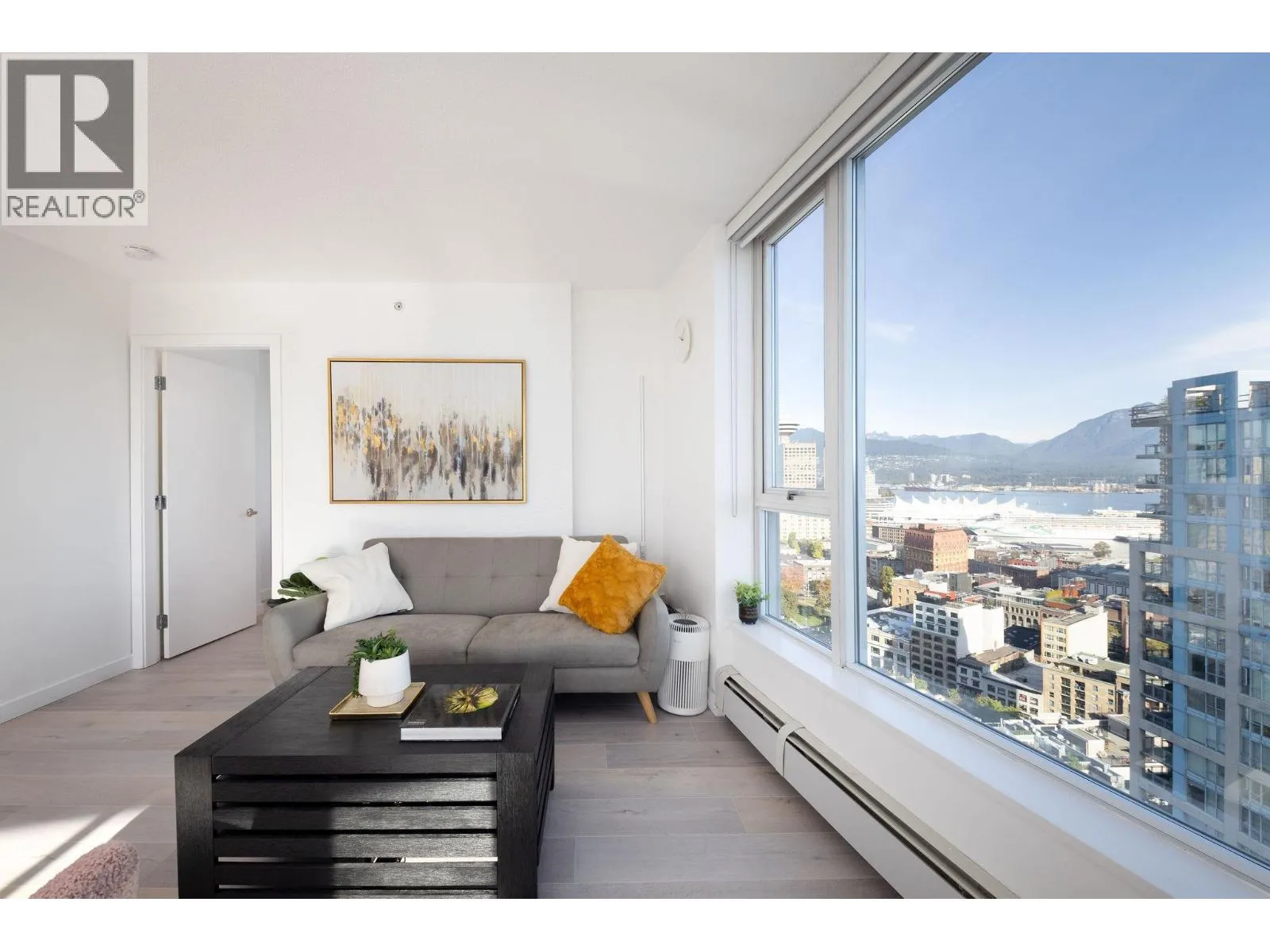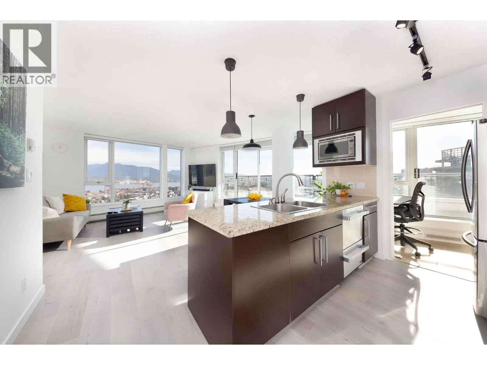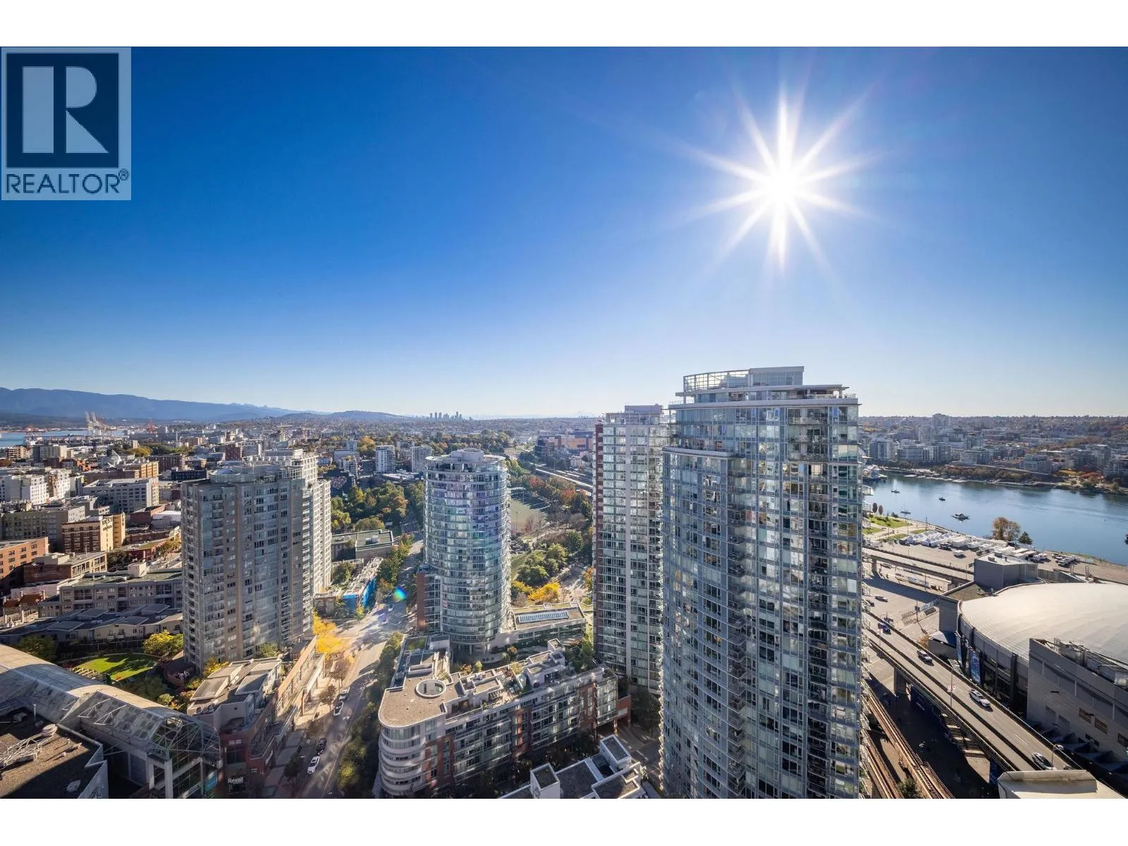 Spectacular trophy sub-penthouse home with uninterrupted 180 degree views all the way from Stanley Park to Olympic Village and beyond. Two spacious bedrooms PLUS den AND office are complemented by a massive covered balcony. One of the largest units in the building, you'll experience spectacular views from the spacious kitchen, living space as well as both bedrooms. 2 Parking + Storage Locker + Bike Locker. Heating included in maintenance fee. Amenities includes: Concierge, Indoor Pool, Hot Tub, Sauna, Gym, Theatre Room. Steps to Costco, Rogers Arena, T&T, Starbucks, Restaurants, Andy Livingstone Park and Seawall. (id:27476)
