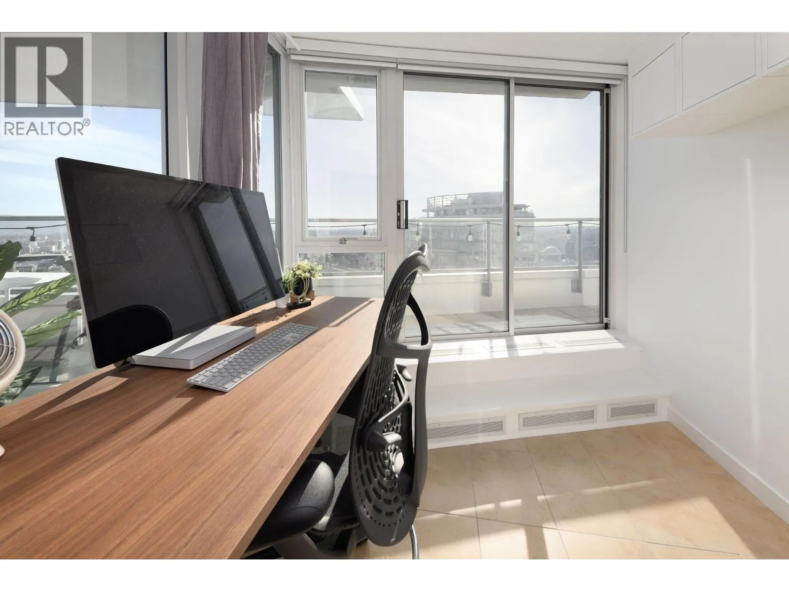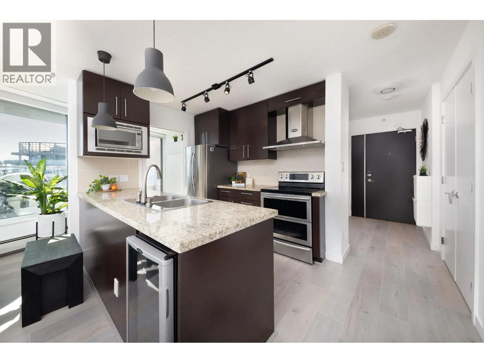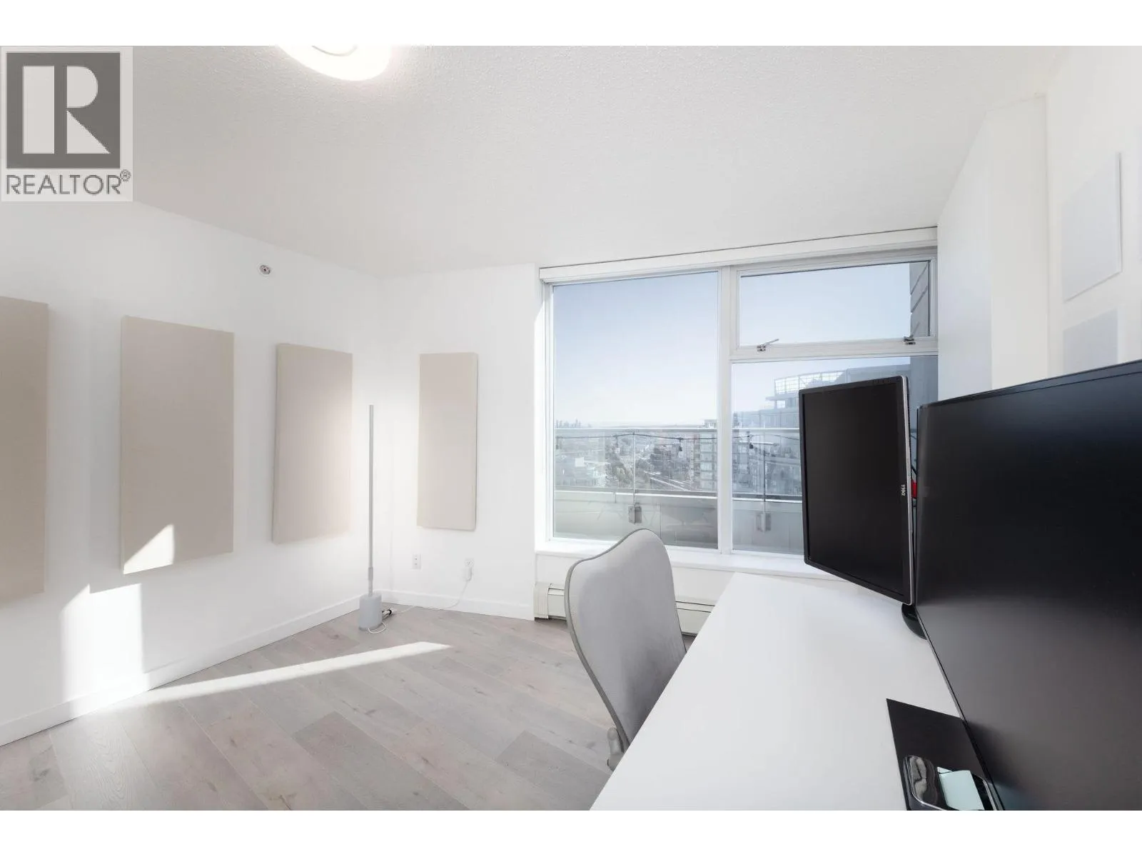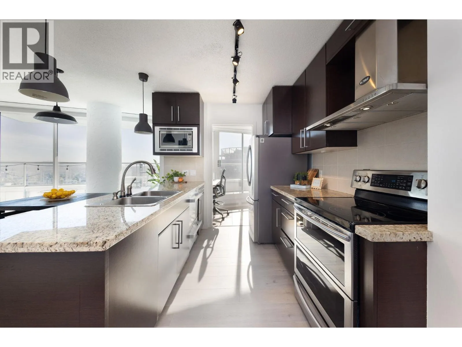 Spectacular trophy sub-penthouse home with uninterrupted 180 degree views all the way from Stanley Park to Olympic Village and beyond. Two spacious bedrooms PLUS den AND office are complemented by a massive covered balcony. One of the largest units in the building, you'll experience spectacular views from the spacious kitchen, living space as well as both bedrooms. 2 Parking + Storage Locker + Bike Locker. Heating included in maintenance fee. Amenities includes: Concierge, Indoor Pool, Hot Tub, Sauna, Gym, Theatre Room. Steps to Costco, Rogers Arena, T&T, Starbucks, Restaurants, Andy Livingstone Park and Seawall. (id:27476)