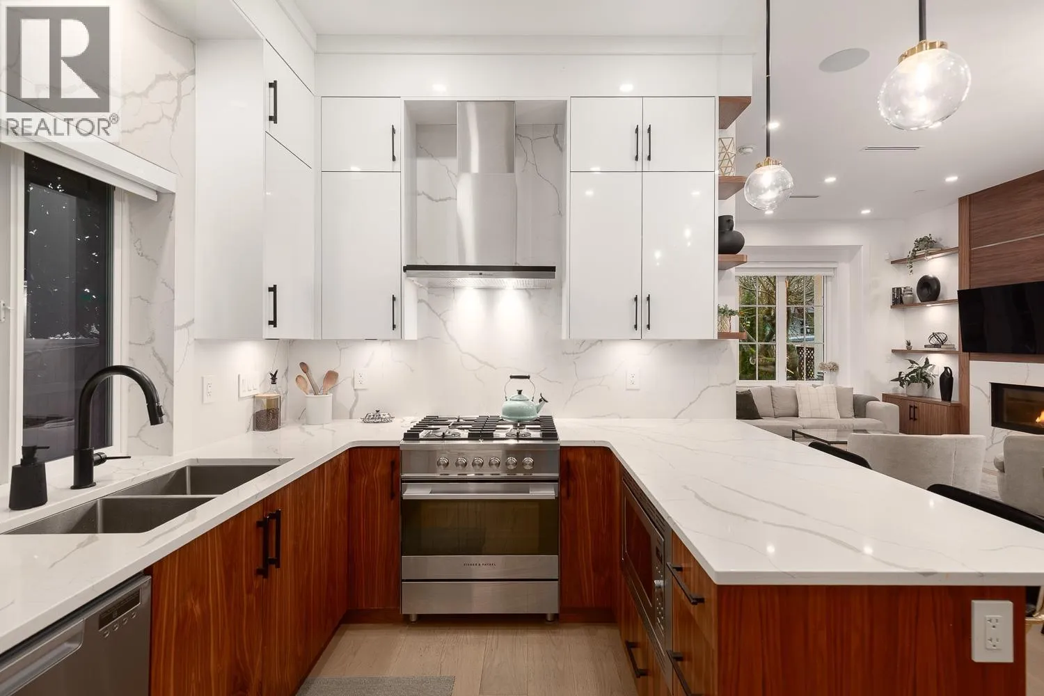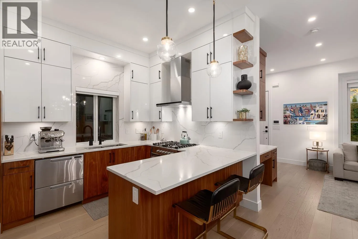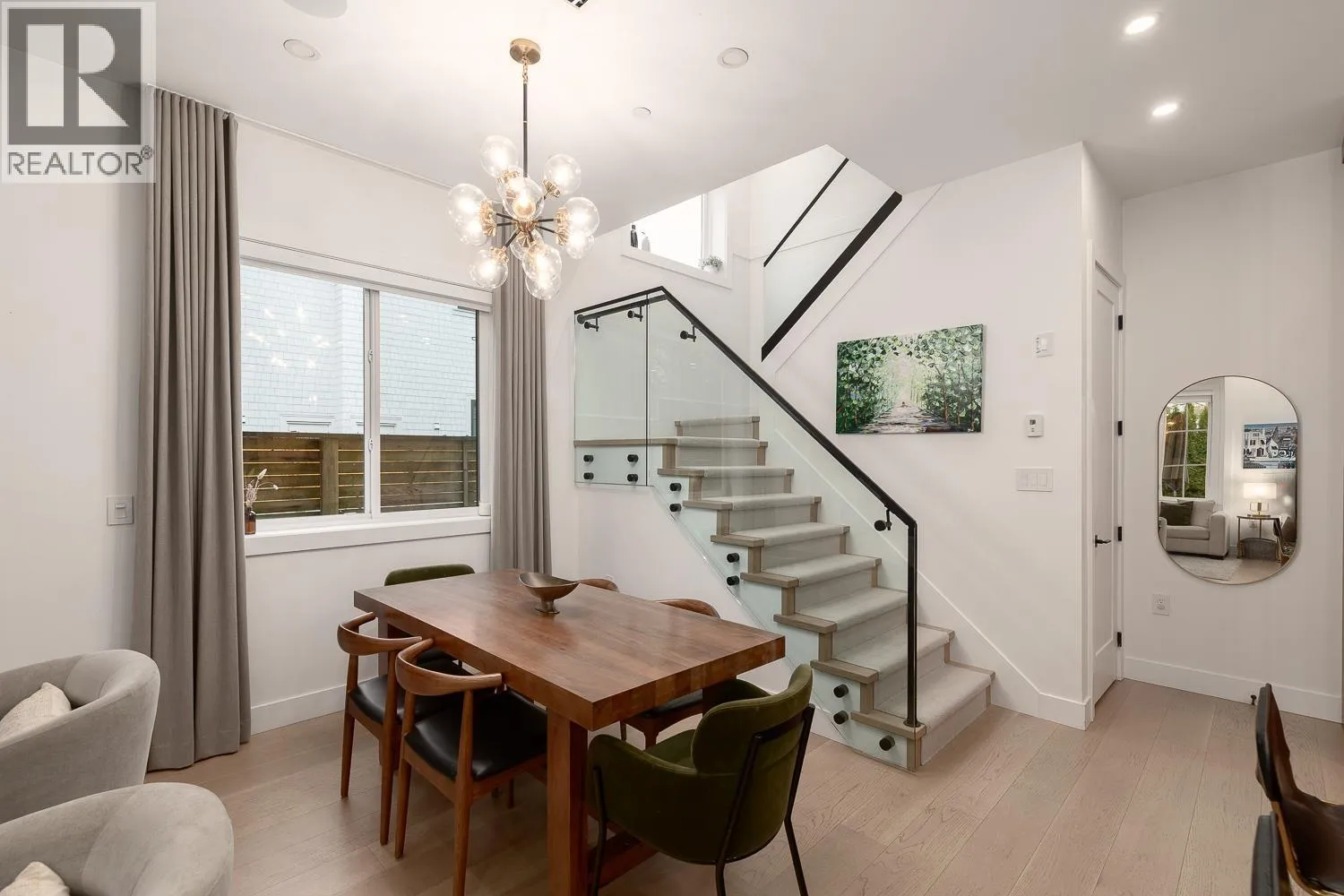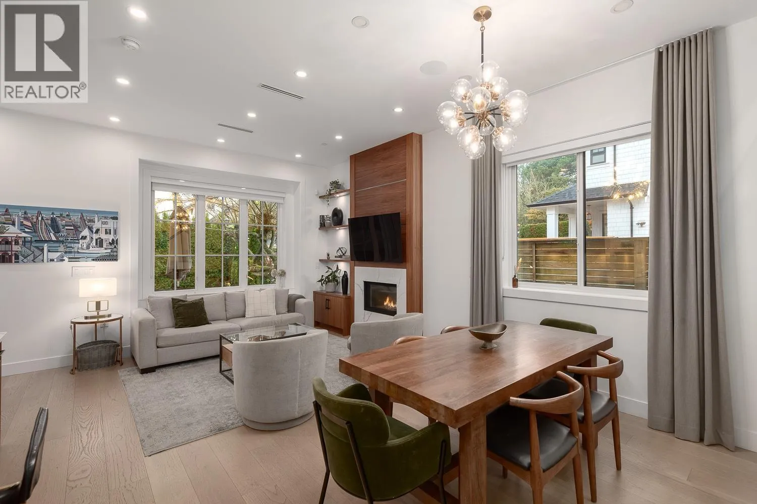 Welcome to this gorgeous front-half duplex in the heart of Mount Pleasant, one of the best family communities in the city. This rare four-bedroom, four-bath home spans three beautifully finished levels. The main floor impresses with 10ft ceilings, wide-plank oak floors, walnut millwork, roll-out kitchen shelving, a gas fireplace, and a chef-inspired Fisher & Paykel kitchen with quartz counters. Upstairs offers three generous bedrooms and two baths, while the top floor provides a private retreat with its own bedroom, bath, and year-round covered balcony. Thoughtful details include A/C, smart home features, Riobel fixtures, irrigation, and excellent storage throughout. Outside, 12ft cedar hedges create privacy around the yard, and the garage is equipped with an EV charger. (id:27476)