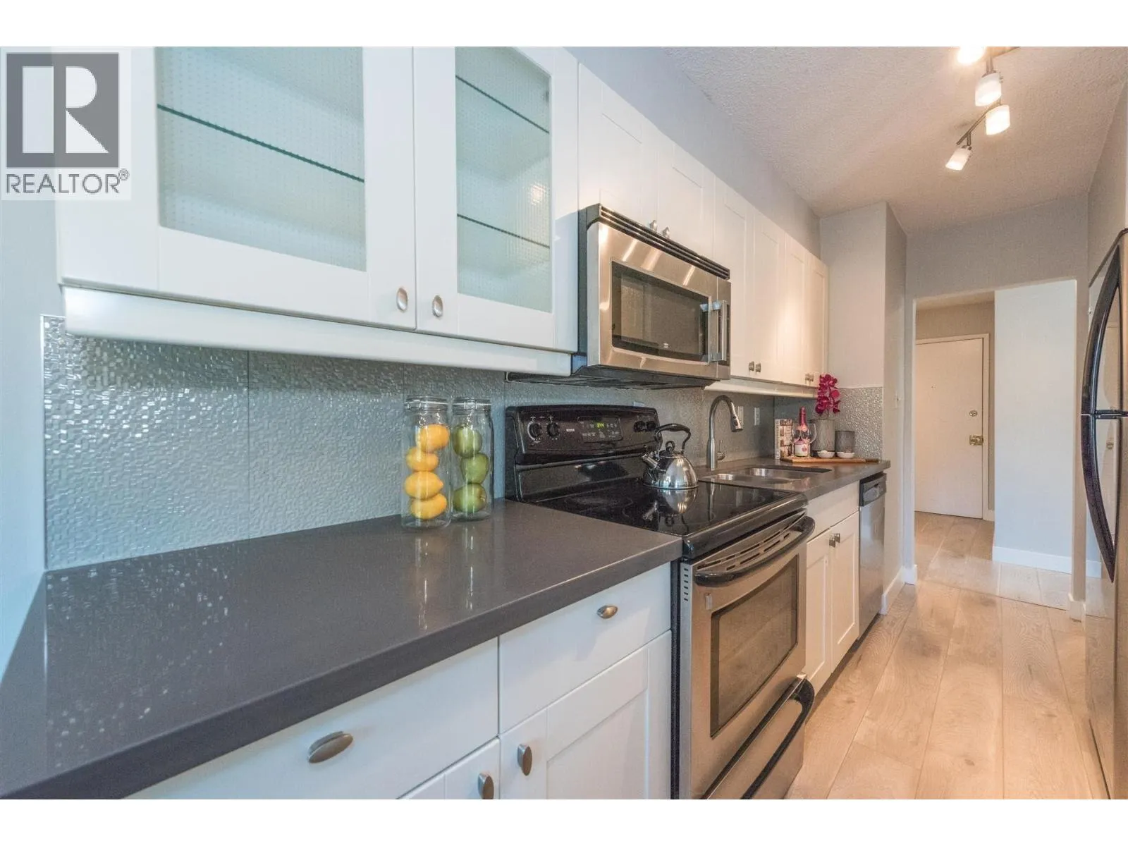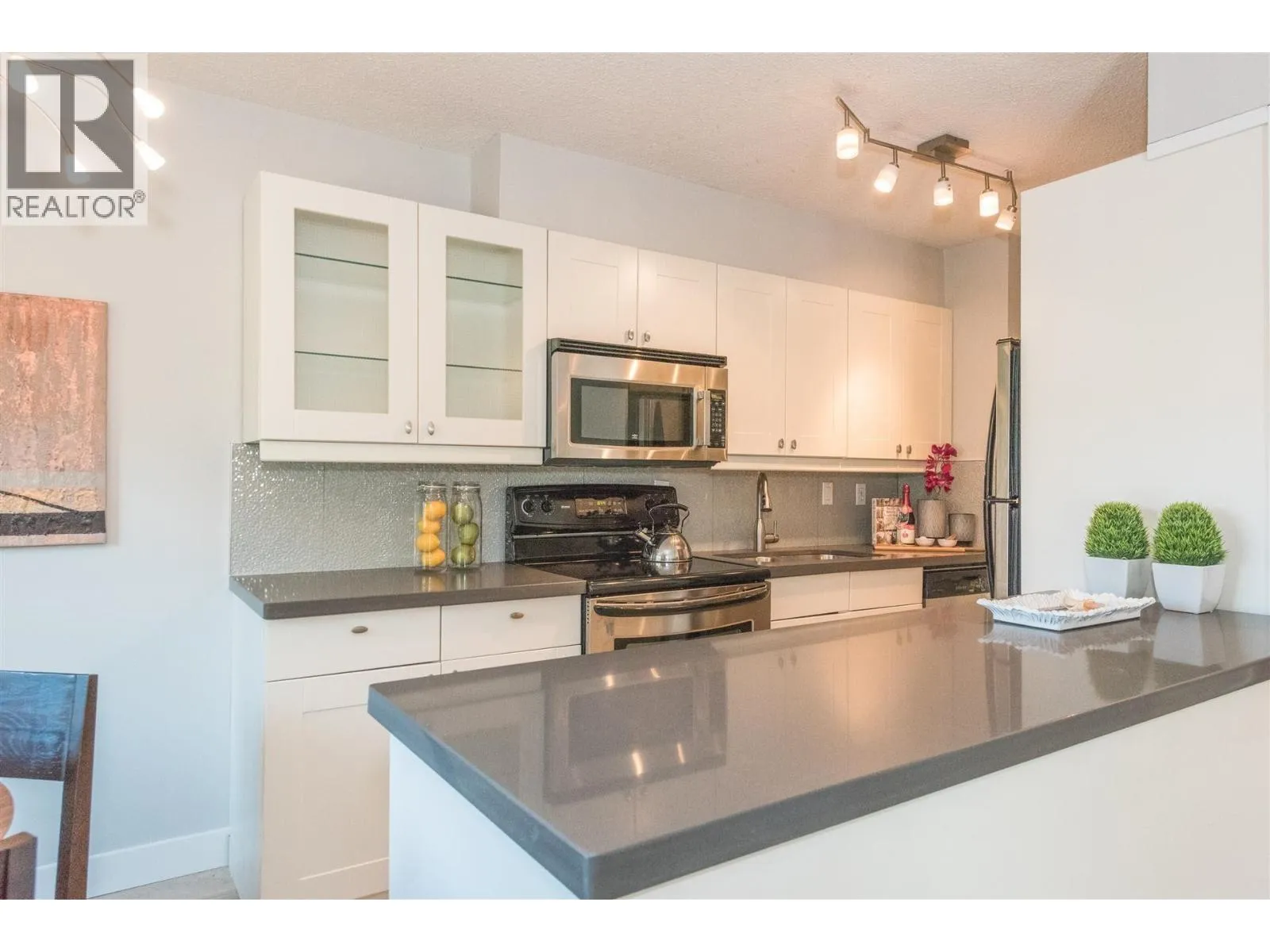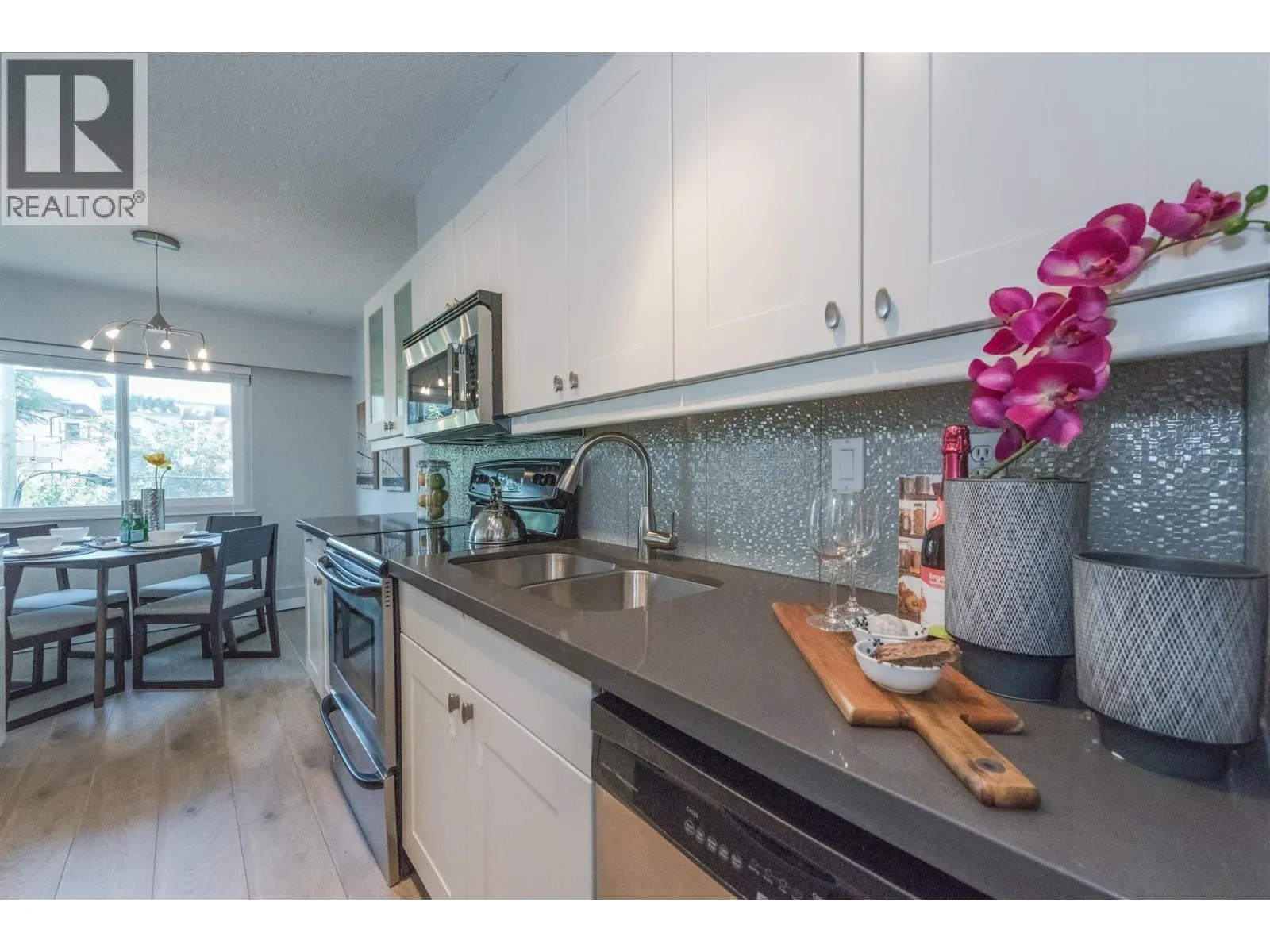 Rarely available corner penthouse that is truly turn-key. Southeast-facing with a wraparound balcony and northern mountain views, this bright and spacious home features a functional open-concept layout with two generous bedrooms, a large living room, and a proper dining area. Tastefully renovated with laminate flooring, kitchen tile, quartz countertops, stainless steel appliances, an updated bathroom, and fresh paint throughout. Includes one storage locker and one parking stall. Pet- and rental-friendly building with a proactive strata. Major updates include roof (2001), piping (2000), boiler (2009), and windows/sliding doors (2012). Currently tenanted at $2,800/month; tenant leaving May 1, 2026. Open House April 4 from 2-4pm (id:27476)