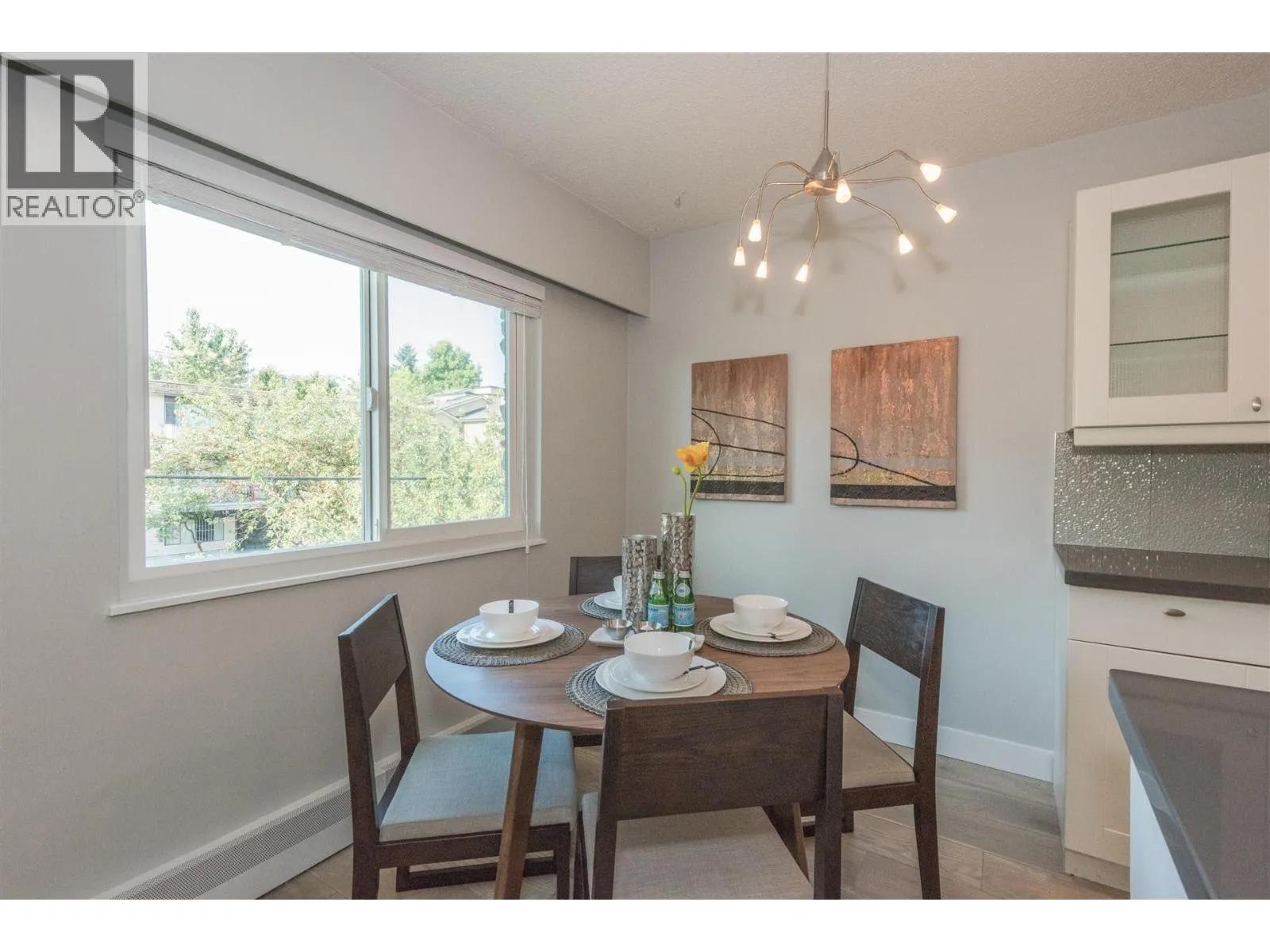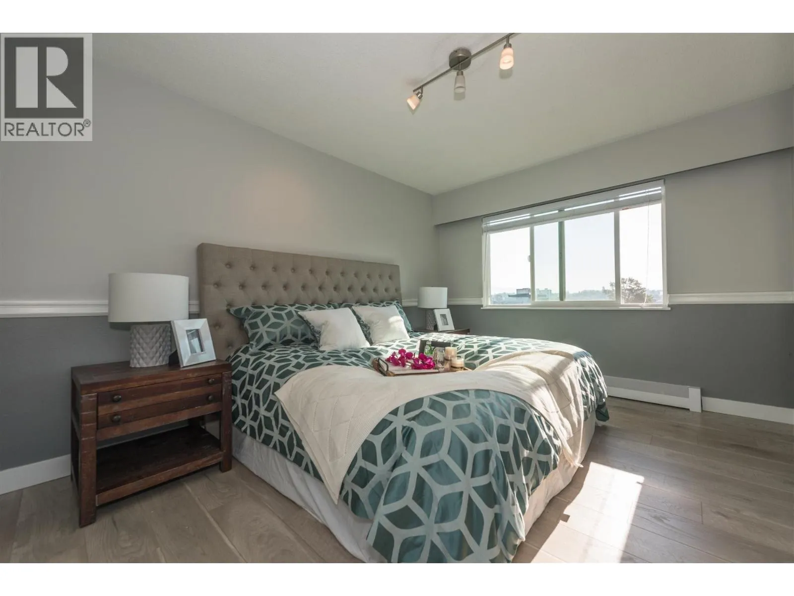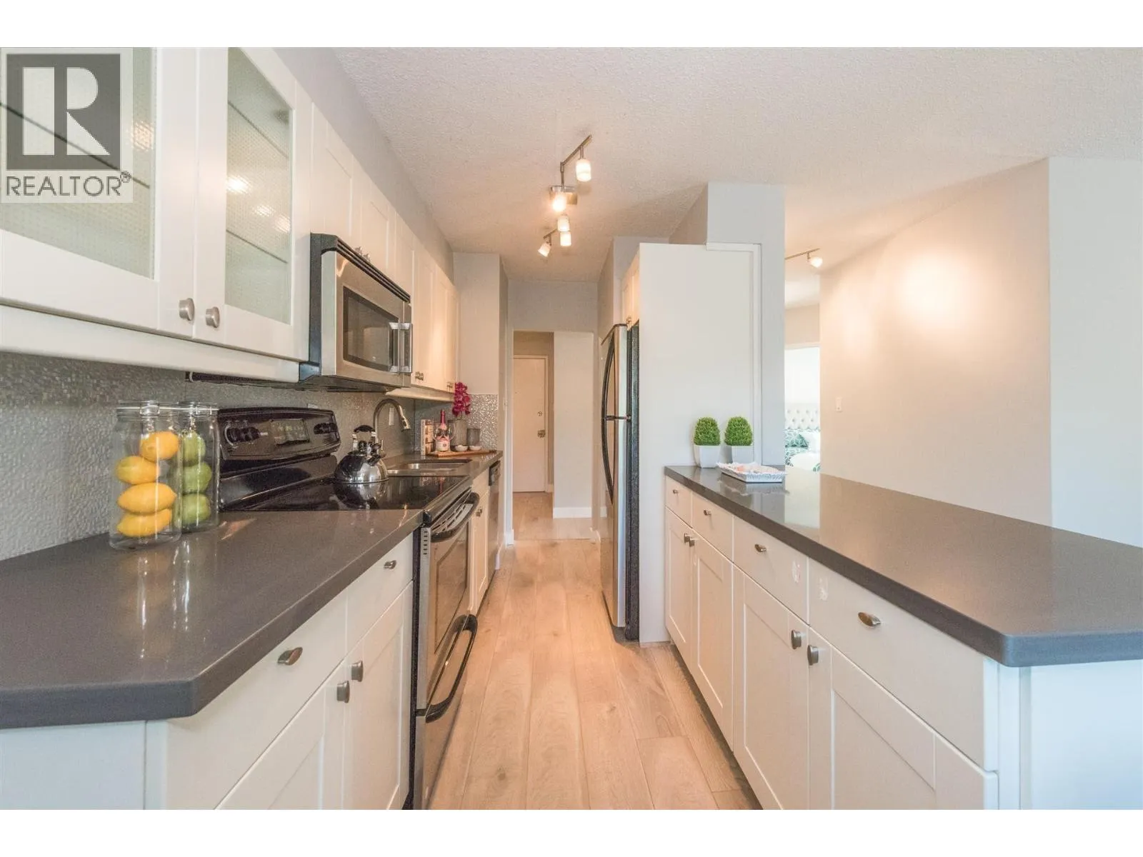 Rarely available corner penthouse that is truly turn-key. Southeast-facing with a wraparound balcony and northern mountain views, this bright and spacious home features a functional open-concept layout with two generous bedrooms, a large living room, and a proper dining area. Tastefully renovated with laminate flooring, kitchen tile, quartz countertops, stainless steel appliances, an updated bathroom, and fresh paint throughout. Includes one storage locker and one parking stall. Pet- and rental-friendly building with a proactive strata. Major updates include roof (2001), piping (2000), boiler (2009), and windows/sliding doors (2012). Currently tenanted at $2,800/month; tenant leaving May 1, 2026. Open House April 4 from 2-4pm (id:27476)