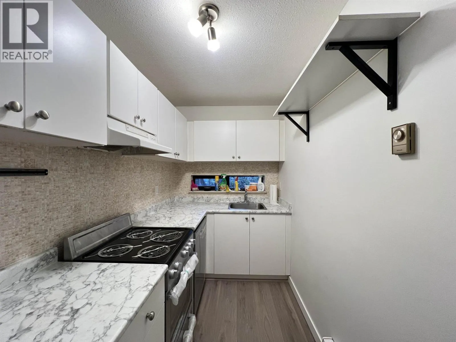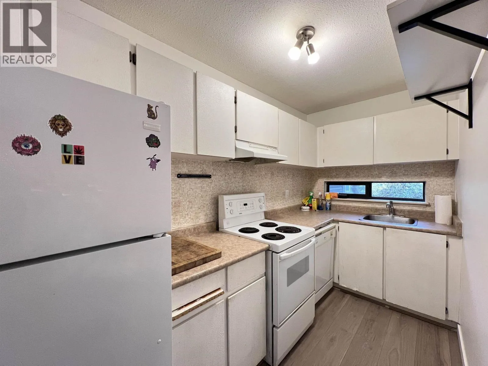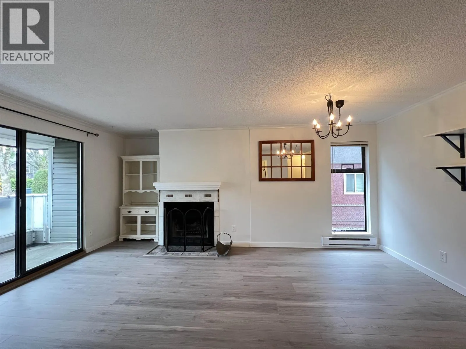 Bright, well-maintained corner unit with north, east, and south exposure, offering excellent natural light and a refreshing cross-breeze. Features a cozy wood-burning fireplace and a private balcony overlooking a quiet, tree-lined setting. Tastefully updated with laminate flooring, updated appliances (fridge and stove), fresh paint, baseboards, and contemporary lighting. has been rainscreened, with plumbing upgraded. Ideally located just steps from tennis courts, Douglas Park, and City Square shopping. Pet-friendly and rental-friendly-an excellent opportunity for both homeowners and investors. (id:27476)