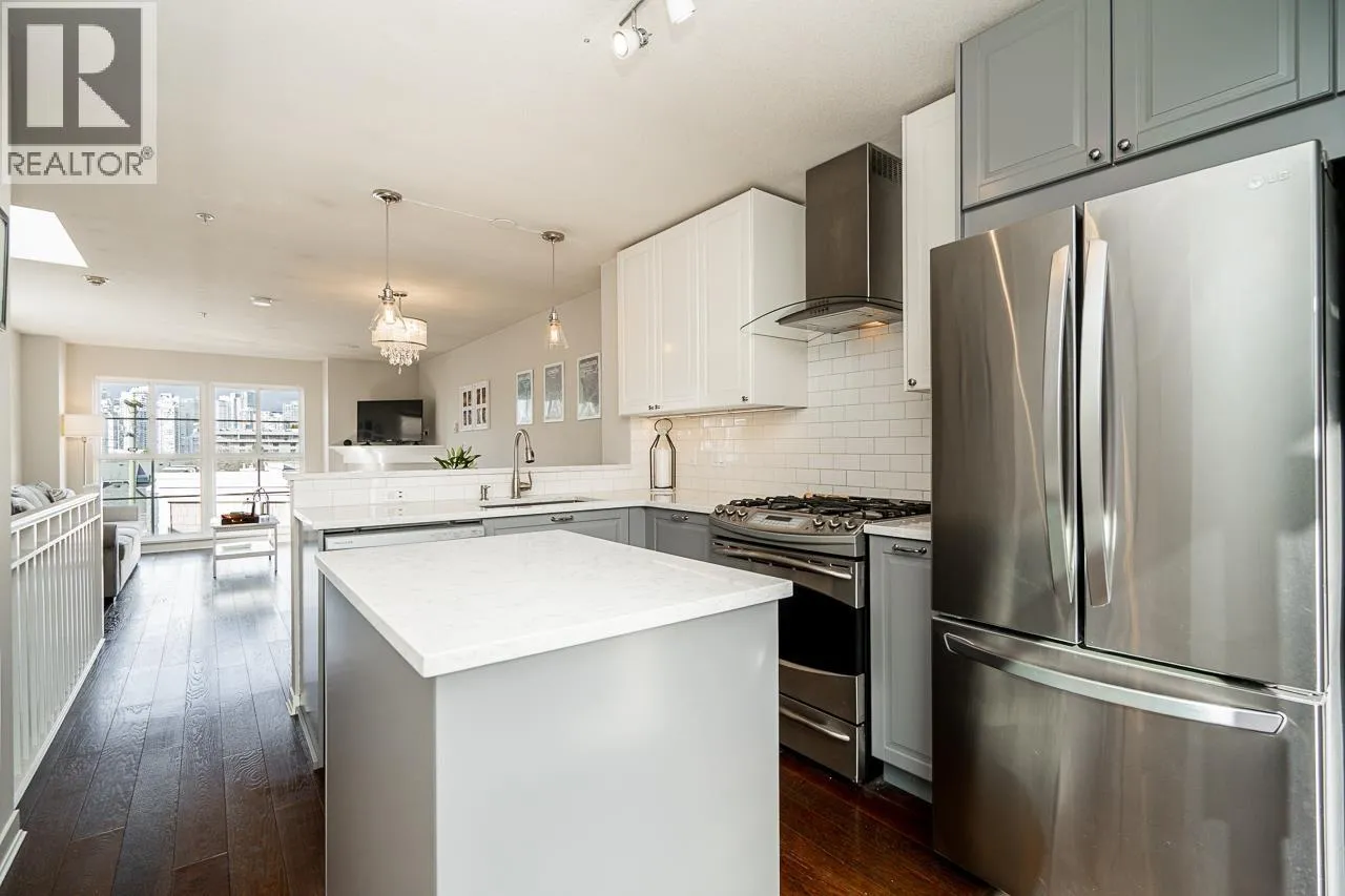 Rarely available 2-level end-unit townhome at Liberté in the heart of Fairview! This well-maintained townhome offers nearly 950 s.f. of bright open living! A top row, private entry unit has no units overhead, capturing stunning city and North Shore Mountain views - just a few reasons why Liberté is considered the 'Gem of 7th Heaven." The professionally renovated kitchen includes modern custom cabinetry, quartz counters, undermounted sink, S/S appliances, and pantry. The bright open living area includes gas fireplace, engineered hardwood floors, two modern & renovated bathrooms and a sunny south-facing patio. 2 u/g parking & secure storage locker, in a rainscreened building & well-run strata. Just steps to Cambie, Whole Foods, SkyTrain, Stamps Landing, Granville Island, schools & more! (id:27476)