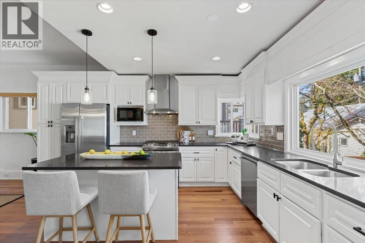 Charming character home in Kerrisdale, with a bright, airy feel & exceptional versatility for today´s lifestyle is ready to be your next address ! Offering 5 beds (3 up) & 4 baths, this spacious residence is perfect for growing families or multi-generational living. The main level features new cherry hardwood flooring throughout, beautiful built ins, a cozy living room with separate seating area with fireplace, & wainscotting adding that perfect touch of character.. The updated kitchen with stainless steel appliances overlooks the sunny patio & backyard. Upstairs, new carpets & a fresh coat of paint throughout create a move-in ready experience. Step out to the large upper deck-ideal for relaxing with your morning coffee. The primary suite offers plenty of room for your king sized bed, & features an ensuite with separate tub & shower The in-law suite provides great flexibility, while the double garage adds everyday convenience. A truly inviting home with space, style, & function. Call for your private showing ! (id:27476)