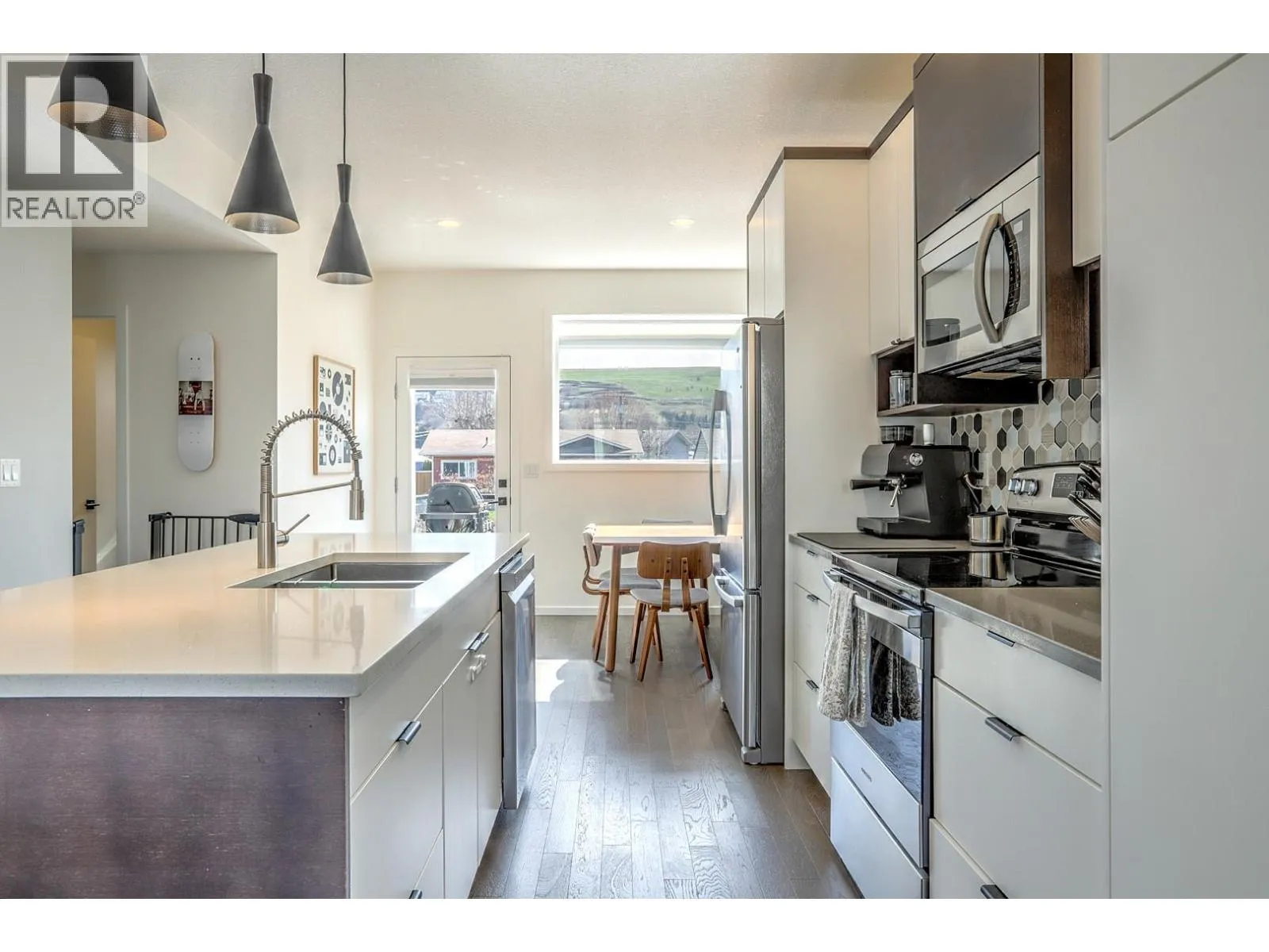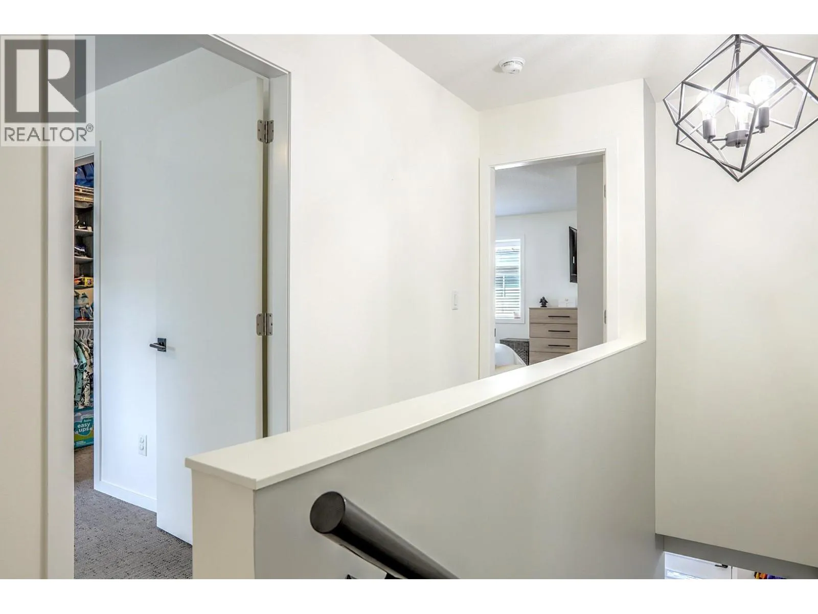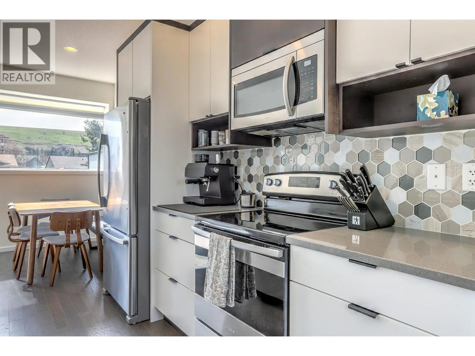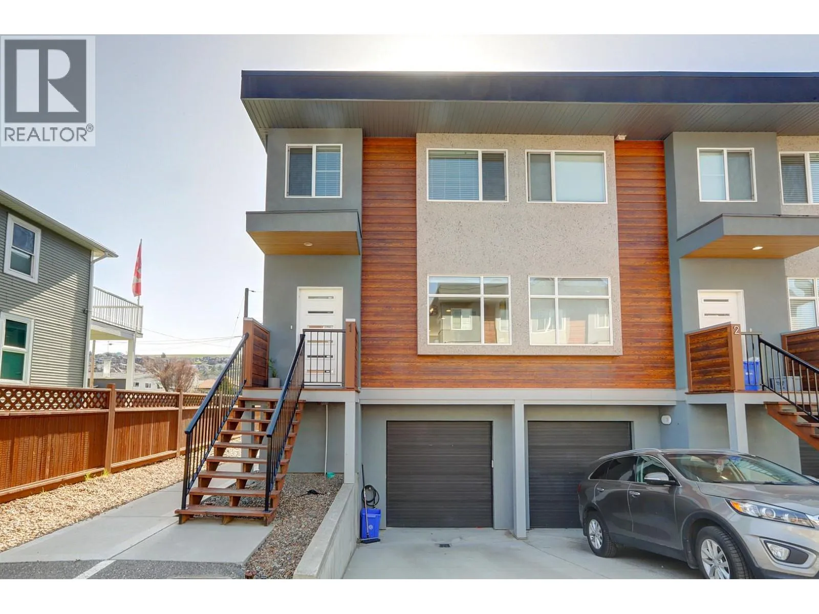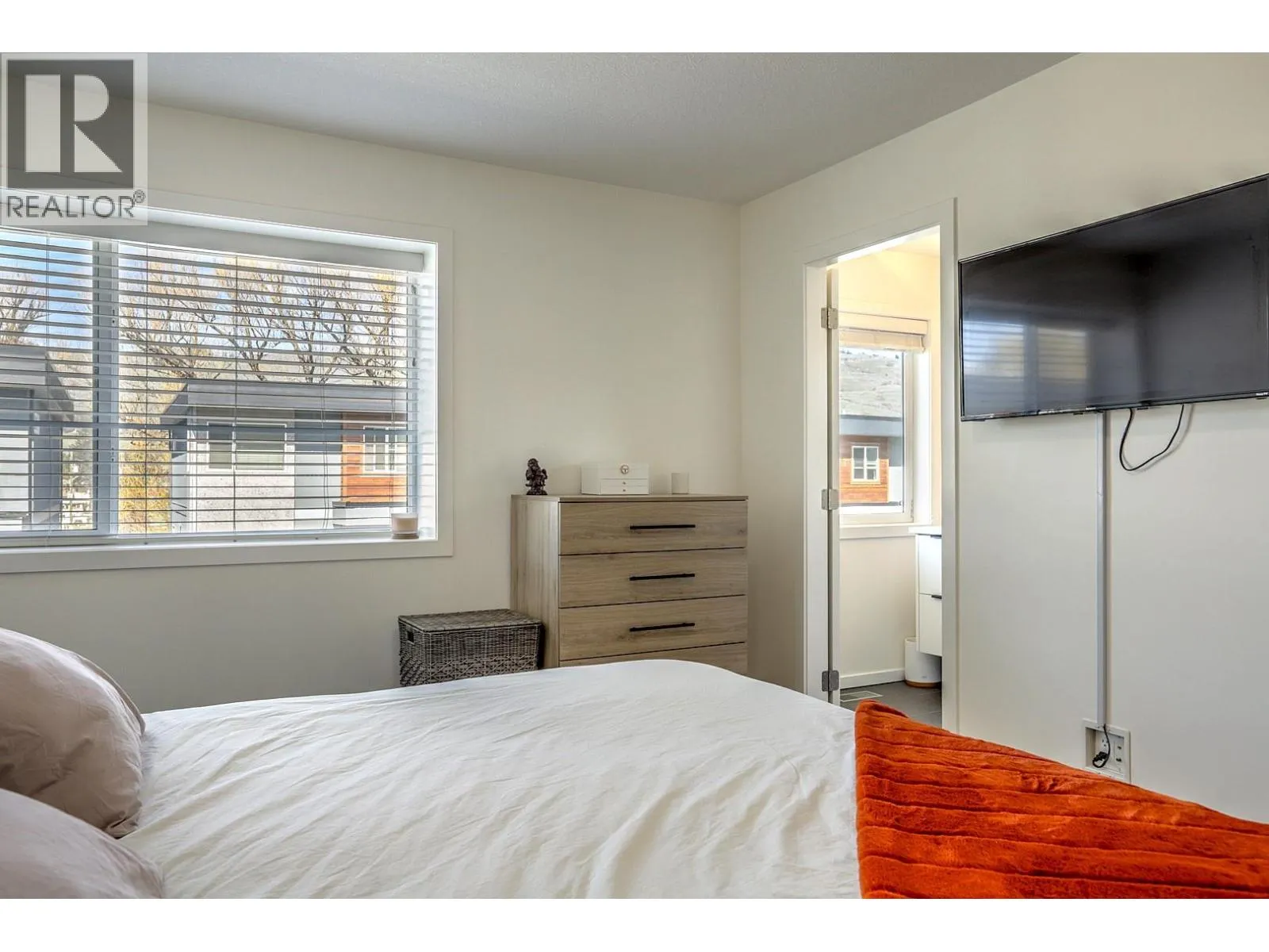 Stylish and spacious 2018-built end-unit townhouse in a quiet 11-unit complex with lovely hillside views and abundant natural light. Thoughtfully designed with engineered hardwood flooring, quartz countertops, modern cabinetry, tasteful wood accents, transom windows, tiled backsplash, quality fixtures, and newer, high-quality blinds on the main floor and natural gas hook up on the deck. The upper level offers two generous primary bedrooms, each with their own ensuite and walk-in closetâproviding ample space and comfort. The lower level includes a single-car garage, a storage room, and a versatile third bedroom with ensuite, which also works beautifully as a family room or office. Enjoy south-facing light and a great sense of privacy. Located just minutes from Okanagan Lake beaches and parks, Vernonâs popular pickleball courts, scenic hiking trails, and top-rated golf at The Rise. An excellent location for anyone who loves both nature and convenience. Pet friendly: one dog or one cat allowed. All measurements taken from iGuide. (id:27476)