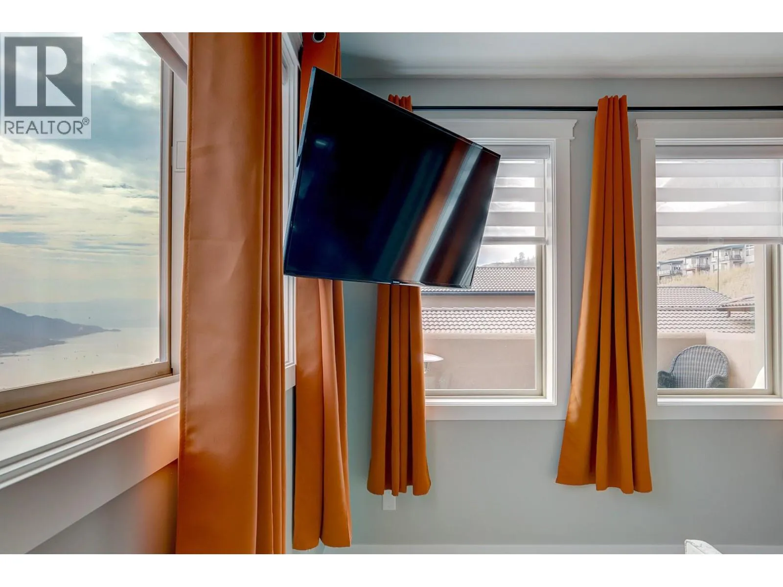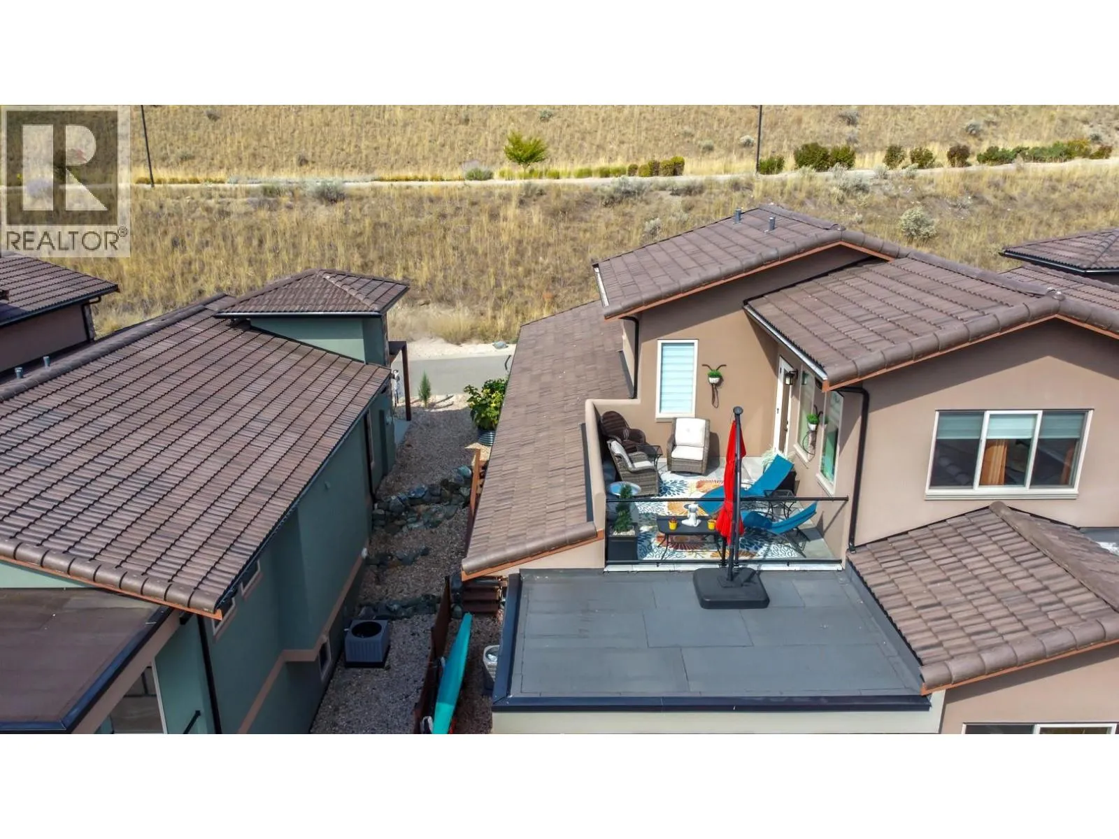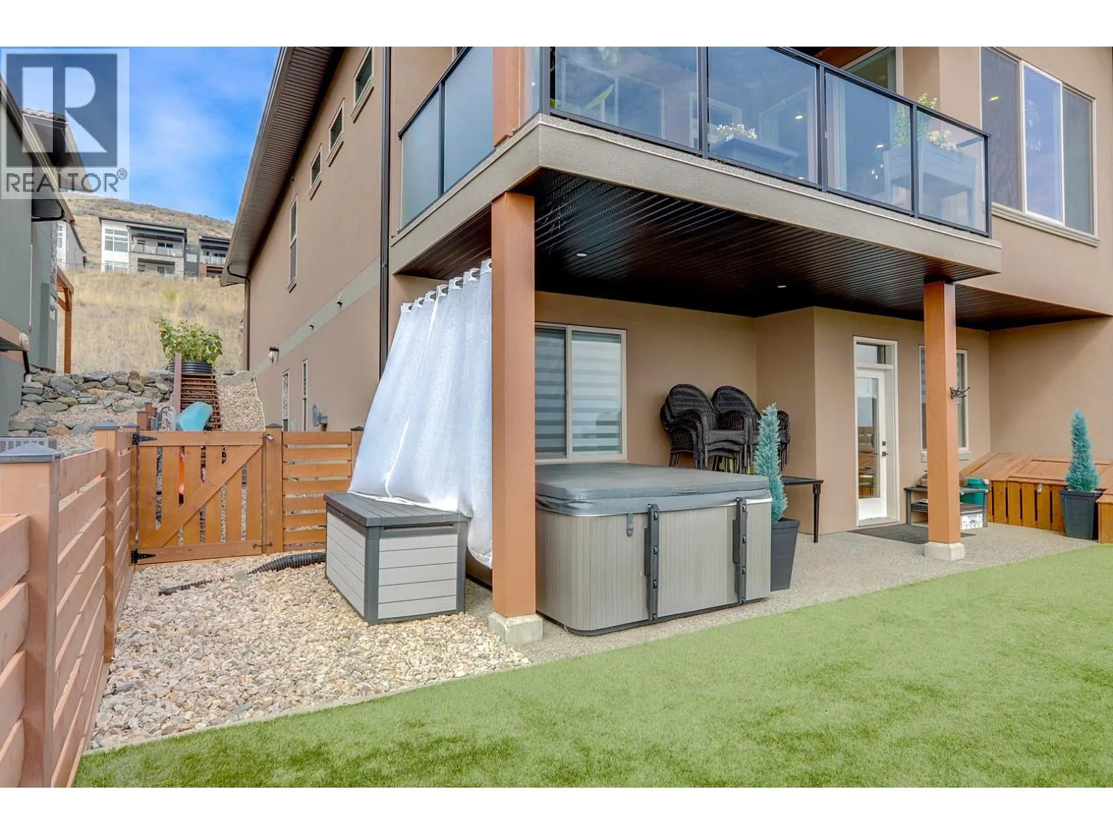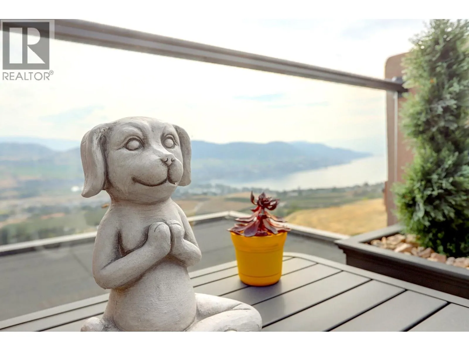 Designed for everyday living and entertaining, featuring a chefâs kitchen with an oversized island, bar-style seating, and upgraded appliances. The open-concept living and dining areas flow seamlessly to a spacious covered patio for enjoying the sweeping city and lake views. A striking Venetian plaster fireplace (electric) and exposed beams in the living room elevate the space with a warm charm. Upstairs, the primary suite occupies the second level, offering a generous walk-in closet and a luxurious 5-piece ensuite with a large upgraded soaker tub with side-mounted taps and a separate glass-enclosed shower. The private rooftop patio provides private oasis with more spectacular lake views. Thoughtful upgrades include: all lighting updated, faucets and fixtures upgraded to matte black. Trim moldings now frame all windows and doors and upgraded tiling enriches the kitchen, bathrooms, and laundry room. A quick hot-water system, upsized tank, and fully finished media/playroom downstairs add to the homeâs comfort and livability. Outdoor living has been equally enhanced with, new fencing and stairs along the side of the home, faux grass and a vegetable garden with planters. The hot tub offers the perfect place to relax after a day of enjoying nearby trails or golfing at The Rise â a Fred Couples Signature Course or dinner at The EDGE Restaurant & Bar just minutes away. 2 Pets, no height or breed restrictions. (id:27476)