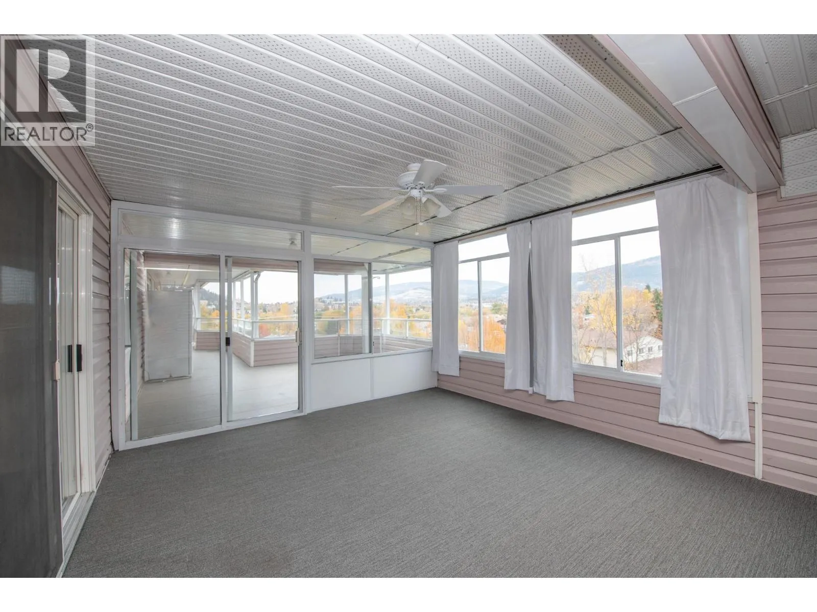 Welcome to this unique bright and inviting 3-bedroom, 2-bathroom condo in the Mission Hill area of Vernon, BC. This home offers the perfect blend of comfort, convenience, and scenic beauty. Youâll love the unique large enclosed patio with wrap-around deck â perfect for morning coffee, year-round entertaining, a games room, or simply taking in the beautiful valley views. Inside, the open-concept layout features a spacious living area, a well-equipped kitchen, a cozy gas fireplace, and plenty of natural light throughout. Enjoy year-round comfort with your own newer AC/heat pump system, plus the convenience of in-suite laundry with a washer/dryer, stand-up freezer, and extra fridge included. The primary bedroom offers a walk-in closet and private ensuite, while two additional bedrooms and a full bathroom provide flexibility for family, guests, or a home office. Located in the well-managed Vintage Terrace strata, this home includes one secure parking stall and a roomy storage unit for added convenience. Ideally situated close to town, shopping, schools, the hospital, and public transit, this condo provides easy access to all Vernon amenities while maintaining a peaceful residential feel. Whether youâre downsizing, investing, or purchasing your first home, this property is a must-see! (id:27476)
