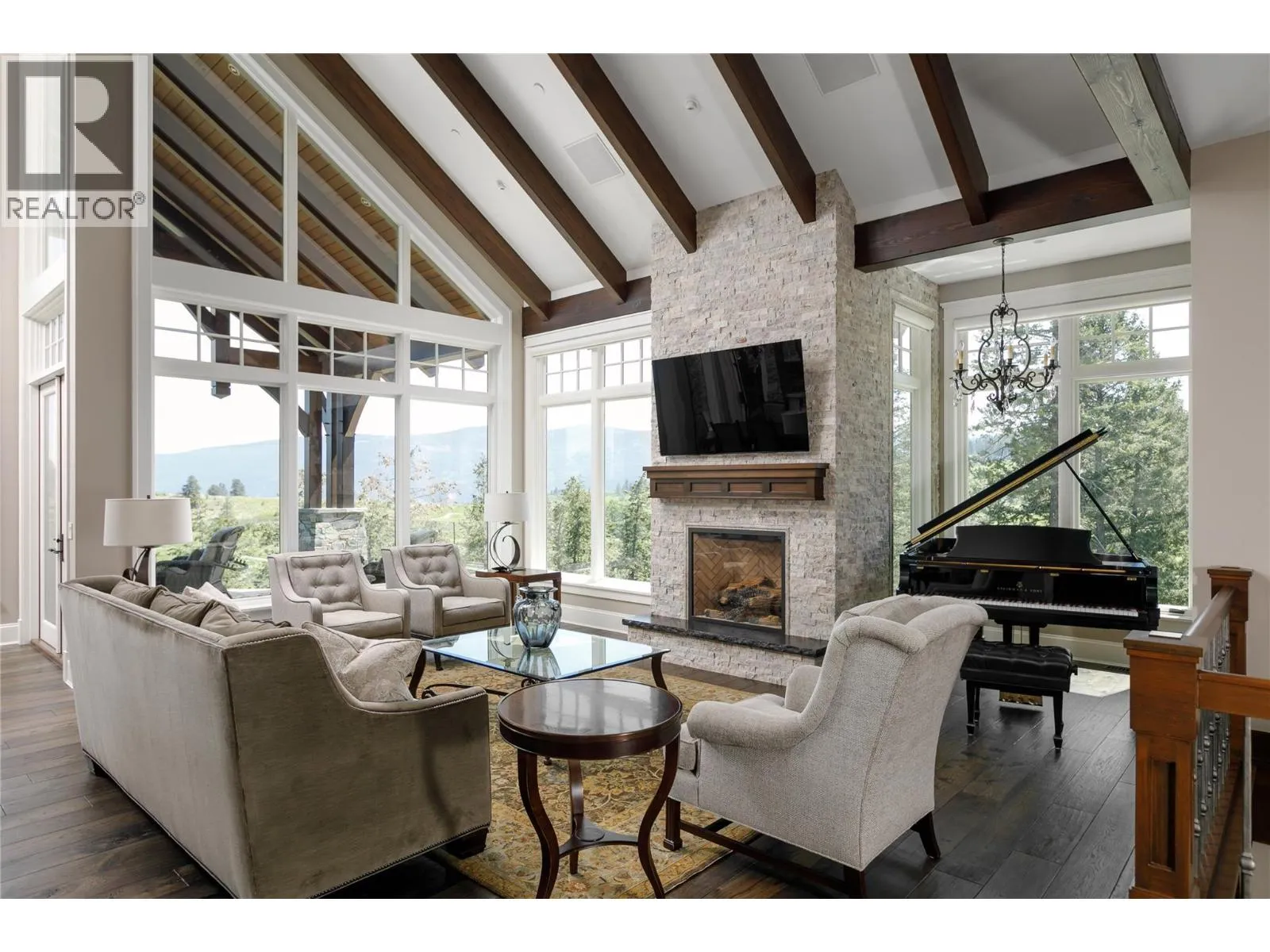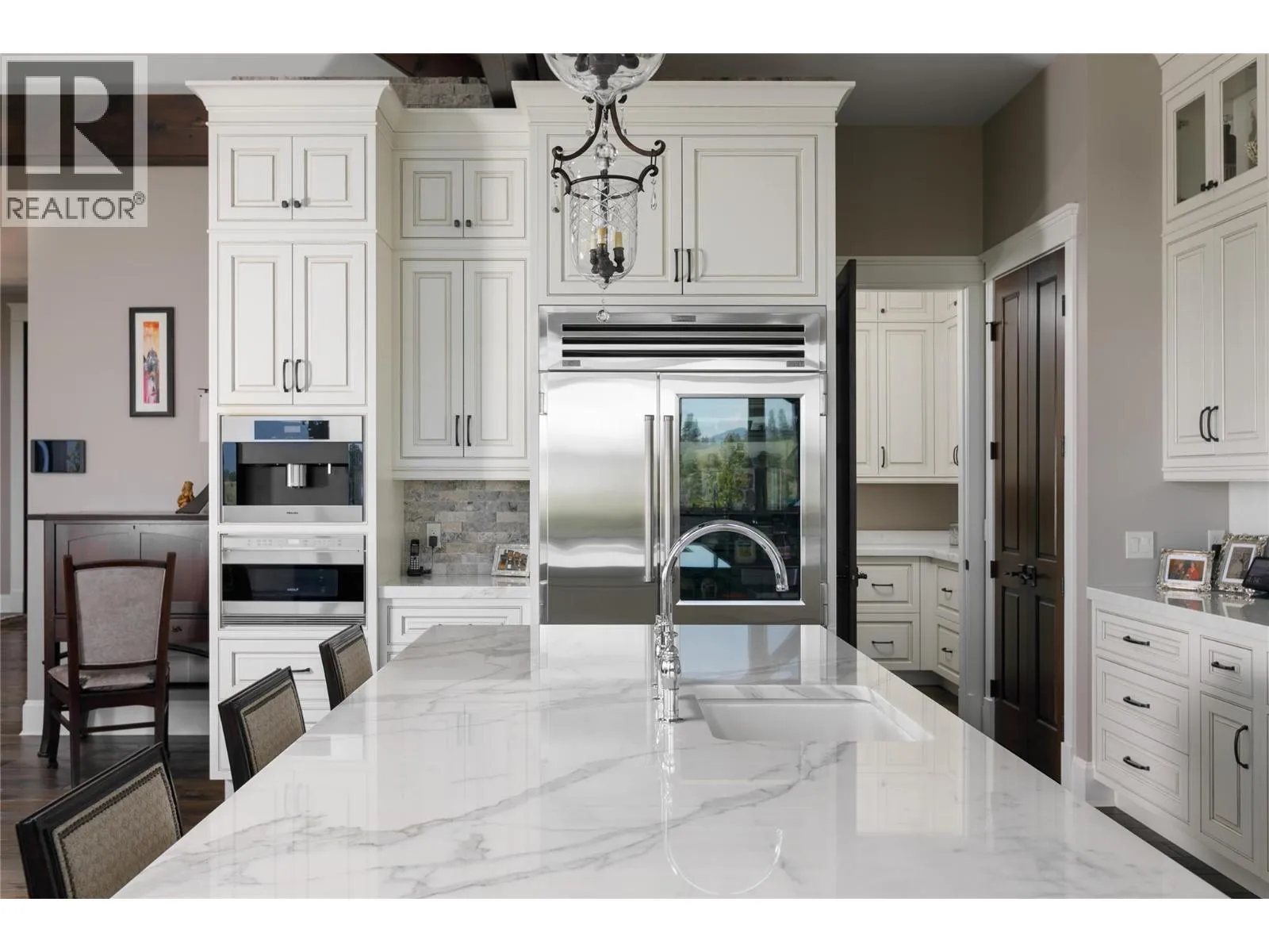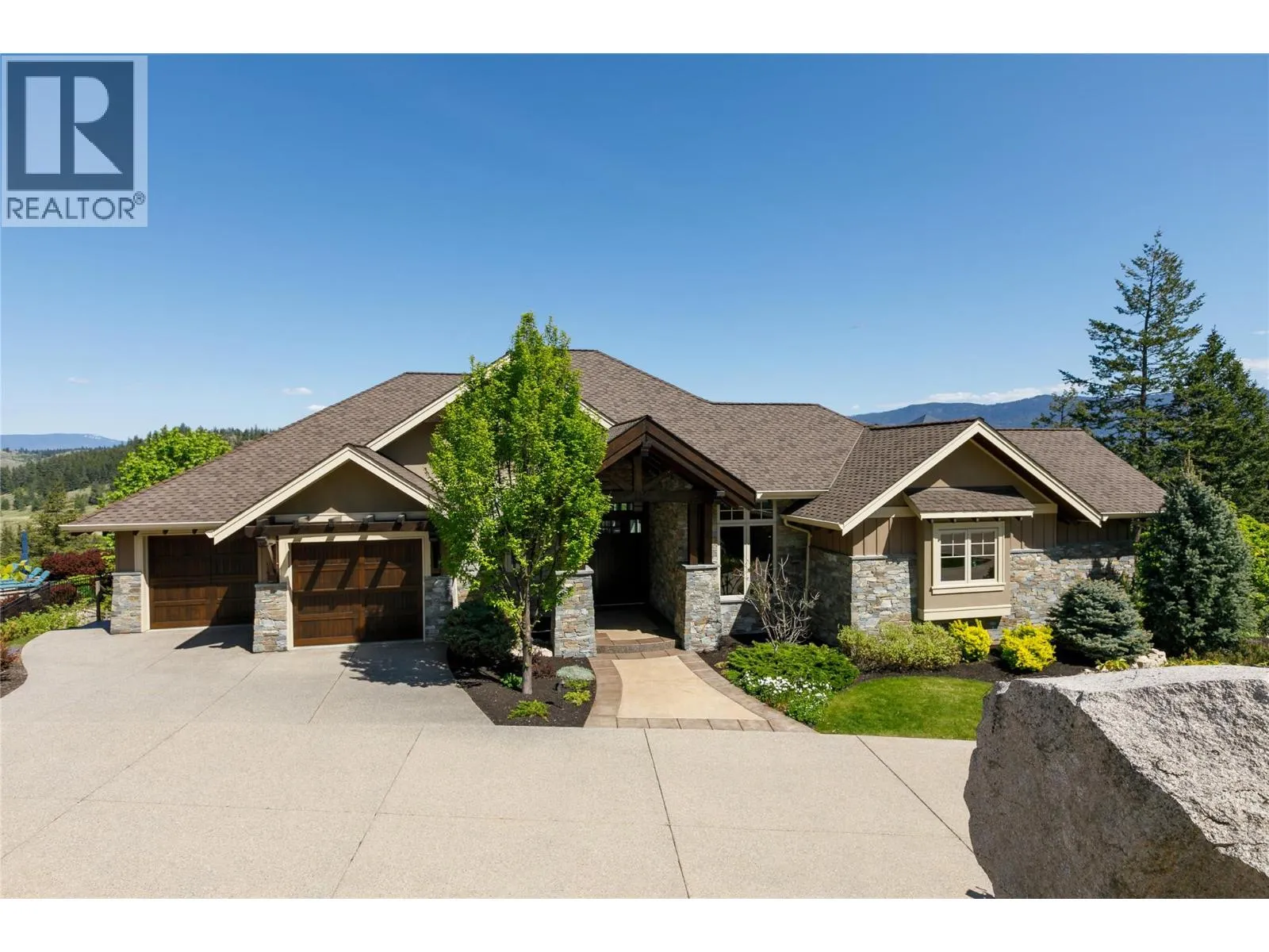 Your lifestyle needs that perfect home in a perfect setting! The Predator Ridge Community offers two world class championship golf courses, state-of-the-art fitness centre, tennis & pickleball courts, a vibrant village center and an endless trail system! This exceptional estate home sits at the end of a private cul-de-sac, offering expansive mountain and golf course views with breathtaking sunrises! Built by Heartwood Homes, it showcases exquisite craftsmanship with Calacatta marble, split-faced travertine, fir timber beams, hickory engineered hardwood, and intricate door and window details. The chef-inspired kitchen, featuring Miele, Wolf, and Sub-Zero appliances, flows into a sunlit great room with vaulted ceilings and a grand piano niche. The serene primary suite includes a see-through fireplace, marble slab shower with stone walls, and a custom walnut walk-in closet. The in-floor heated lower walk-out level is designed for entertainment, featuring a state-of-the-art theatre, games area, wet bar, and wine room. Outdoors, a Fujiwa porcelain-tiled saltwater pool, 10-foot hot tub, and multiple sitting areas with two exterior kitchens embrace the Okanagan lifestyle, while a cascading waterfall adds to the tranquility. A heated three-car garage completes this remarkable property. (id:27476)