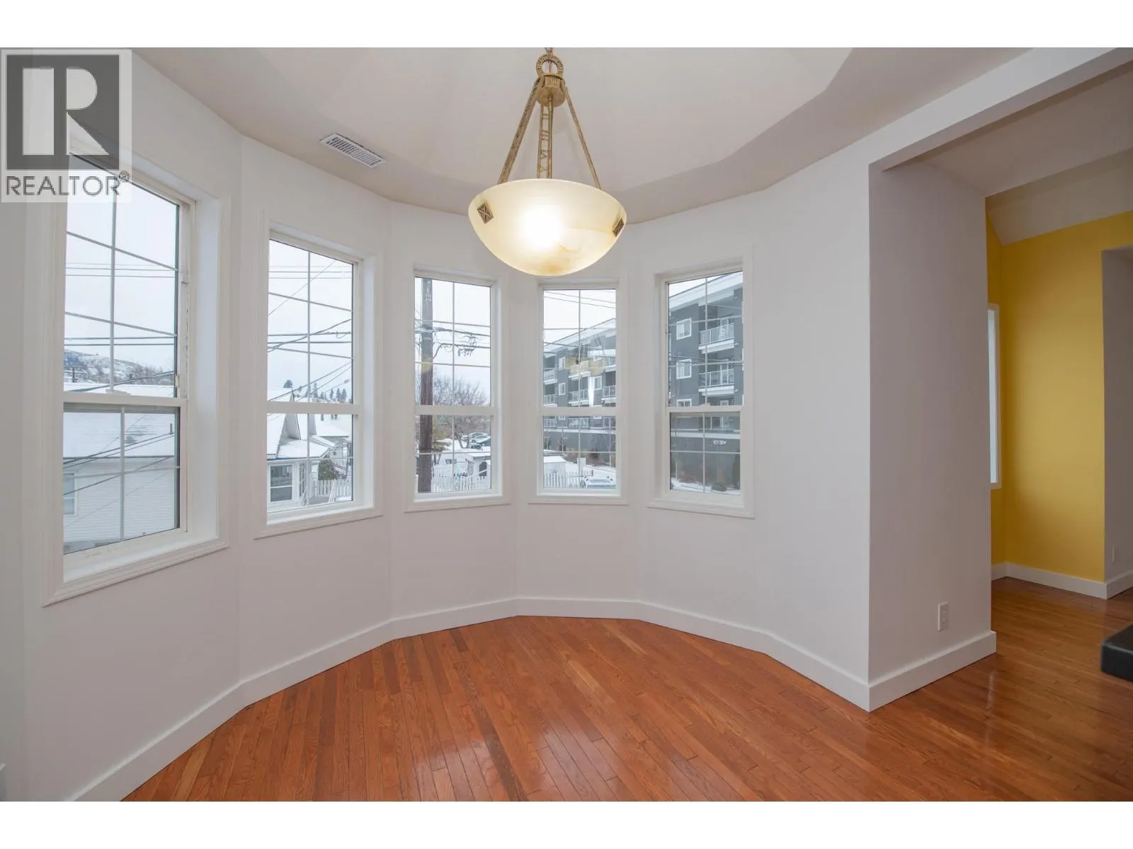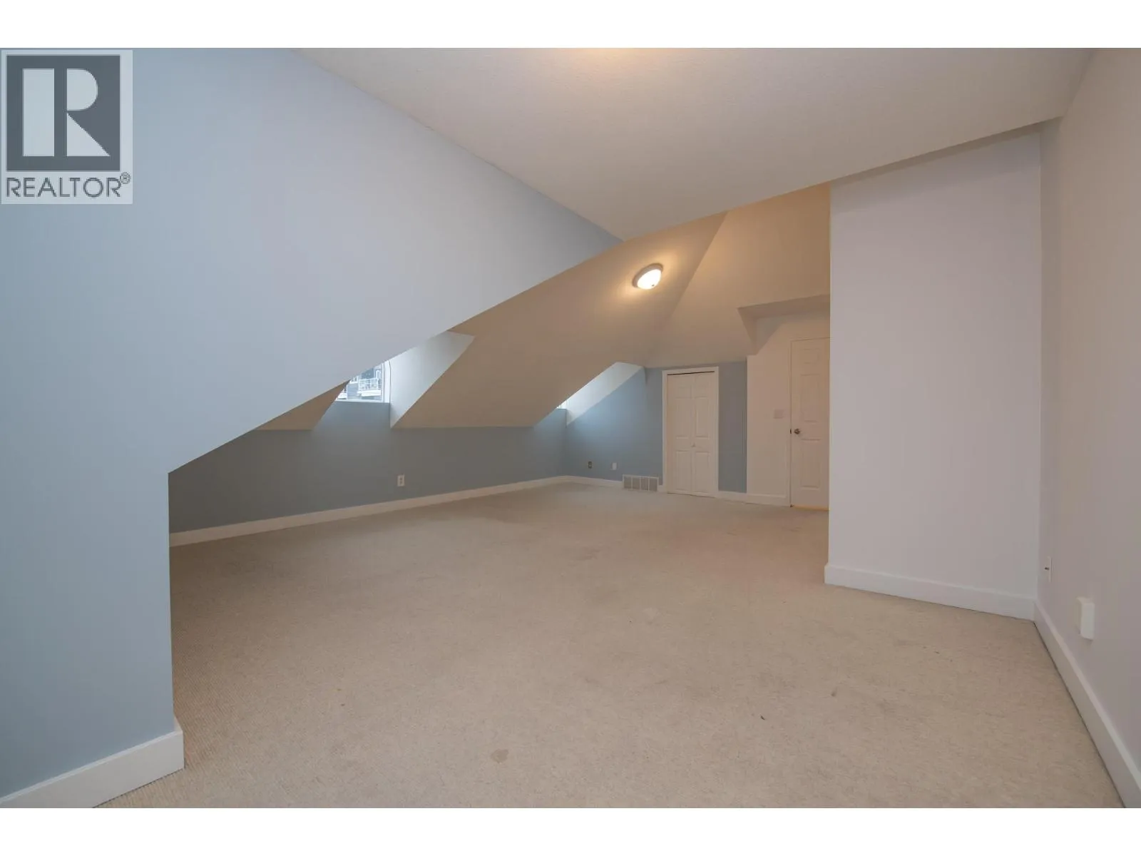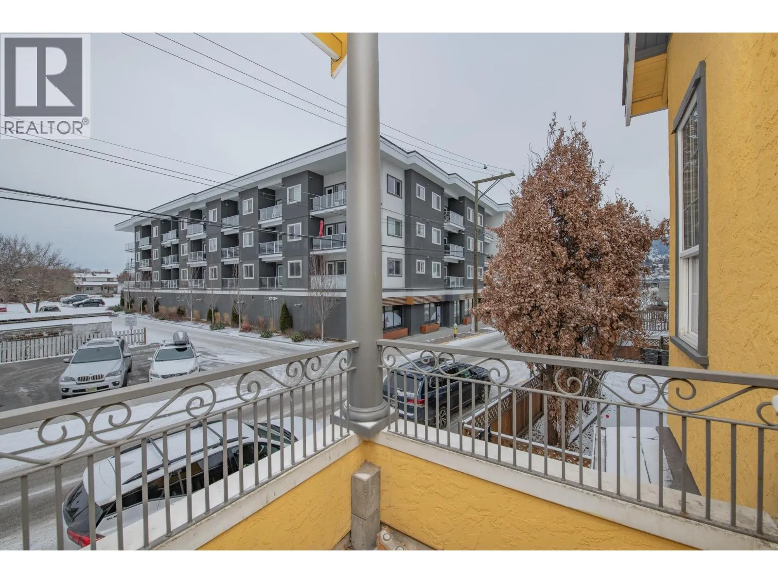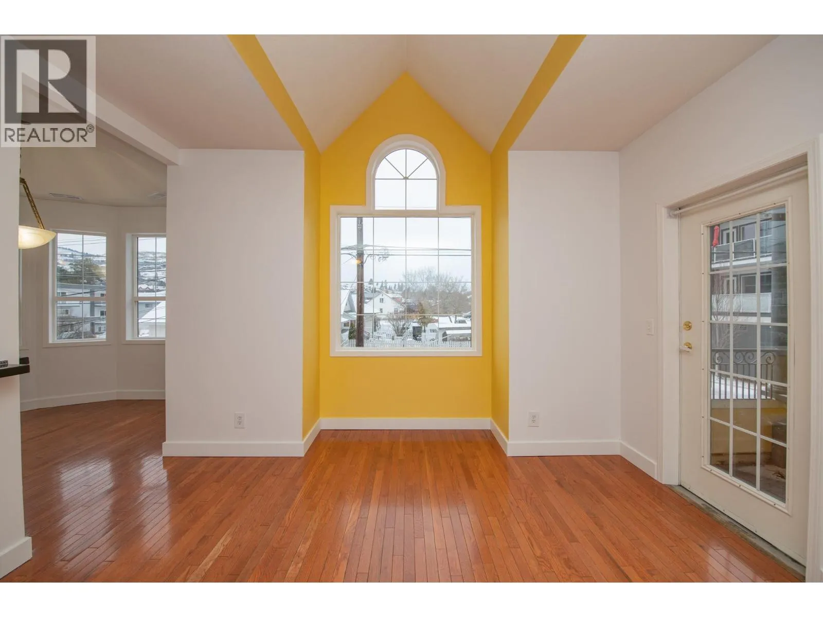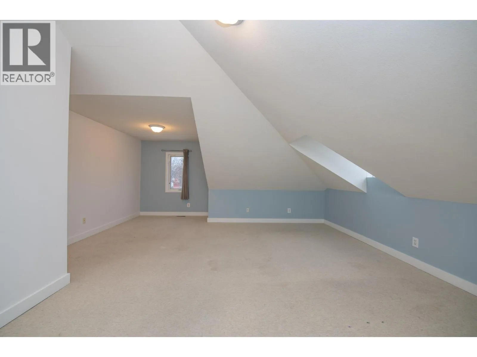 Unique 2 level townhome in downtown Vernon. This spacious townhome features over 1500 sq/ft of living space, including 3 bedrooms and 2 full bathrooms. The spacious kitchen has solid surface counters, stainless steel appliances and an eat in island. The living room is bright, flows nicely from the dining room and has real hardwood flooring. 2 bedrooms and a bathroom complete the main living level. Upstairs, you will find a oversized loft style master bedroom with vaulted ceiling plus an adjoining bathroom. Plenty of storage, balcony patio and tall ceilings make this unit stand out. Small 3 unit strata with quaint design, walking distance to all shops and amenities downtown has to offer. Freshly painted,1 pet allowed. Book your showing today! (id:27476)