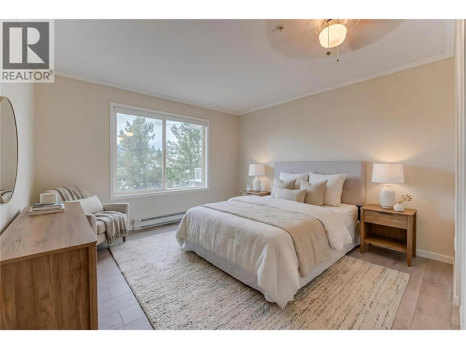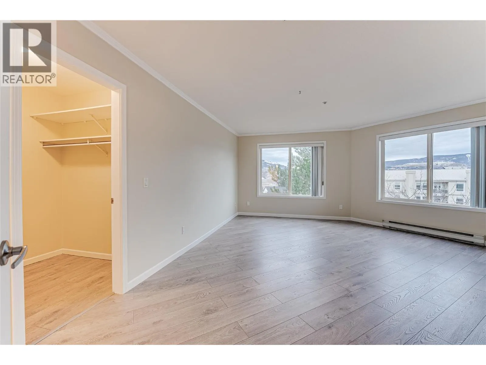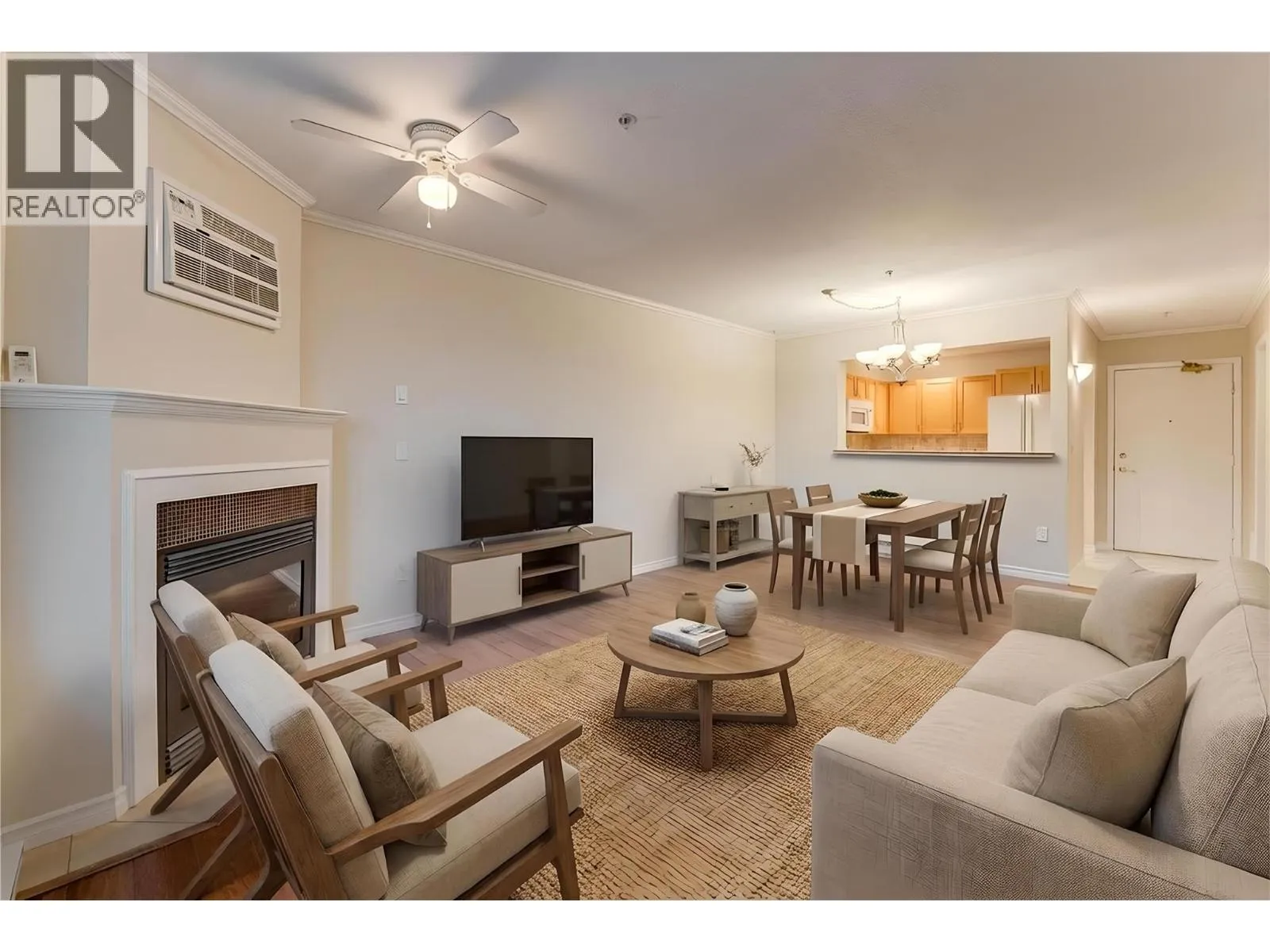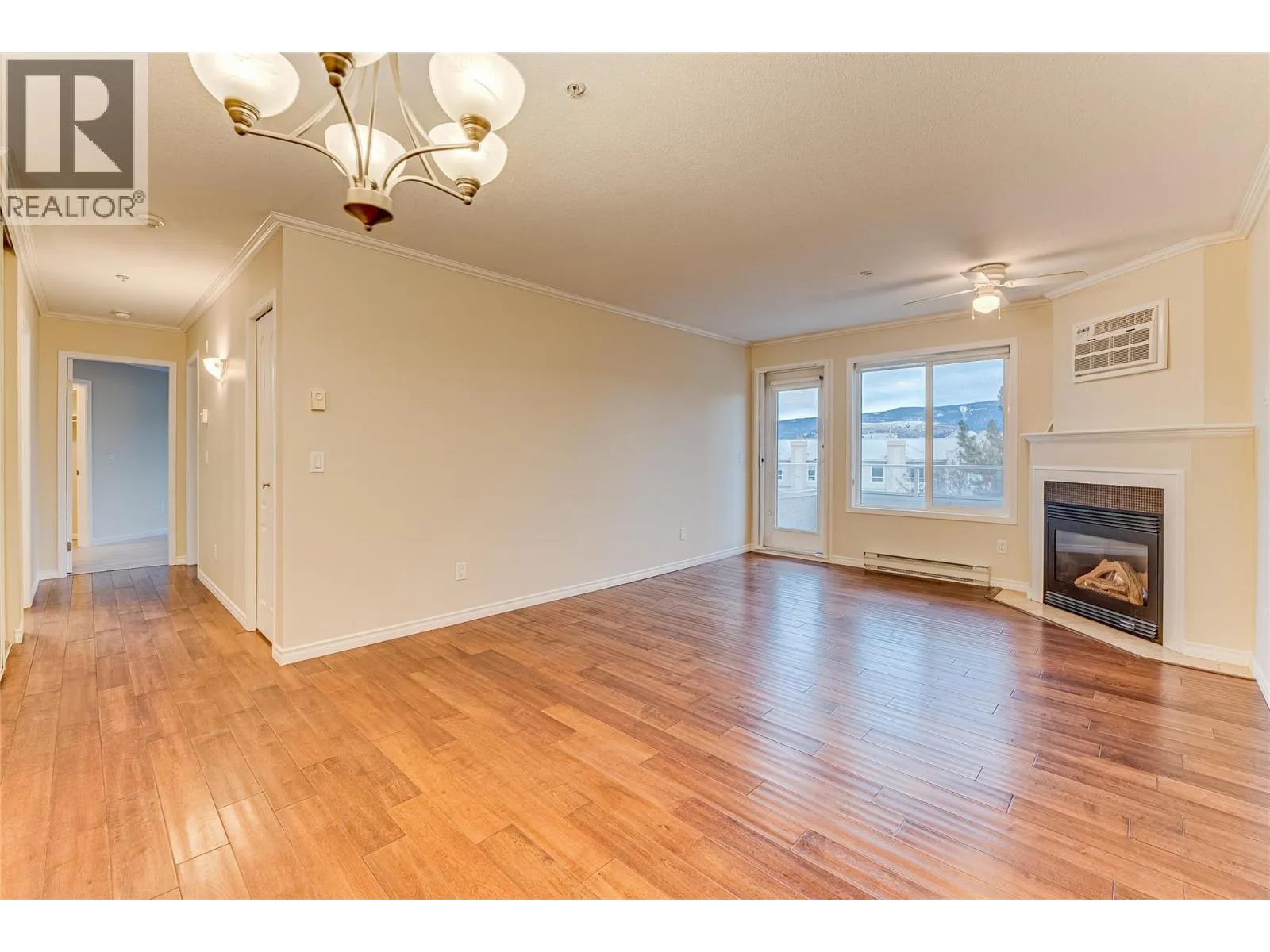 Welcome to Unit #102 at Imperial Ridge. With a fresh coat of paint, recently updated flooring, and a lovely kitchen, this 2-bedroom, 2-bathroom condo is truly move-in ready. The home is located in a well-maintained, all-ages building that has undergone extensive upgrades since 2022, including parkade improvements, building envelope work (windows, decks, stucco), a new elevator, and refreshed hallways with modern carpeting, lighting, and paint. Ideally located just steps from downtown Vernonâs shops, cafes, medical offices, and services, this quiet, south-facing home is filled with natural light and enjoys beautiful city views, with glimpses of Okanagan Lake. The spacious layout offers a modern kitchen with plenty of storage, opening into the dining area and comfortable living room. Enjoy the cozy gas fireplace on cooler days (natural gas included in the strata fee), and in summer relax on your private deck or stay cool with the newer wall-mounted A/C unit. The primary bedroom features a walk-in closet and full ensuite, while the second bedroom and full main bathroom provide flexibility for guests, a home office, or family. In-suite laundry with newer washer and dryer adds everyday convenience. Additional features include one secure underground parking stall, a storage locker, bike storage, and a common room. Strata fees include hot water, water, sewer, garbage, natural gas. Book your showing today! (id:27476)