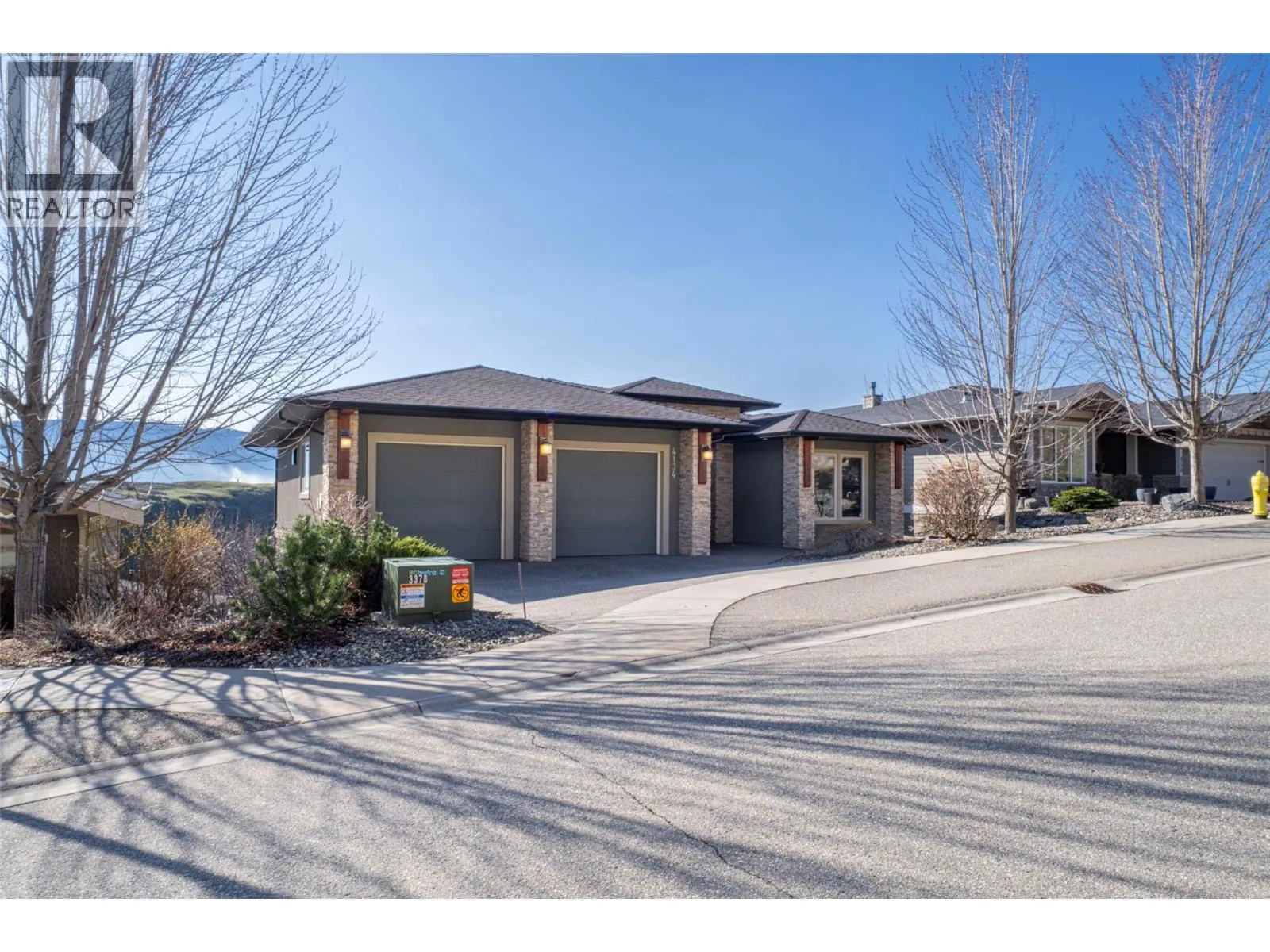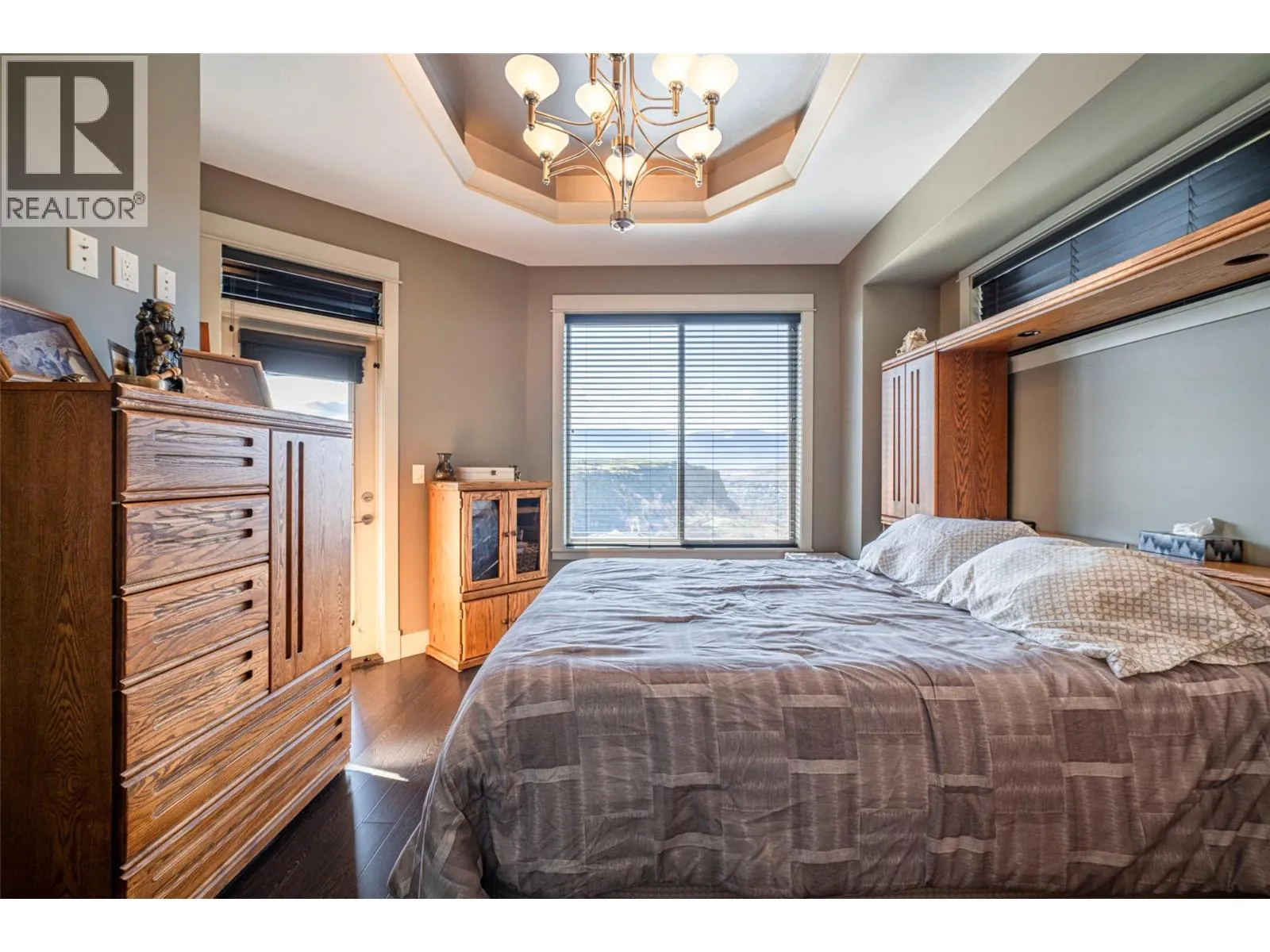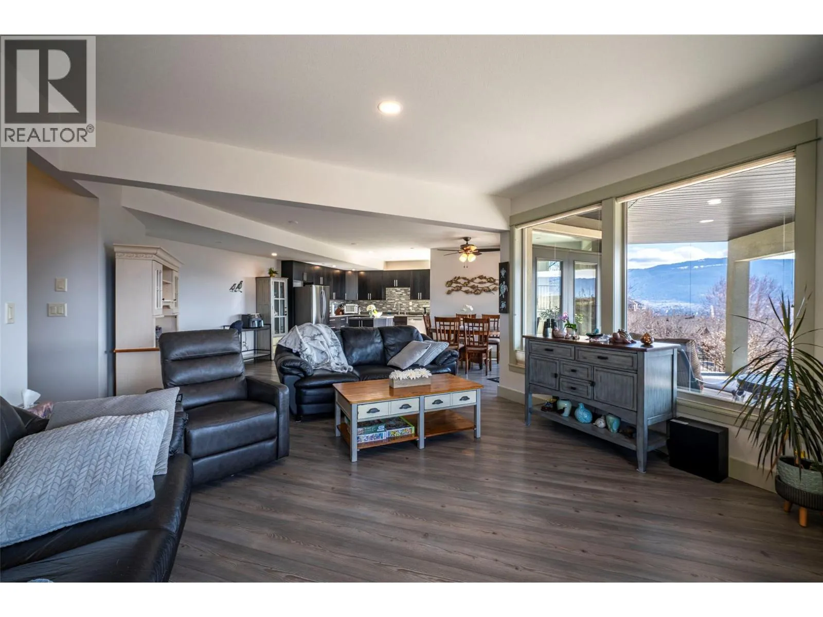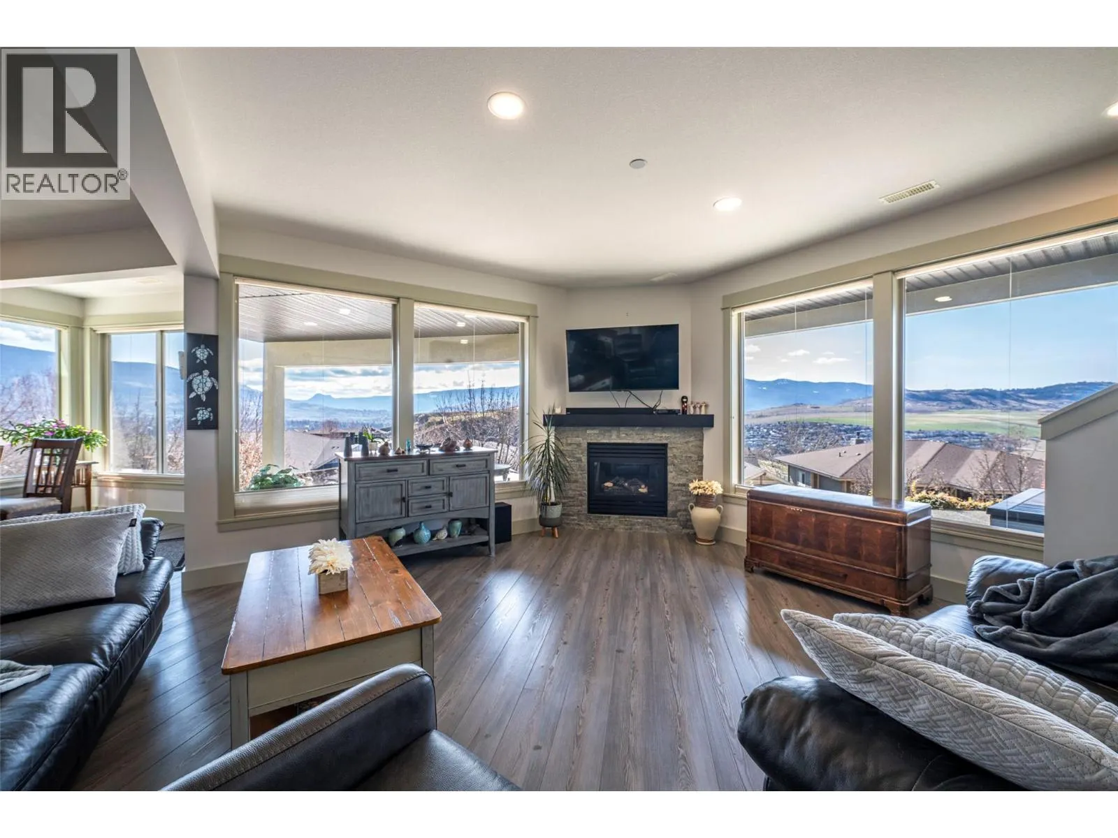 Welcome to desirable Turtle Mountain! Enjoy breathtaking, unobstructed valley and lake views from this custom built 4 bedroom, 3 bathroom home with a fully self contained in law suite, perfectly situated on a low maintenance lot. The main floor showcases a spacious kitchen featuring a gas range, Corian countertops, a 9 ft eating bar, and striking zebra wood veneer cabinetry. Adjacent to the kitchen is a bright eating nook with direct access to a covered patio and stamped concrete deck ideal for entertaining or relaxing while taking in the views. The living room impresses with a tray ceiling, hardwood floors, and a dramatic floor to ceiling stone gas fireplace. The primary bedroom offers private access to the covered deck, a full 5 piece ensuite, and a walk-in closet. A second bedroom or den, full bathroom, and convenient laundry complete the main level. Downstairs, youâll find a spacious 2 bedroom, 1 bath in law suite with a separate entrance and private patio perfect for extended family or added flexibility. Additional features include an oversized 22' x 26' double garage, central A/C, gas furnace, new gas hot water tank, water softener, and charming timber frame accents. Located close to shopping, city services, and miles of walking and biking trails, this home is ideal for young families, multi generational living, or urban professionals seeking comfort, style, and views. (id:27476)
