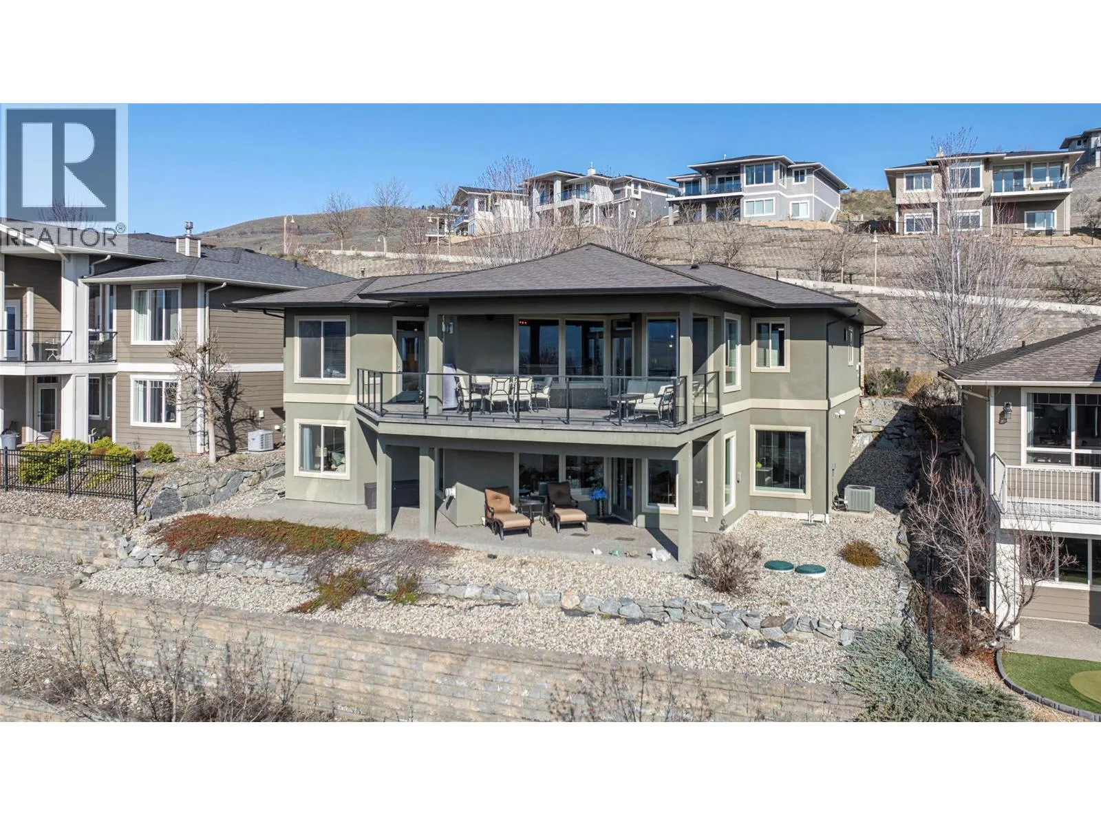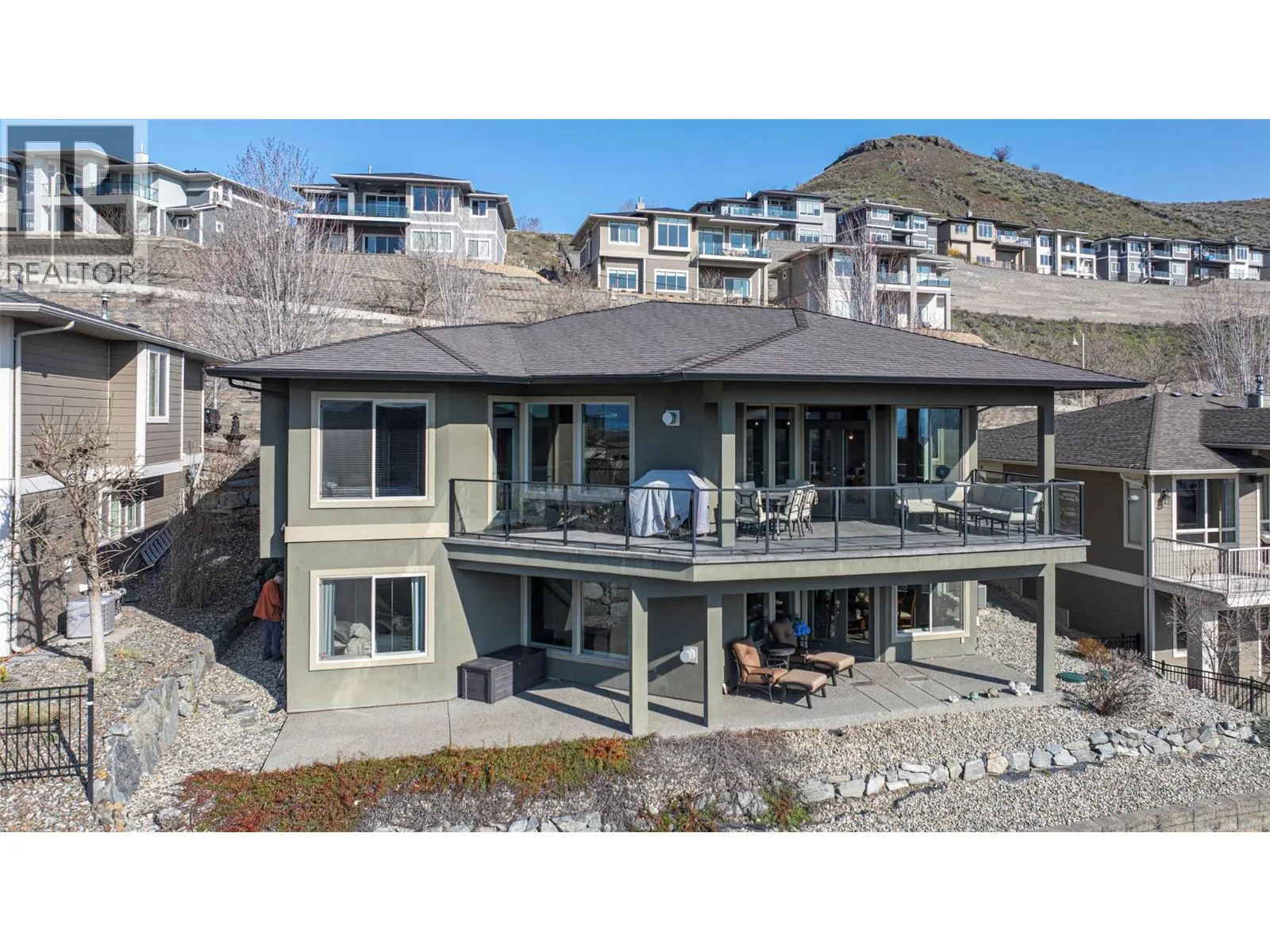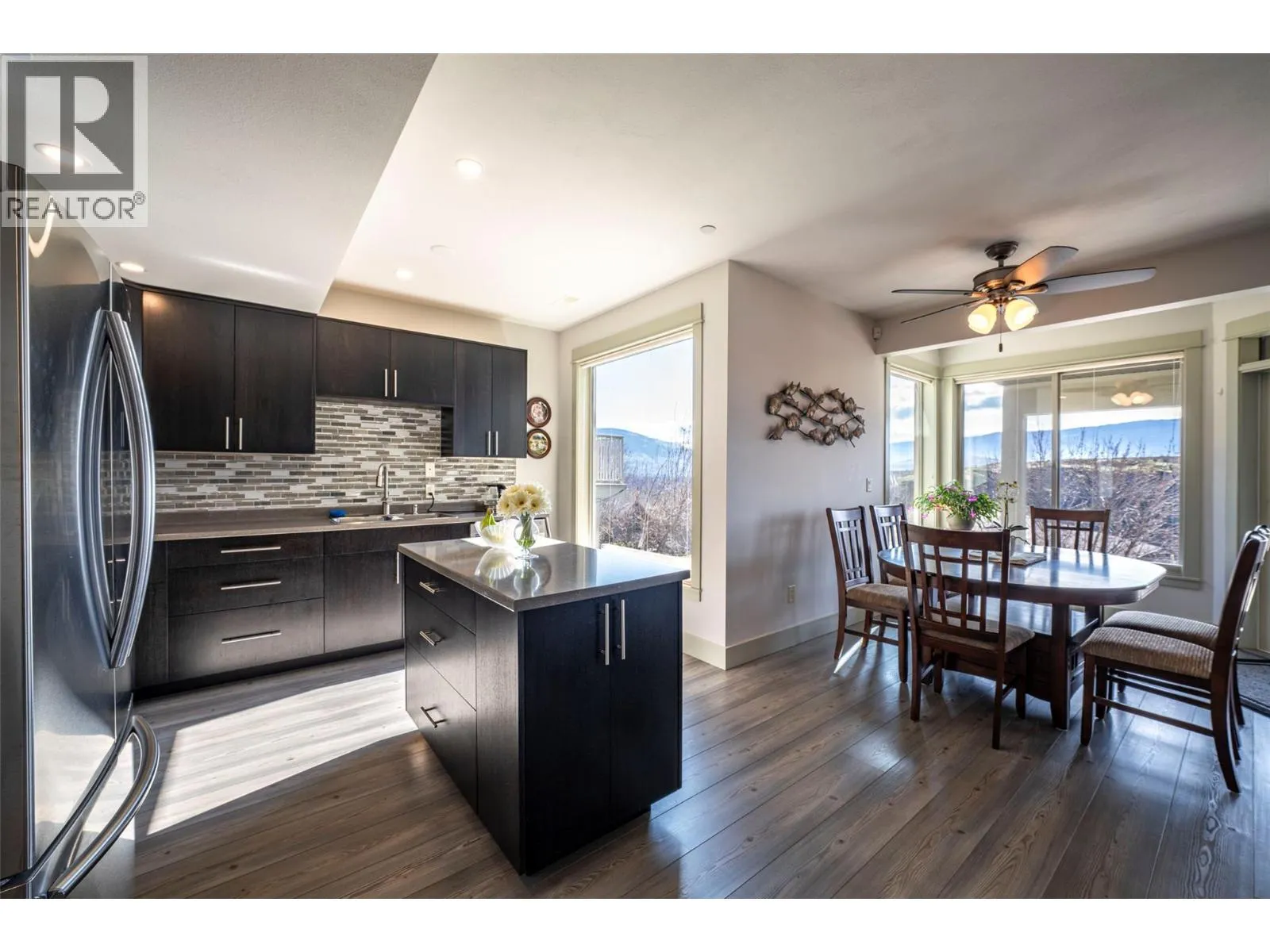 Welcome to desirable Turtle Mountain! Enjoy breathtaking, unobstructed valley and lake views from this custom built 4 bedroom, 3 bathroom home with a fully self contained in law suite, perfectly situated on a low maintenance lot. The main floor showcases a spacious kitchen featuring a gas range, Corian countertops, a 9 ft eating bar, and striking zebra wood veneer cabinetry. Adjacent to the kitchen is a bright eating nook with direct access to a covered patio and stamped concrete deck ideal for entertaining or relaxing while taking in the views. The living room impresses with a tray ceiling, hardwood floors, and a dramatic floor to ceiling stone gas fireplace. The primary bedroom offers private access to the covered deck, a full 5 piece ensuite, and a walk-in closet. A second bedroom or den, full bathroom, and convenient laundry complete the main level. Downstairs, youâll find a spacious 2 bedroom, 1 bath in law suite with a separate entrance and private patio perfect for extended family or added flexibility. Additional features include an oversized 22' x 26' double garage, central A/C, gas furnace, new gas hot water tank, water softener, and charming timber frame accents. Located close to shopping, city services, and miles of walking and biking trails, this home is ideal for young families, multi generational living, or urban professionals seeking comfort, style, and views. (id:27476)