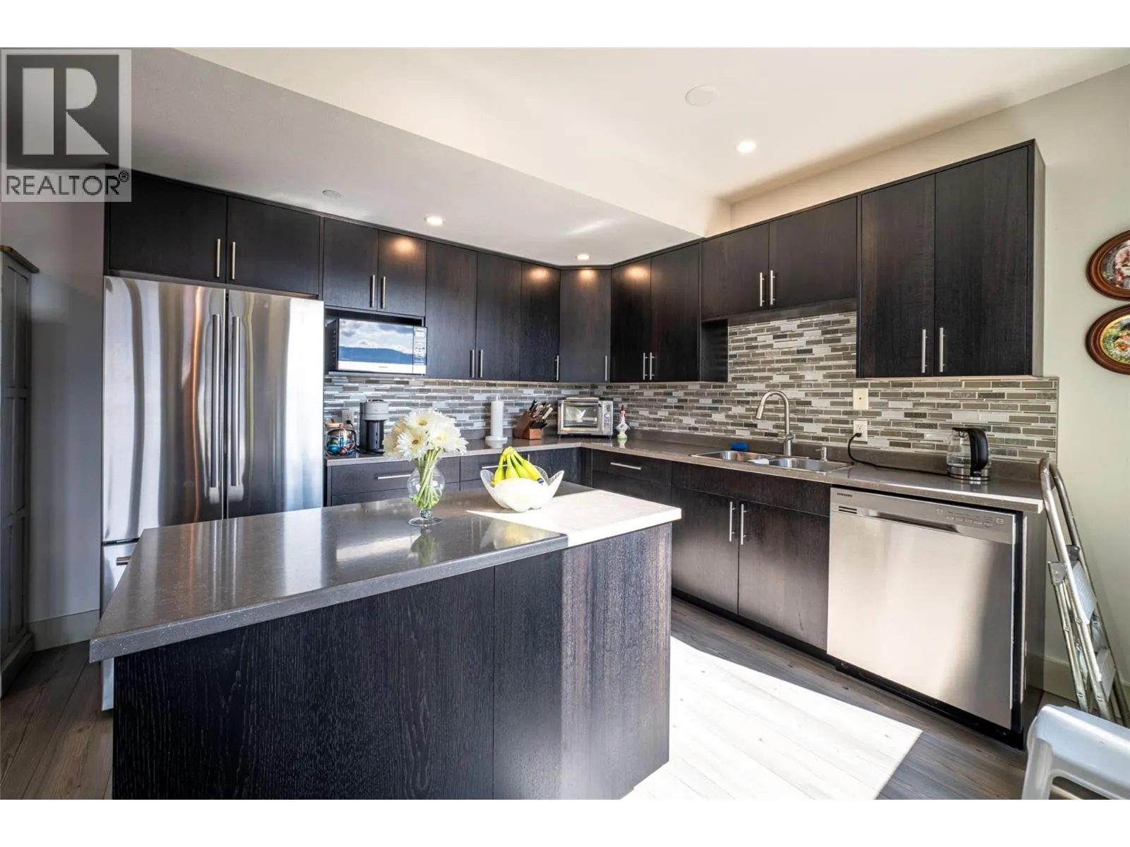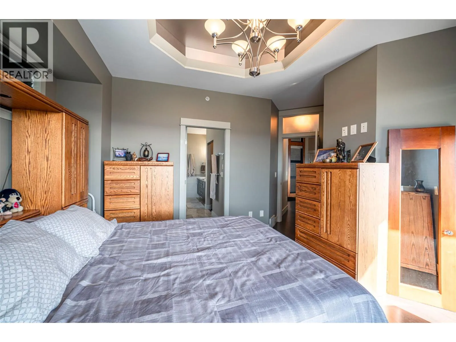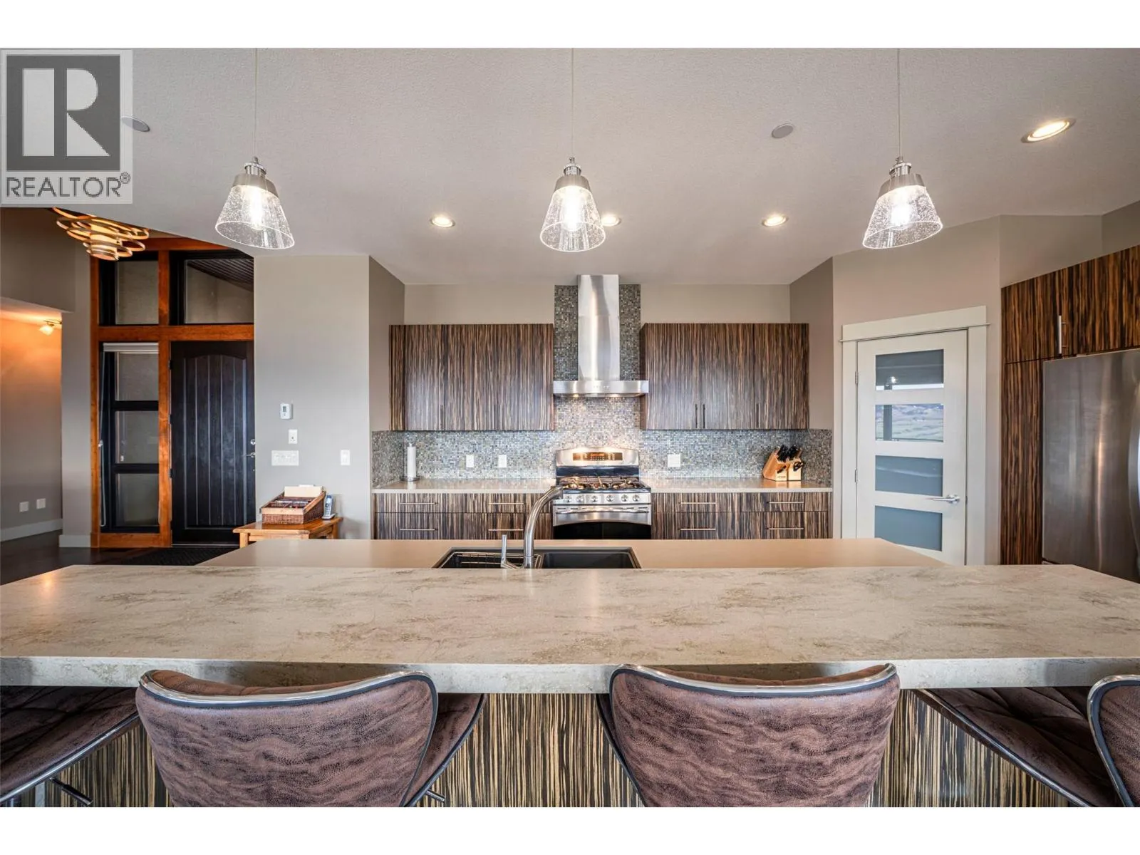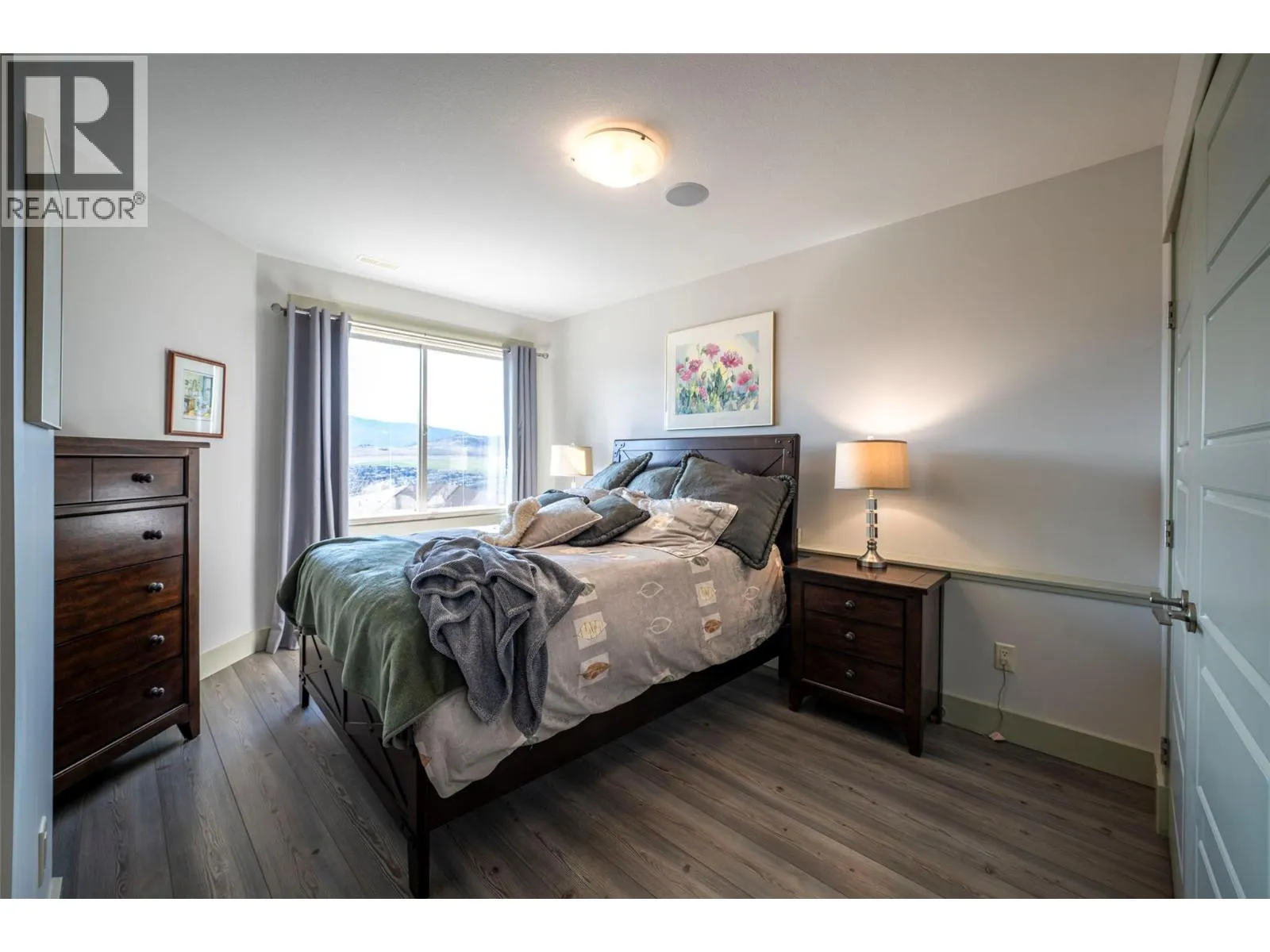 Welcome to desirable Turtle Mountain! Enjoy breathtaking, unobstructed valley and lake views from this custom built 4 bedroom, 3 bathroom home with a fully self contained in law suite, perfectly situated on a low maintenance lot. The main floor showcases a spacious kitchen featuring a gas range, Corian countertops, a 9 ft eating bar, and striking zebra wood veneer cabinetry. Adjacent to the kitchen is a bright eating nook with direct access to a covered patio and stamped concrete deck ideal for entertaining or relaxing while taking in the views. The living room impresses with a tray ceiling, hardwood floors, and a dramatic floor to ceiling stone gas fireplace. The primary bedroom offers private access to the covered deck, a full 5 piece ensuite, and a walk-in closet. A second bedroom or den, full bathroom, and convenient laundry complete the main level. Downstairs, youâll find a spacious 2 bedroom, 1 bath in law suite with a separate entrance and private patio perfect for extended family or added flexibility. Additional features include an oversized 22' x 26' double garage, central A/C, gas furnace, new gas hot water tank, water softener, and charming timber frame accents. Located close to shopping, city services, and miles of walking and biking trails, this home is ideal for young families, multi generational living, or urban professionals seeking comfort, style, and views. (id:27476)