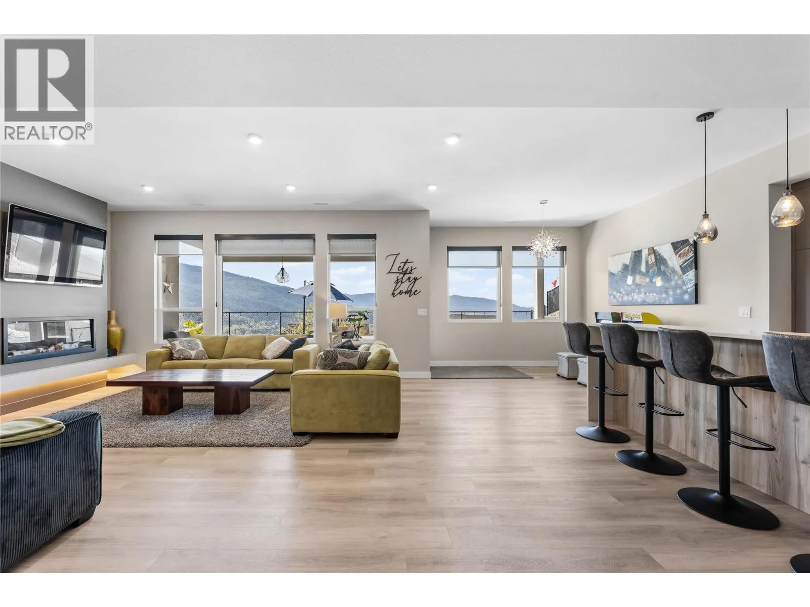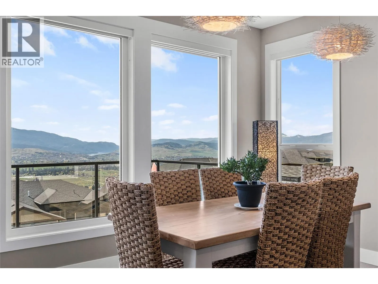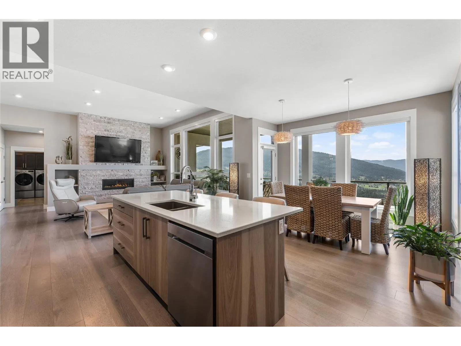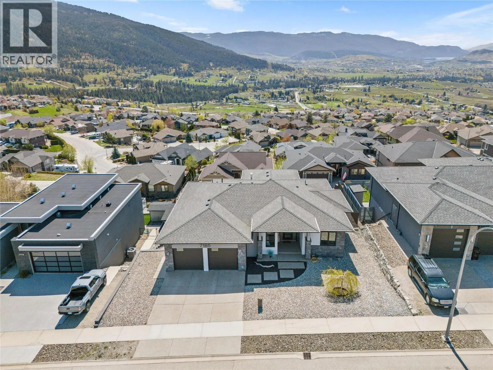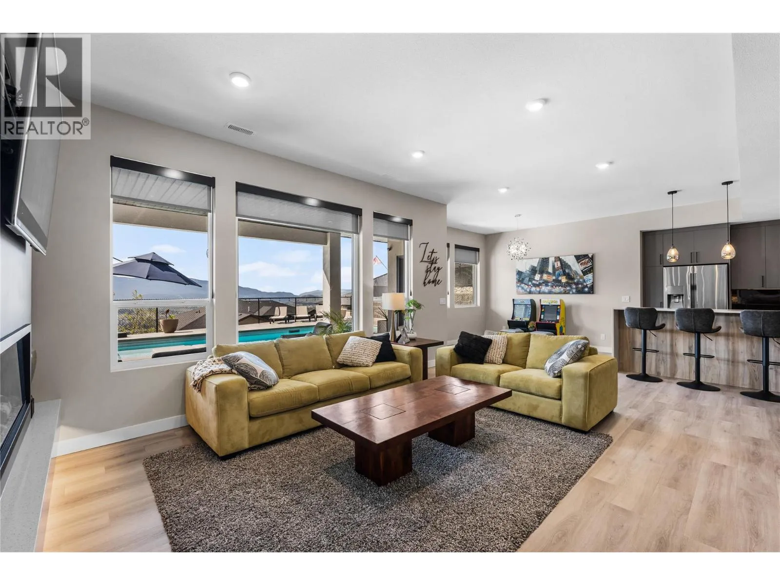 What most people envision for their dream Okanagan lifestyle; this contemporary home is designed to take full advantage of its elevated setting, with striking views of the surrounding mountains, lakes, and valley. The main floor features an open, airy layout with 11-foot ceilings, expansive windows, and direct access to a large covered deck ideal for morning coffee or maybe an evening glass of wine from a local Okanagan winery. The kitchen blends form and function with quartz countertops, stainless steel appliances, and clean-lined maple cabinetry. The primary bedroom offers a peaceful retreat with a walk-in closet and ensuite, complete with a freestanding soaker tub and custom tiled shower. An oversized second bedroom, a versatile den or third bedroom, and a well-appointed laundry room with built-in bench and storage round out the main level. Downstairs, the walk-out lower level with 10-foot ceilings provides exceptional flexibility, featuring a media room, games area, gym, wet bar, additional bedroom and spa inspired full bathroom. Outdoors, the fully automated saltwater pool with new liner and safety cover is paired with low-maintenance Synlawn turf and a custom storage shed. An oversized double garage and generous extra parking accommodate vehicles, trailers, boats, or RVs. You can be on the ski hill, hiking trails, golf course or lake all within a short drive from home. (id:27476)
