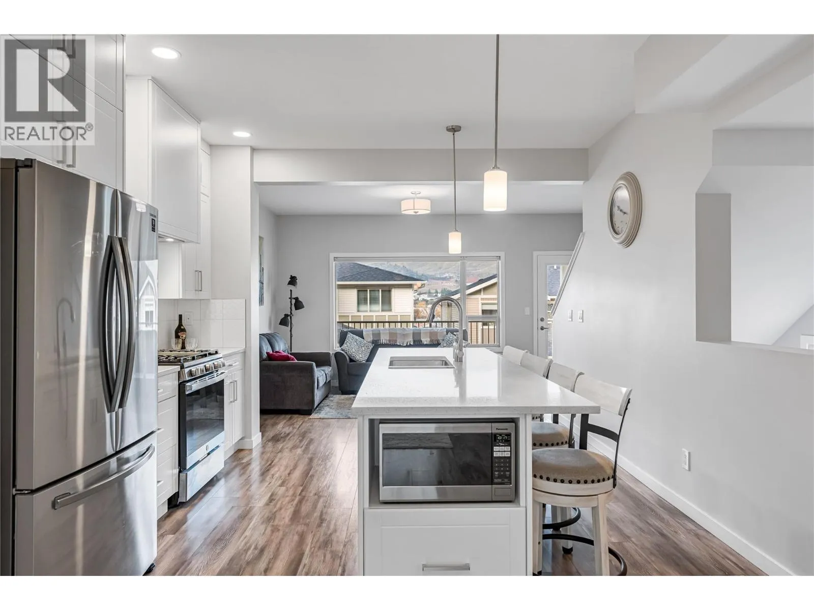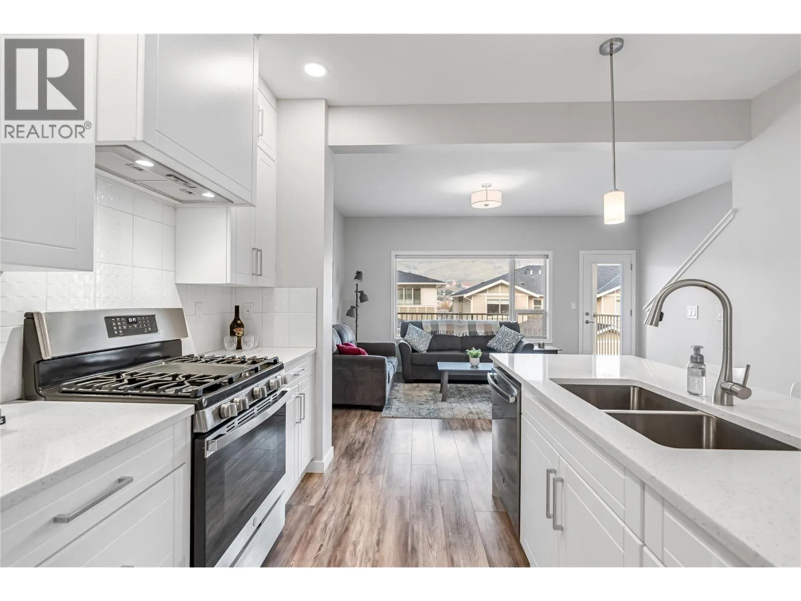 True end-unit! Thoughtfully designed and like new, this stylish townhouse is ideally located in the family friendly Mission Hill neighbourhood, just minutes from Okanagan Lake, two beaches, pickleball courts, and a nearby dog park, with excellent shopping and amenities close at hand. World-class golf courses are only a short 15-minute drive away. The main level welcomes you with high ceilings and an open-concept kitchen, dining, and living space that feels calm, bright, and inviting, enhanced by stainless steel appliances, quartz countertops and open valley views. A convenient powder room completes this floor, making it perfect for both everyday living and entertaining. Step onto your patio to enjoy a morning coffee or maybe a glass of wine from a local Okanagan Vineyard. Upstairs, the spacious primary retreat features a walk-in closet and a private ensuite, while a second bedroom also enjoys its own ensuite. Upstairs laundry adds everyday ease and functionality. Outside, the private backyard offers a covered patio, low-maintenance turf, and exceptional privacy ideal for relaxing or enjoying time with pets. A tandem garage provides secure storage for all your Okanagan lifestyle gear. Pet-friendly, move-in ready, and effortlessly livable. (id:27476)
