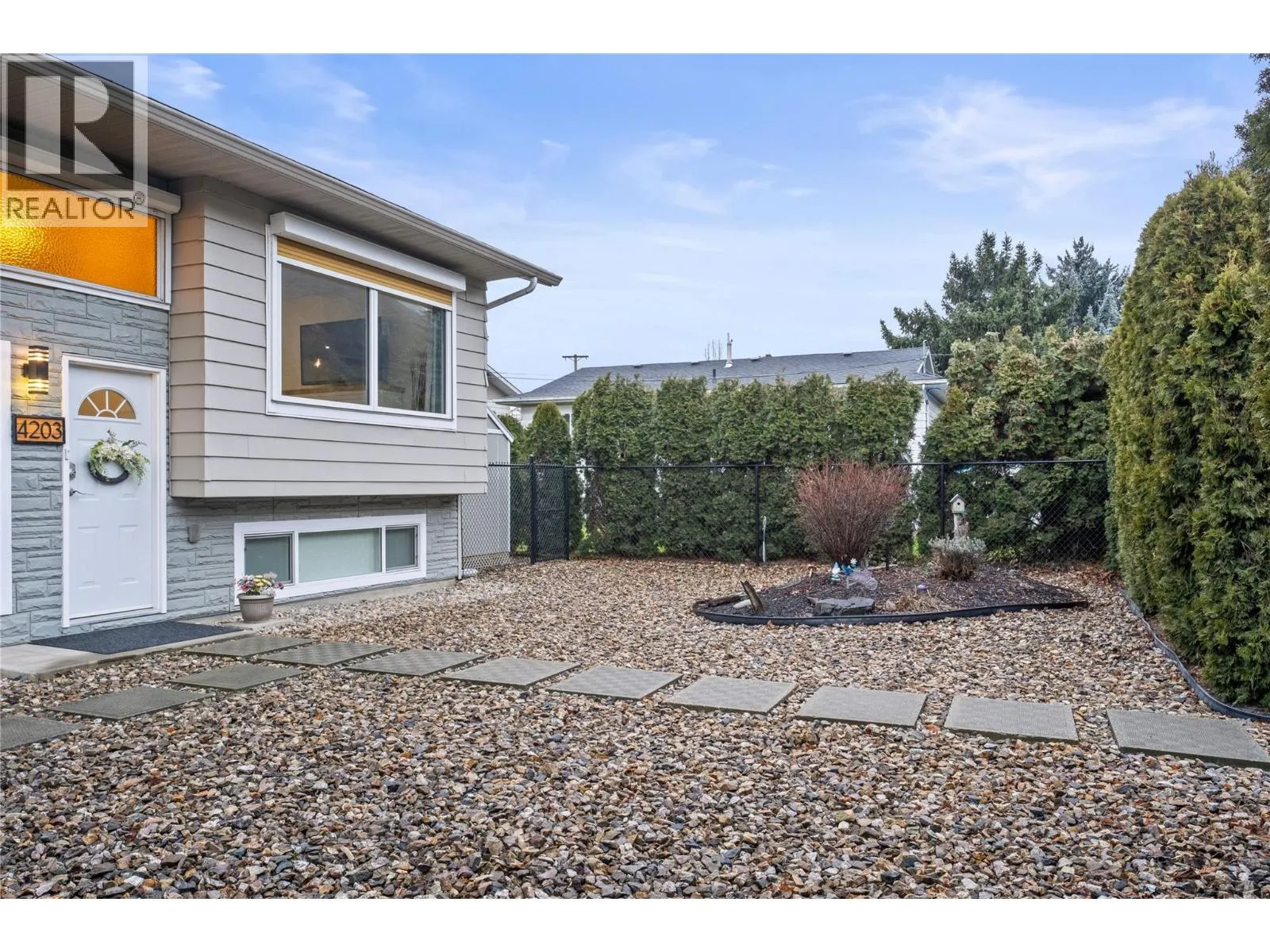 Welcome to 4203 Alexis Park Drive, a thoughtfully renovated home offering flexibility, comfort, and low-maintenance living in a well-located Vernon neighbourhood. This property features two fully self-contained living spaces, ideal for extended family, rental income, or those seeking a mortgage helper, while still functioning as a single cohesive residence. Both levels have been extensively updated with modern kitchens, in-suite laundry, quality finishes, and excellent separation between living areas. Outside, enjoy low-maintenance, xeriscaped landscaping, irrigation, and newer fencing, along with a wired 10â x 12â workshop and a separate 6â x 8â wooden storage shed, providing valuable space for equipment, hobbies, or additional storage. The location supports an active and convenient lifestyle. The home is within walking distance to the new Recreation Centre, the Grey Canal trail system, Alexis Park Elementary School, shopping, restaurants, and transit, with Swan Lake Bird Sanctuary just minutes away. Easy access to parks, trails, and daily amenities makes this an ideal spot for those who value both convenience and outdoor recreation. With major upgrades already completed and a strong rental component in place, this is a turnkey opportunity offering versatility, income potential, and long-term value in an established Vernon neighbourhood. (id:27476)