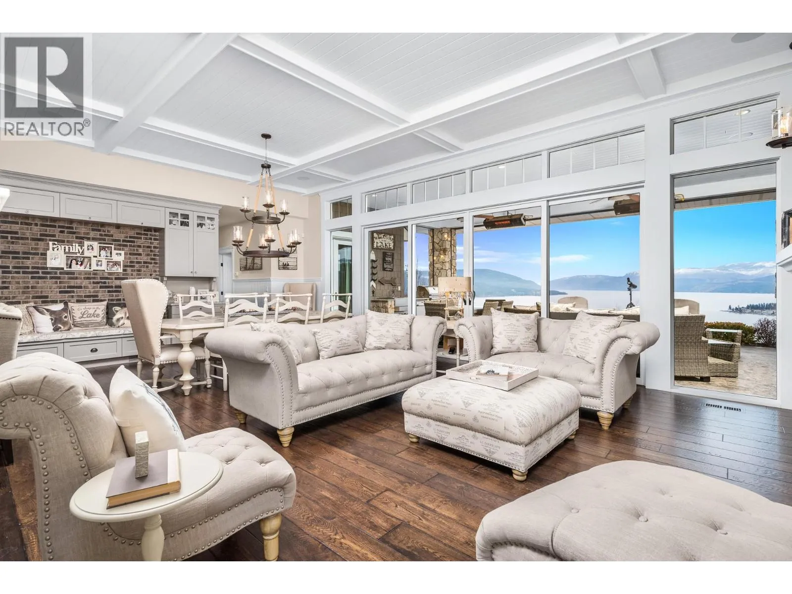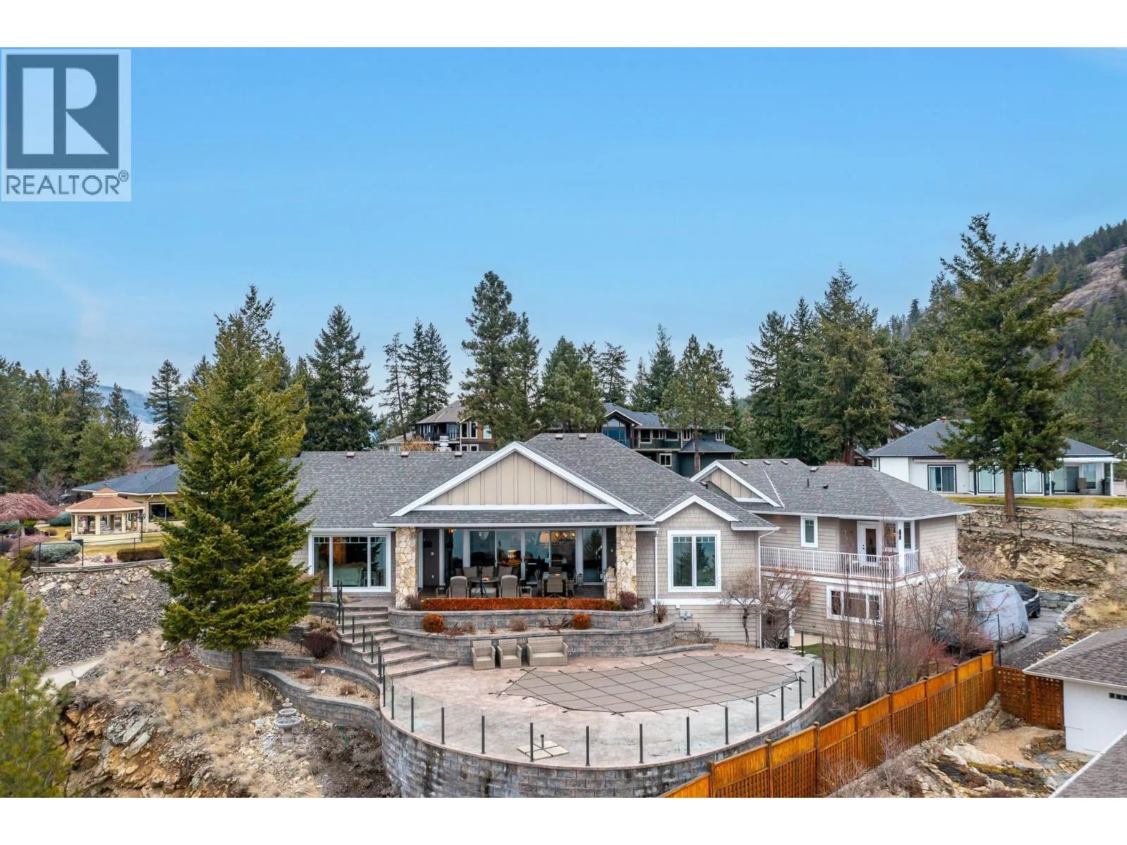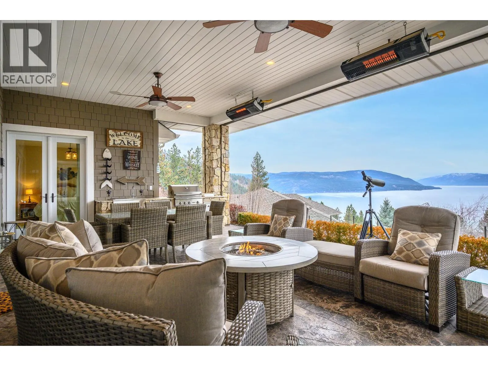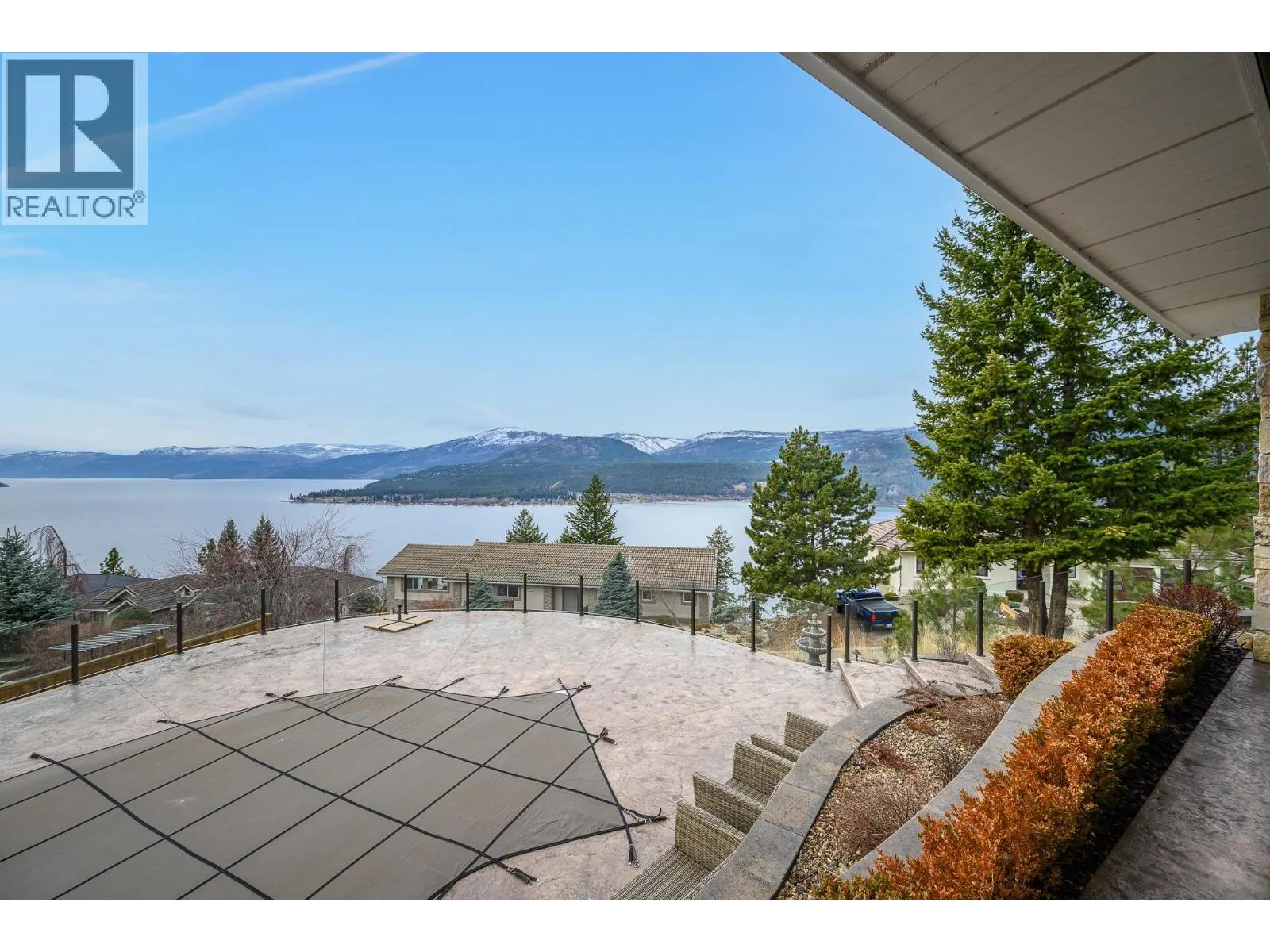 The perfect collaborationâwhen everything comes together: thoughtful design, elegant decor, supreme comfort, inspirational views, the pool, the patios, the four-car garage, and the theatre room! Located off a quiet lane, this home truly has it allâdesigned to maximize spectacular Okanagan Lake views and privacy. The level-entry main floor features a great room that seamlessly incorporates a dream kitchen with entertainment bar, a spacious dining area, and a gathering area centered around a classic gas fireplace. Nano doors open to the covered patio with summer kitchen and automated screens. Just steps away, the lower patio and heated saltwater pool await! The primary suite is set apart from the other two bedrooms, while guests enjoy a private suite complete with breakfast bar, full bath, and private deck. A fully equipped theatre room with wet bar and fireplace adds luxury and convenience. Additional features include two heating & cooling systems, instant hot water, hardwood floors, and elevated beamed ceilings. The lower garage is heated and comes with a workshop with 400lb hoist. Upper garage with pet wash. RV parking includes 30-amp service. Residents of Canadian Lakeview enjoy access to a private beach, complete with boat launch, dock, and bath/changing rooms. A private BOUY is already in place for your boat! (id:27476)