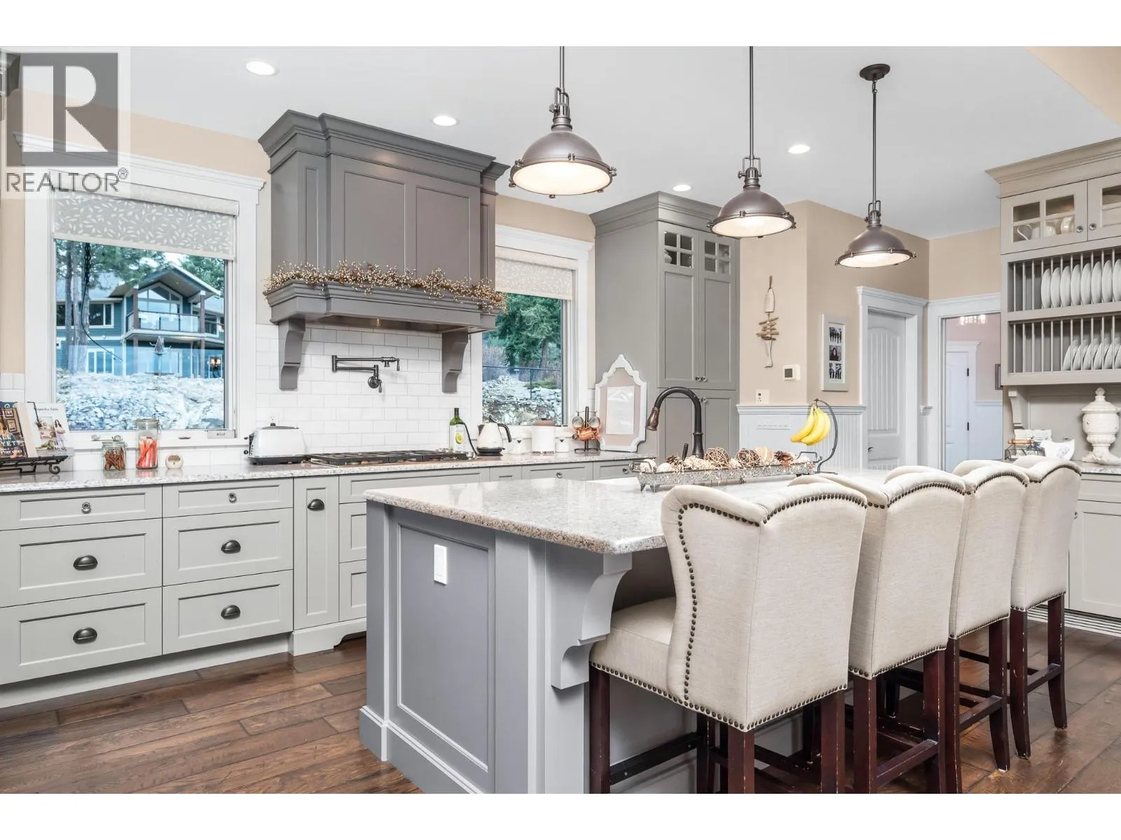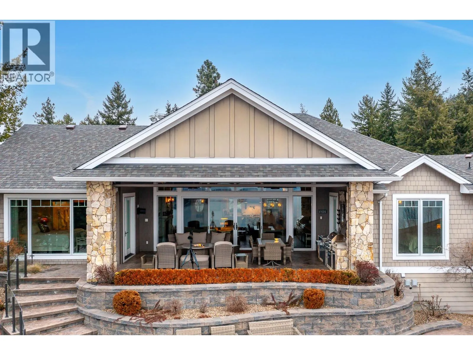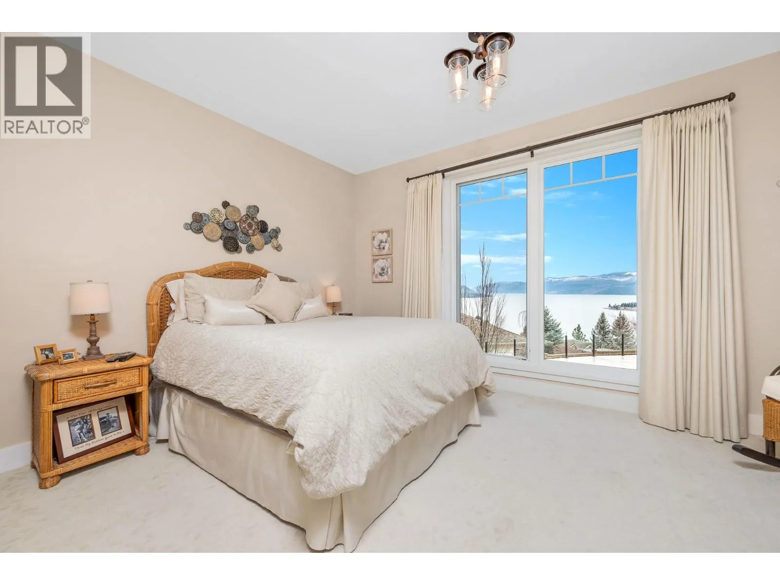 The perfect collaborationâwhen everything comes together: thoughtful design, elegant decor, supreme comfort, inspirational views, the pool, the patios, the four-car garage, and the theatre room! Located off a quiet lane, this home truly has it allâdesigned to maximize spectacular Okanagan Lake views and privacy. The level-entry main floor features a great room that seamlessly incorporates a dream kitchen with entertainment bar, a spacious dining area, and a gathering area centered around a classic gas fireplace. Nano doors open to the covered patio with summer kitchen and automated screens. Just steps away, the lower patio and heated saltwater pool await! The primary suite is set apart from the other two bedrooms, while guests enjoy a private suite complete with breakfast bar, full bath, and private deck. A fully equipped theatre room with wet bar and fireplace adds luxury and convenience. Additional features include two heating & cooling systems, instant hot water, hardwood floors, and elevated beamed ceilings. The lower garage is heated and comes with a workshop with 400lb hoist. Upper garage with pet wash. RV parking includes 30-amp service. Residents of Canadian Lakeview enjoy access to a private beach, complete with boat launch, dock, and bath/changing rooms. A private BOUY is already in place for your boat! (id:27476)