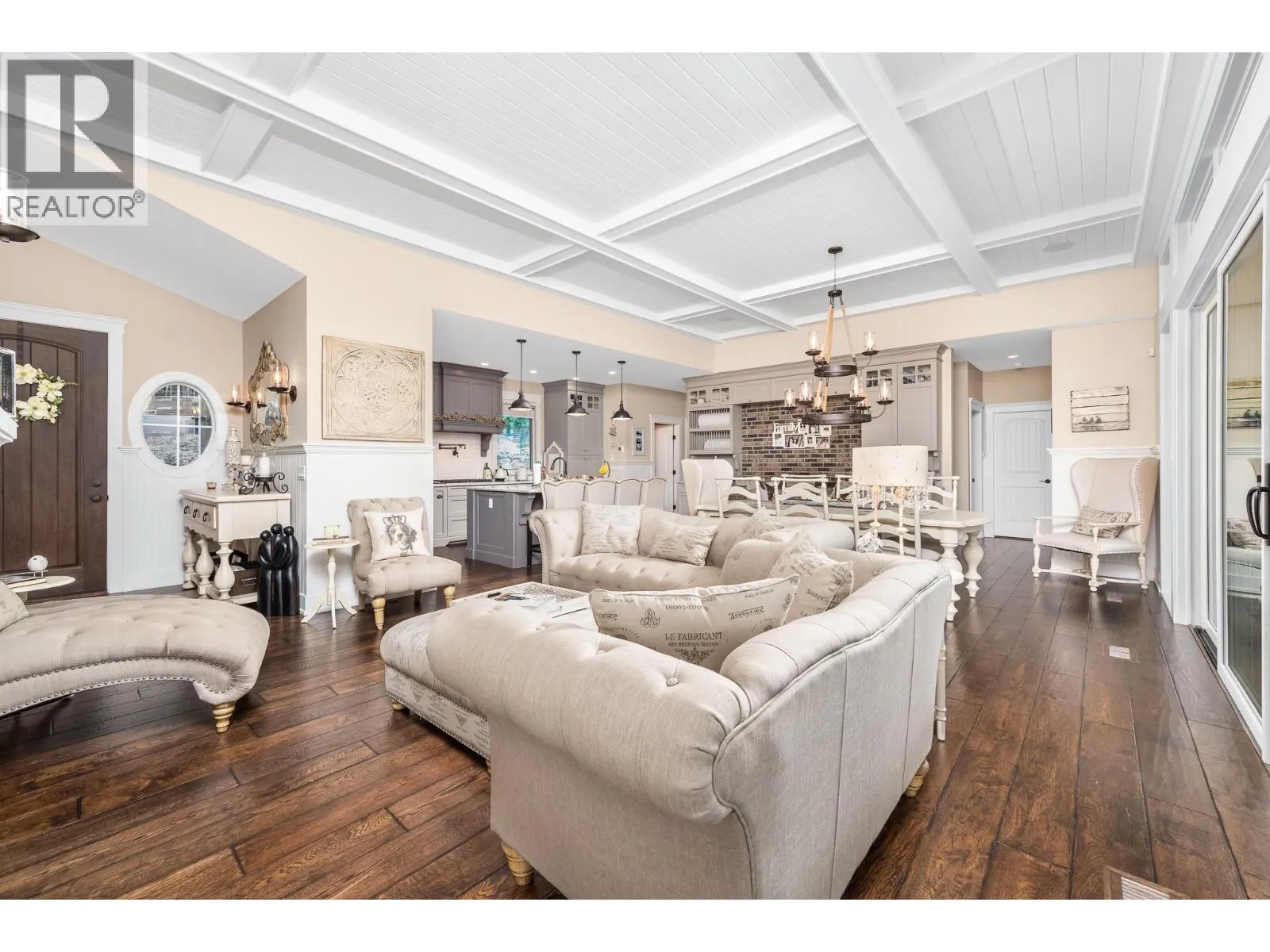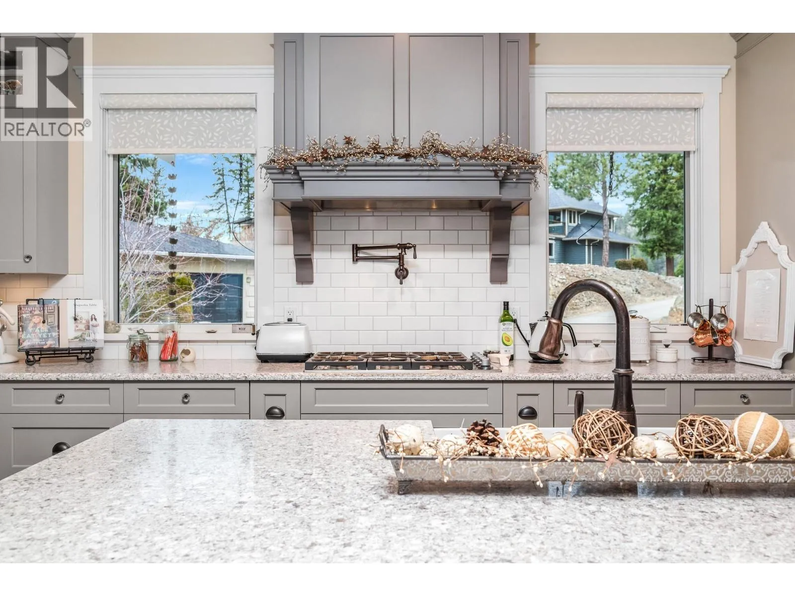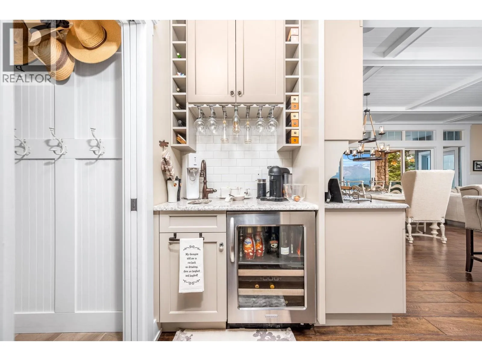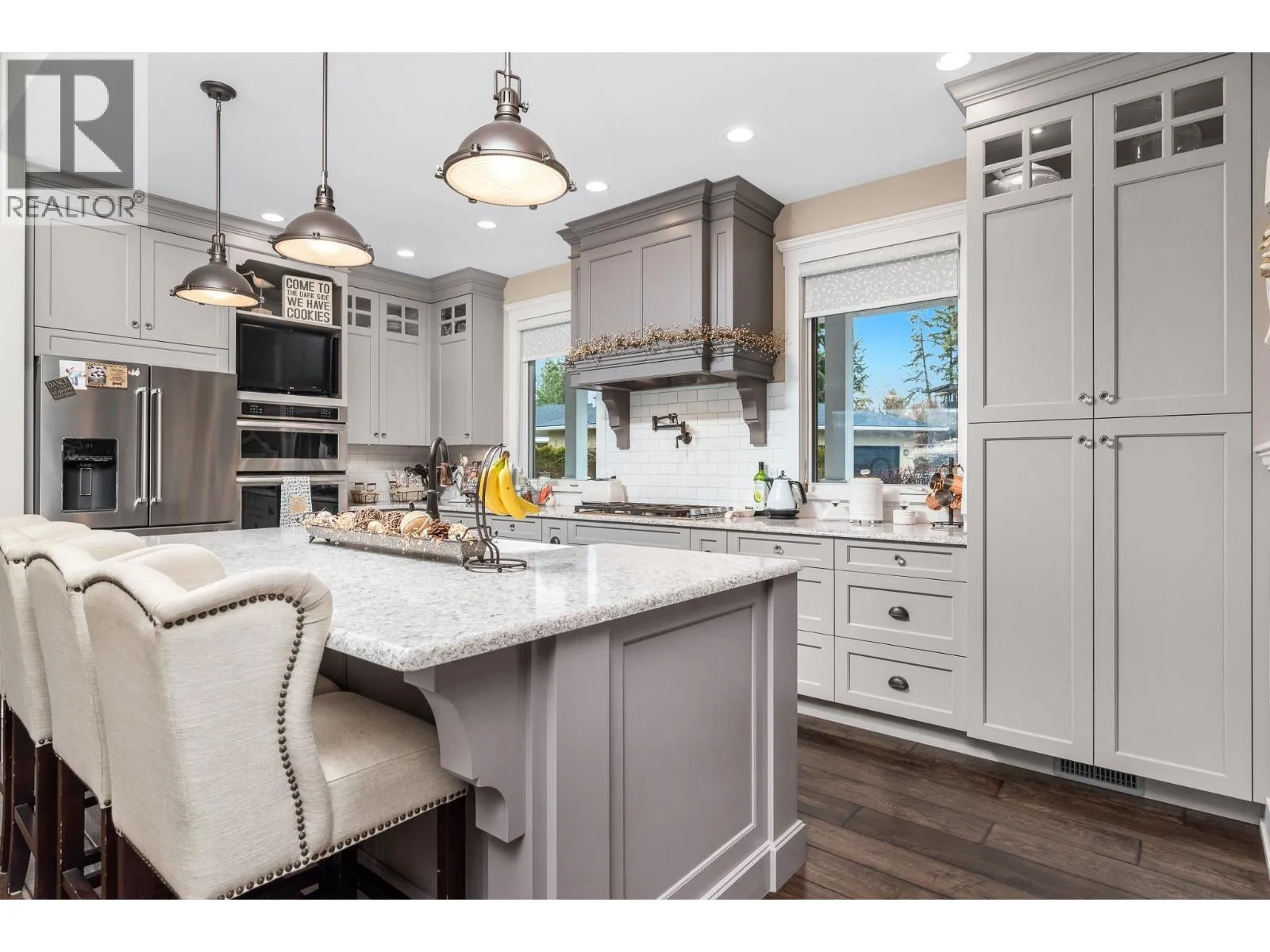 The perfect collaborationâwhen everything comes together: thoughtful design, elegant decor, supreme comfort, inspirational views, the pool, the patios, the four-car garage, and the theatre room! Located off a quiet lane, this home truly has it allâdesigned to maximize spectacular Okanagan Lake views and privacy. The level-entry main floor features a great room that seamlessly incorporates a dream kitchen with entertainment bar, a spacious dining area, and a gathering area centered around a classic gas fireplace. Nano doors open to the covered patio with summer kitchen and automated screens. Just steps away, the lower patio and heated saltwater pool await! The primary suite is set apart from the other two bedrooms, while guests enjoy a private suite complete with breakfast bar, full bath, and private deck. A fully equipped theatre room with wet bar and fireplace adds luxury and convenience. Additional features include two heating & cooling systems, instant hot water, hardwood floors, and elevated beamed ceilings. The lower garage is heated and comes with a workshop with 400lb hoist. Upper garage with pet wash. RV parking includes 30-amp service. Residents of Canadian Lakeview enjoy access to a private beach, complete with boat launch, dock, and bath/changing rooms. A private BOUY is already in place for your boat! (id:27476)