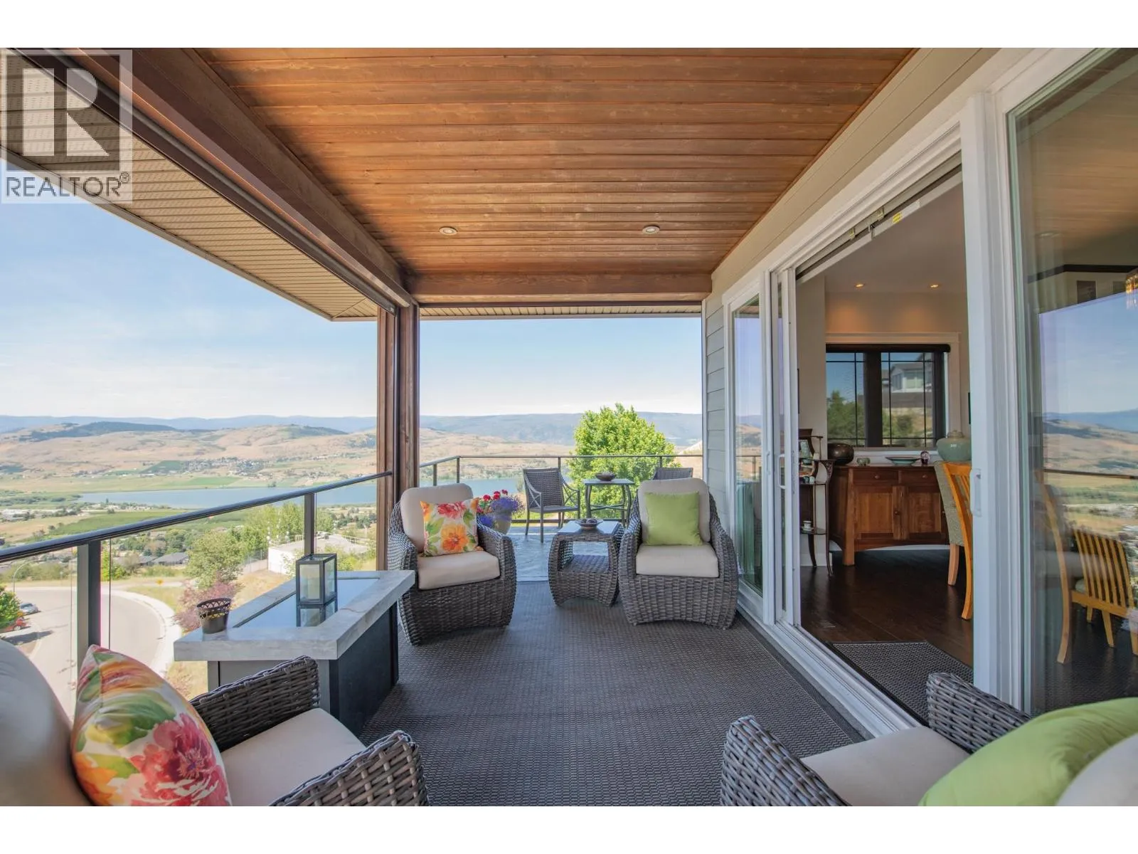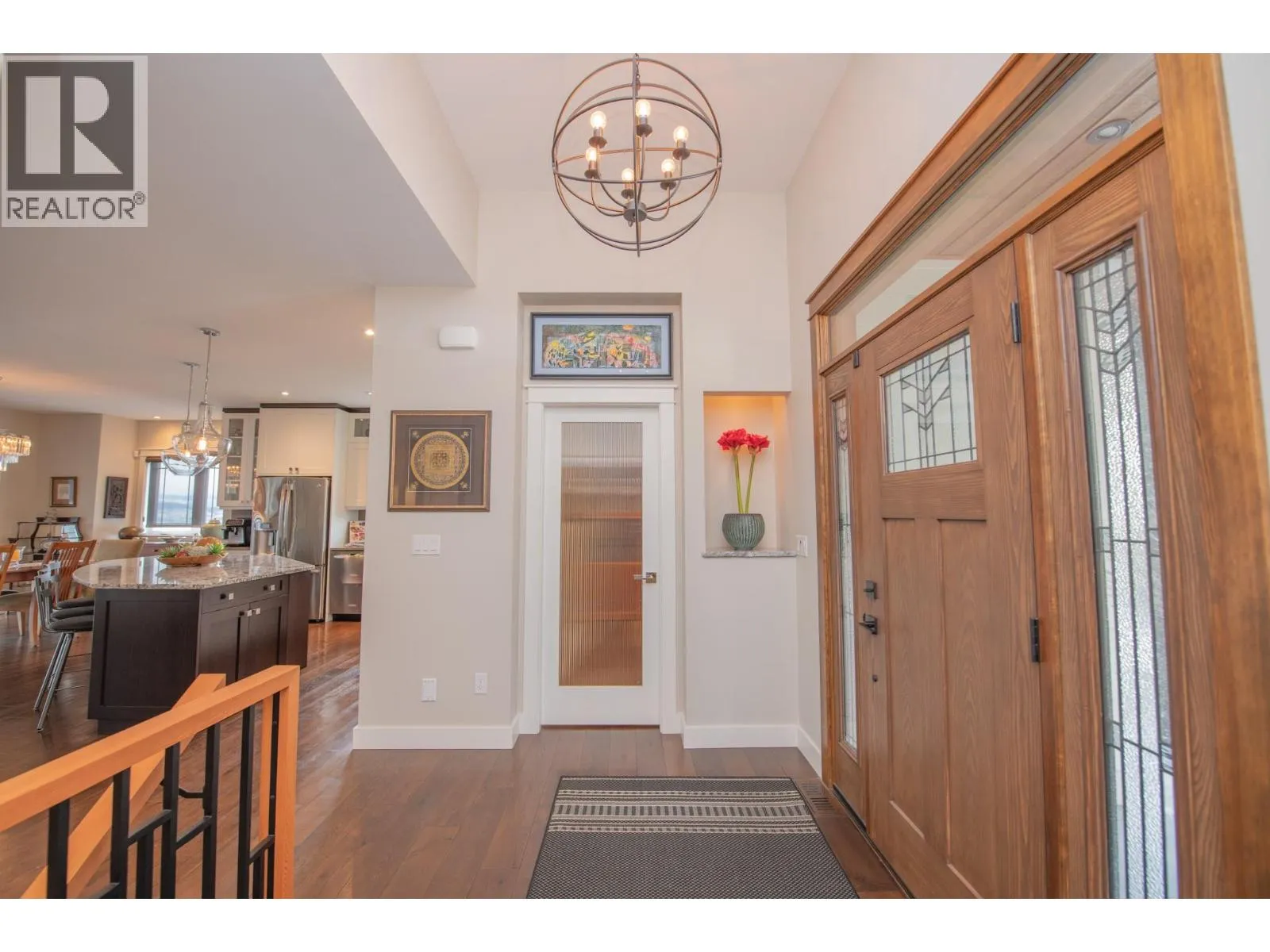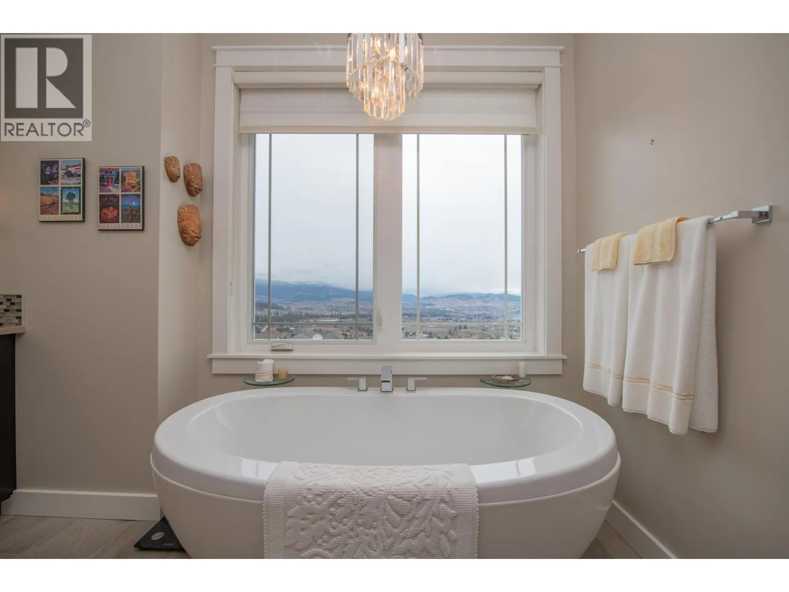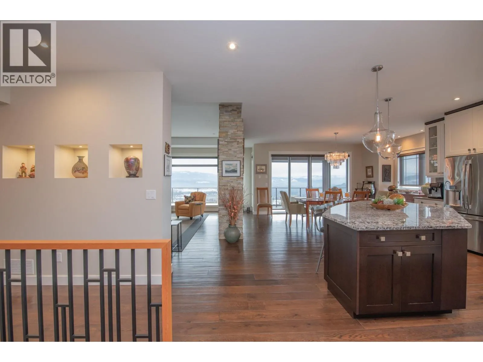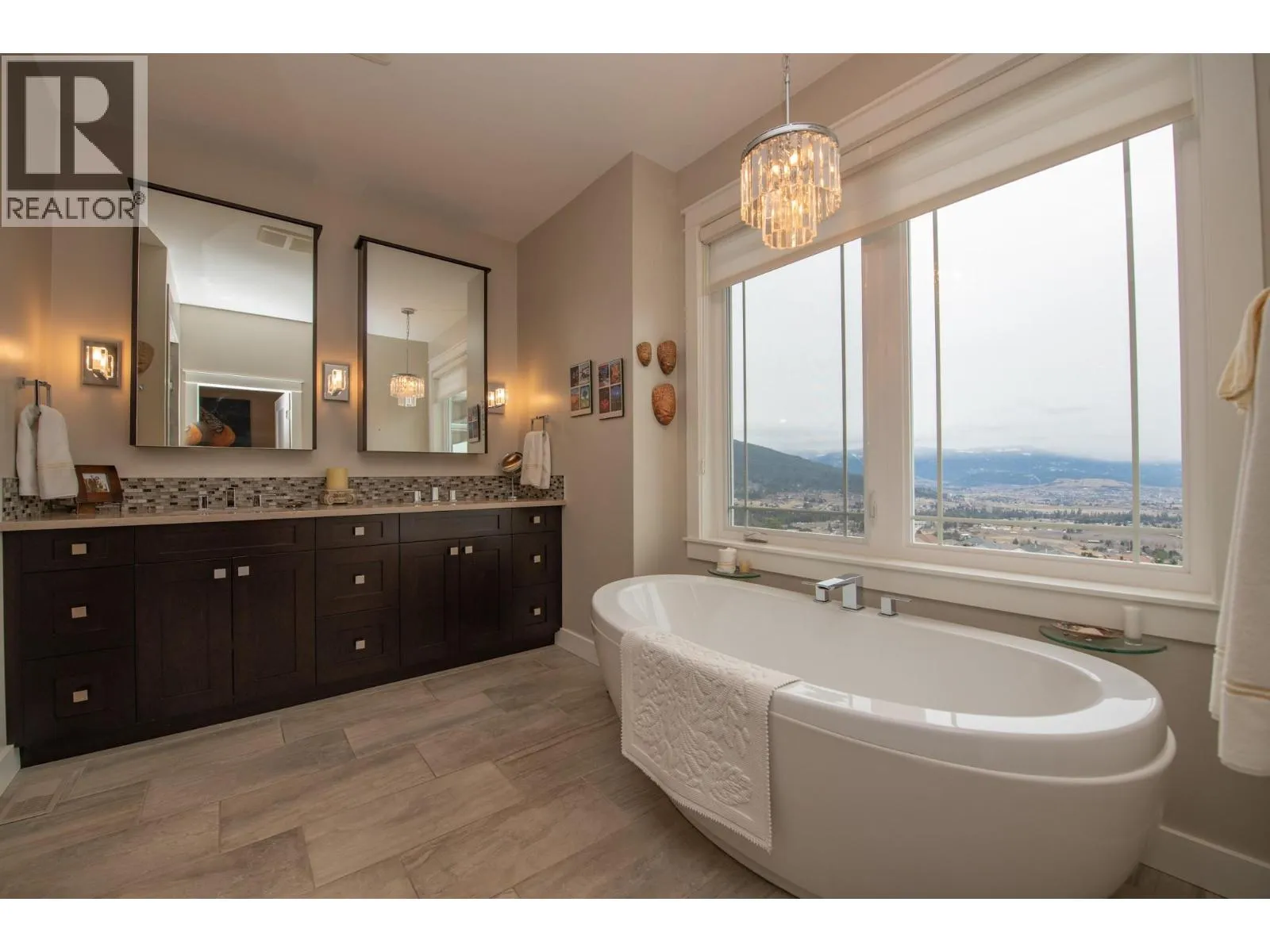 A custom-built rancher by Oakes Custom Homes, perfectly positioned to capture south-facing views of Vernonâs three lakes and Valley. Set on a private double lot of over half an acre, this home combines luxury living with custom details throughout.Inside, the open-concept design seamlessly connects the kitchen, dining, and living areasâideal for entertaining or everyday comfort. The chefâs kitchen features two-tone cabinetry, a granite island, quartz countertops, and stainless steel appliances. From both the dining and living areas there is a two way fire place and sliding doors lead to a screened-in patio with automated screens, to enjoy the stunning views. The primary suite offers a walk-in closet and spa-inspired ensuite with in-floor heating, a standalone soaker tub, double vanity, and a glass walk-in shower. Additionally youâll find a versatile office/den and a two-piece powder room.A custom steel staircase brings you to the lower level, where a cozy living room and sleek wet bar await. Two bedrooms, a full guest bath, and a flexible bonus roomâperfect as a bedroom, exercise space, or craft room. The fully landscaped grounds feature low-maintenance plants with drip irrigation, a hot tub, fire pit area, and space for a pool. RV parking, security system with flood sensors. Immaculately maintained home that showcases custom craftsmanship at every turn. Donât miss the opportunity to enjoy luxury living and unmatched views in one of Vernonâs most desirable settings. (id:27476)
