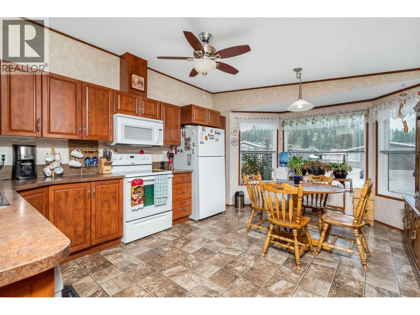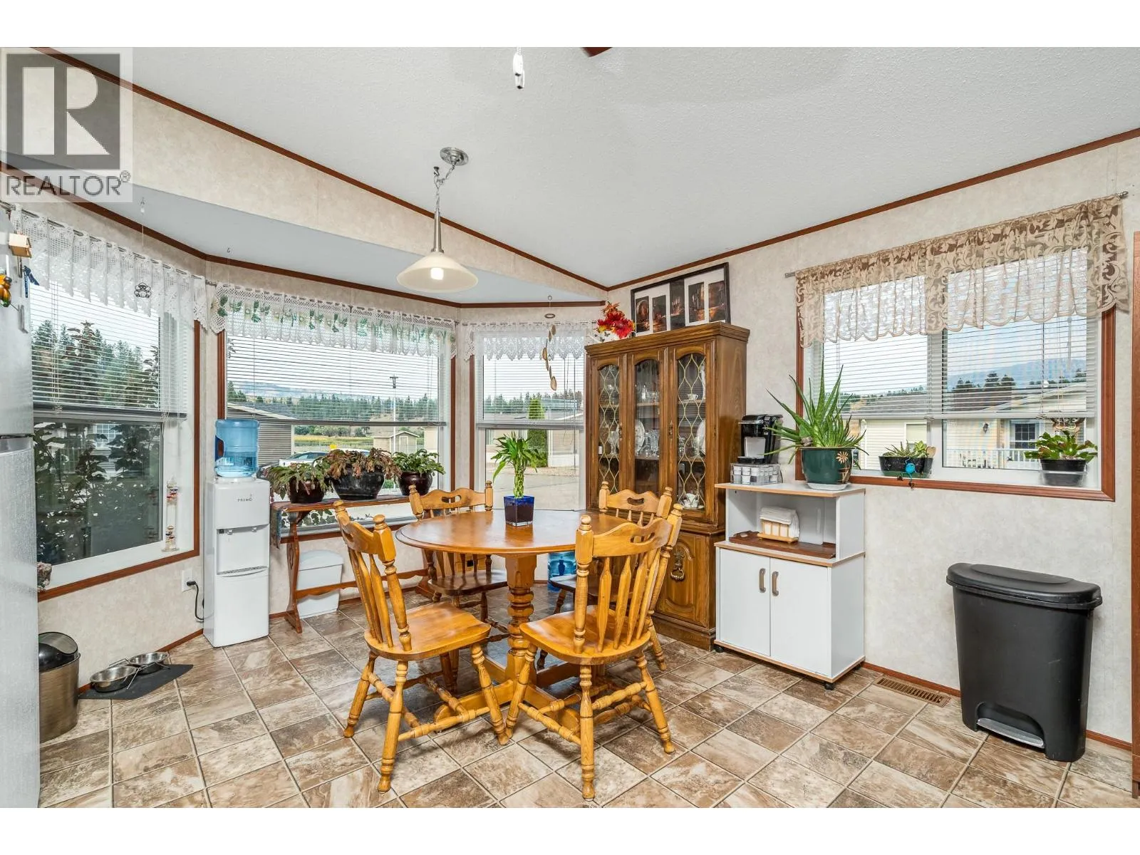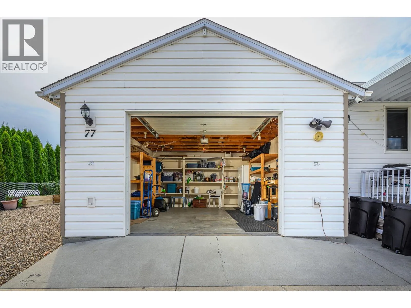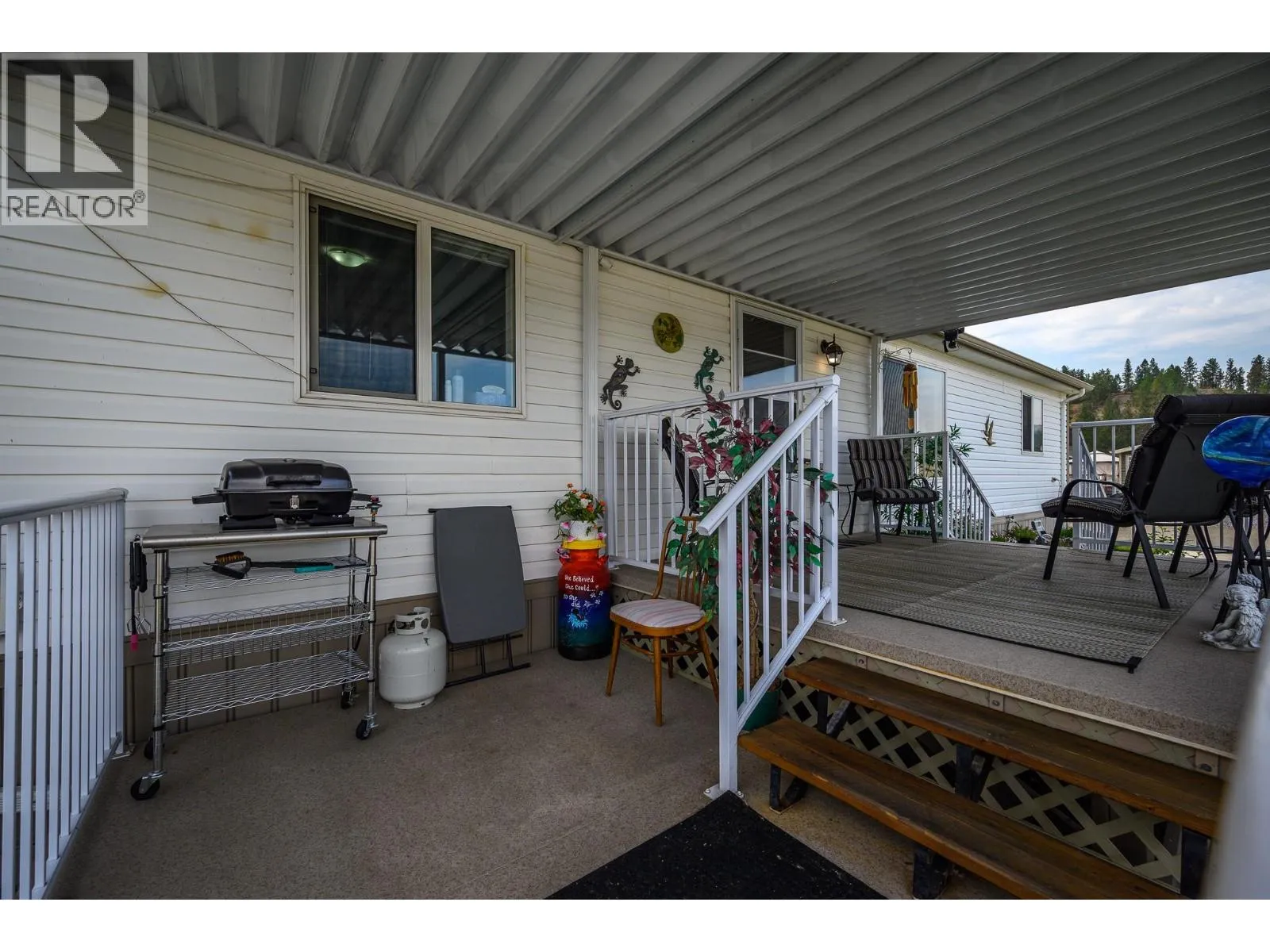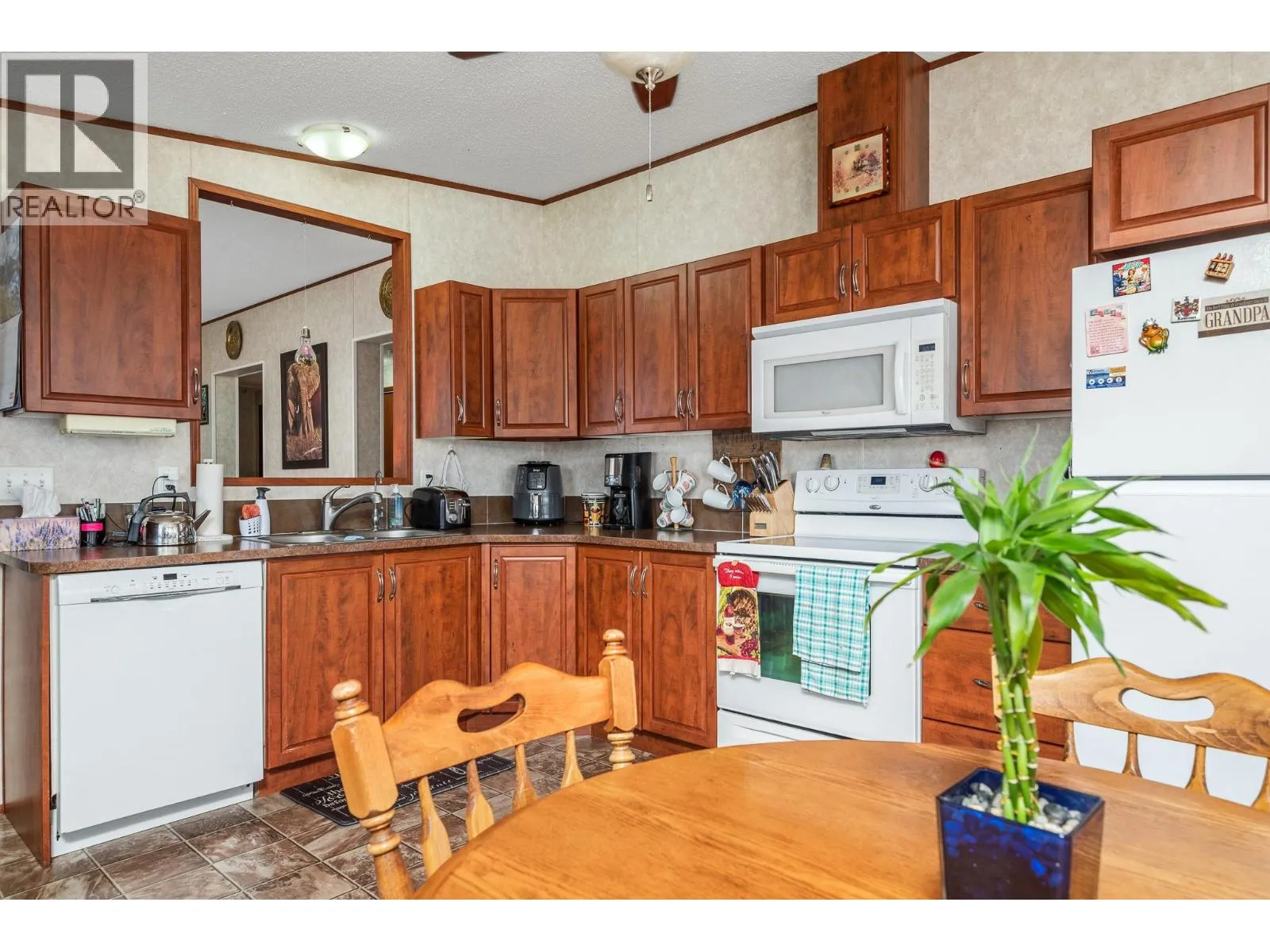 This extremely well maintained 2010 built double-wide manufactured home has a single detached garage, two paved driveways, and space for an RV or boat! This unit is nestled in the centre of the park, away from any noise from Westside Road or Highway 97. With three large bedrooms, and two full bathrooms, there is plenty of space for a family as this park has no age restrictions. The kitchen is open and bright, with lots of additional storage and a cozy dining nook that overlooks the quiet street. People watch and enjoy getting to know your neighbors in this friendly park. The master bedroom sits on one end of the home, providing privacy between you and your family members or guests. The ensuite bathroom includes a low barrier walk-in shower and nice finishes. Entertaining on the covered, multi-level deck out front is a breeze. Bring your kids or furry friends (2 pets allowed up to 25 lbs) and enjoy the low maintenance yard with a nice mix of grass and rock. In addition to the 18X20 garage with plenty of storage space, there are two large sheds with updated flooring for better support and stability. Plenty of updates have been done over the years including a newer 'York' central air conditioner, brand new hot water tank (Feb 2026), newer deck, cover, and back steps, garden beds, and newer flooring in living room plus more! Coyote Crossing is an extremely well maintained park only 10 minutes to the North End of Vernon, and 2 minutes to Spallumcheen Golf Course. Welcome home! (id:27476)