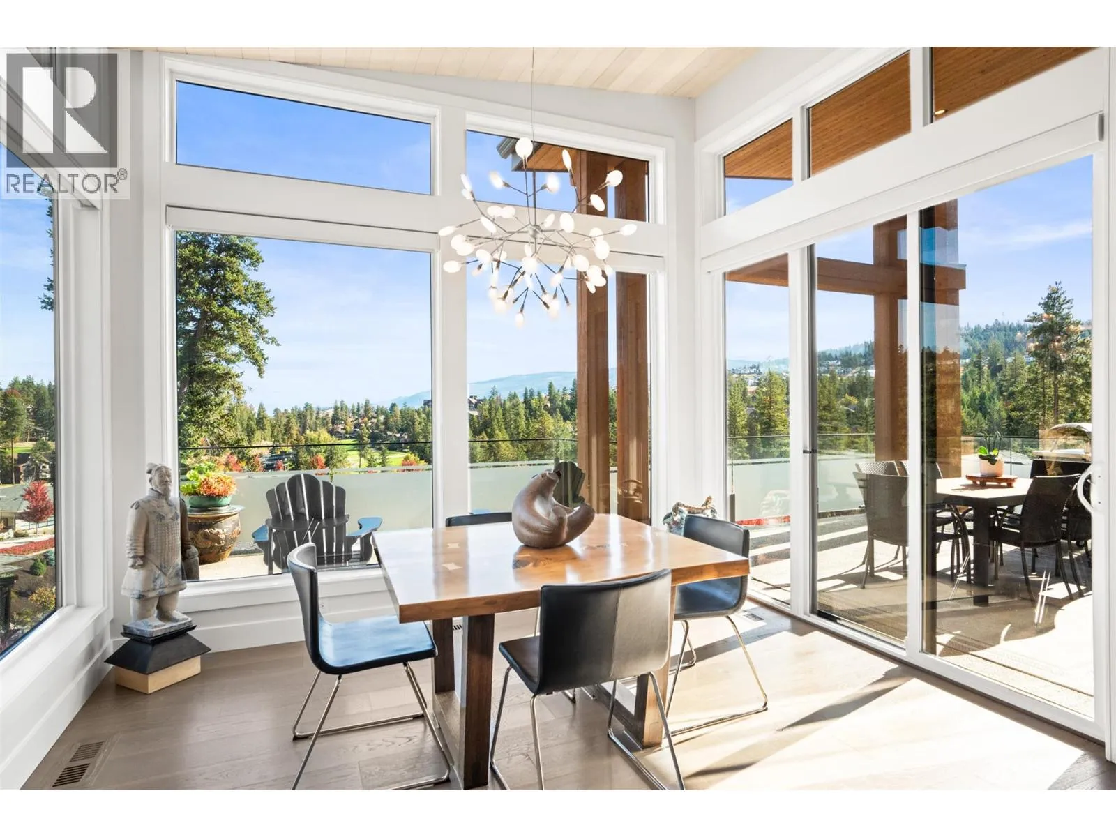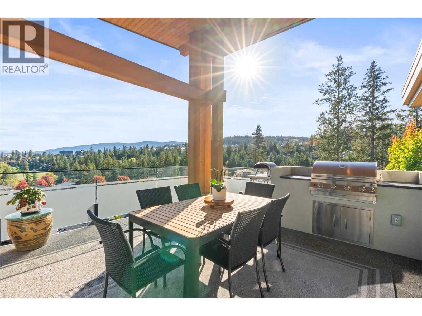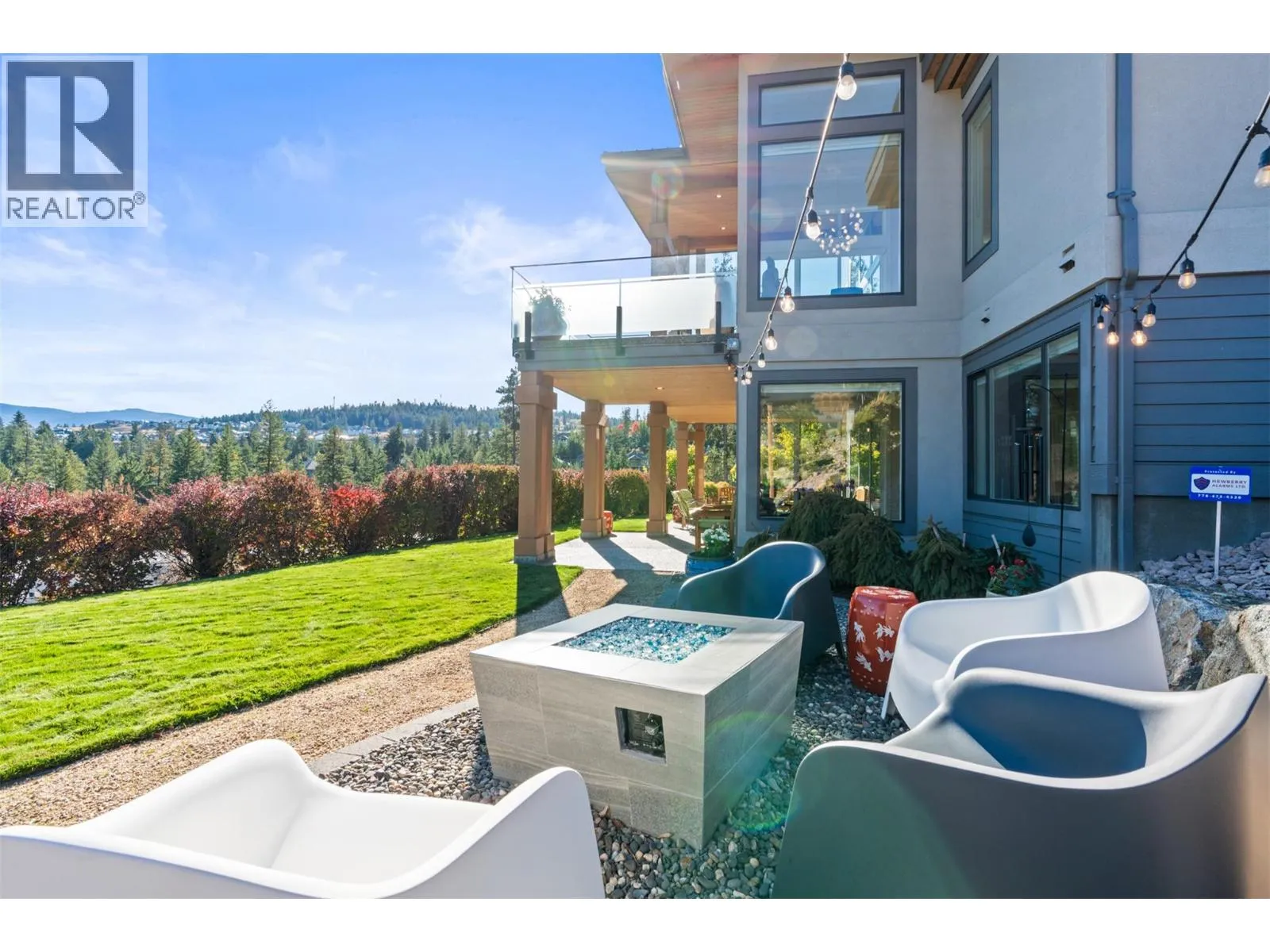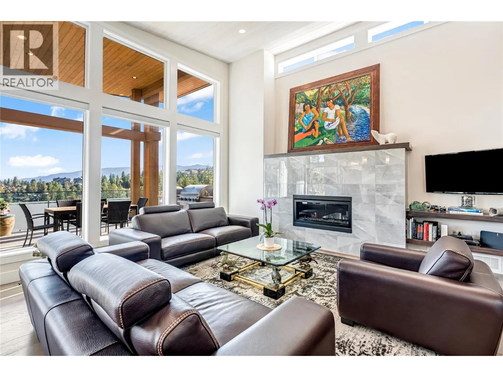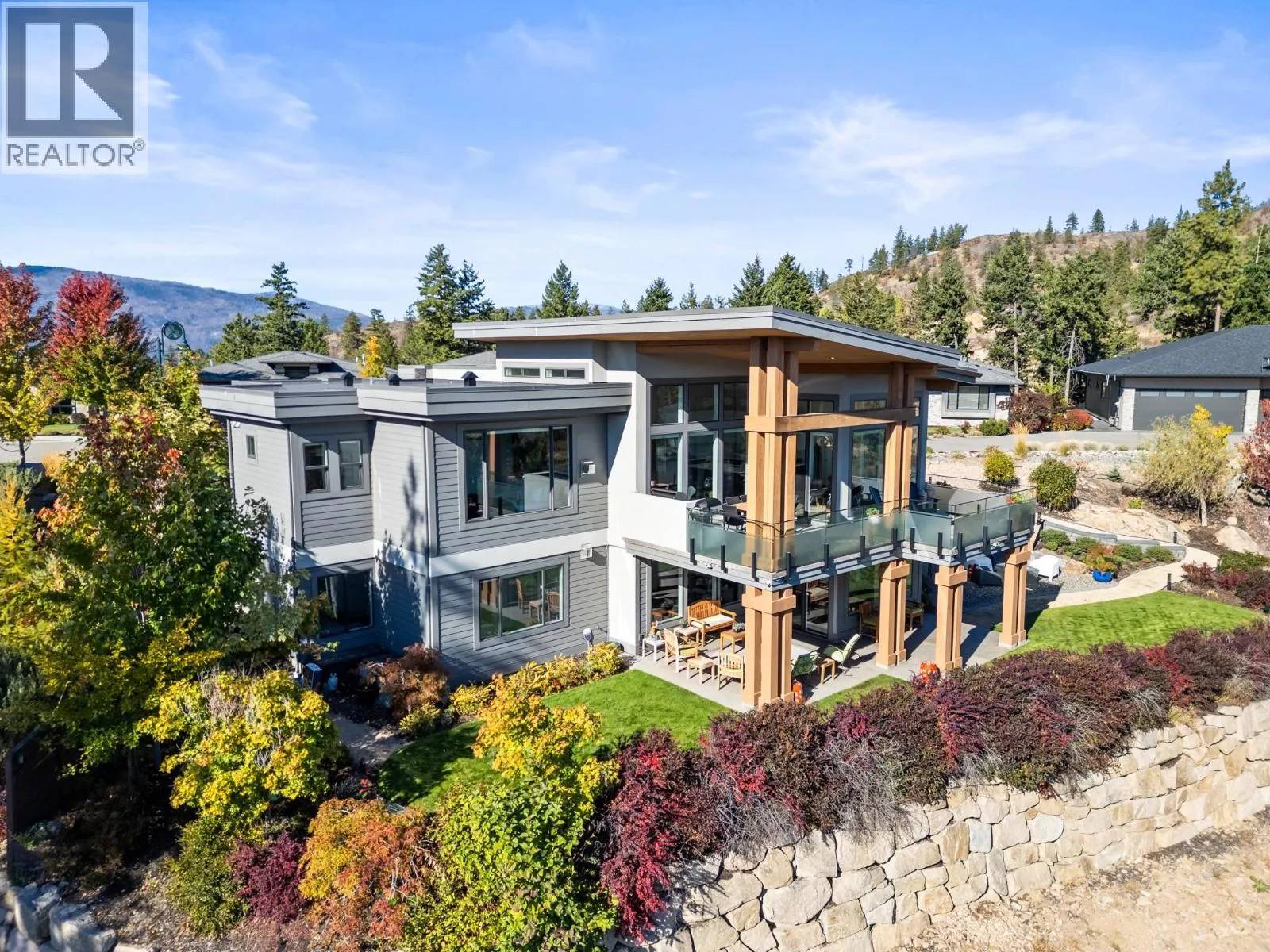 Sophisticated elegance best describes this âHouse on the Hill.â A rare private location offers breathtaking golf, mountain, and big sky views from every room in this former show home. Privately positioned on an oversized 0.32-acre lot above the golf course, this home offers a sense of space, privacy, and calm that is increasingly hard to find. Architectural drama created through 15-foot wood-covered ceilings and massive floor-to-ceiling windows produce an incredible sense of scale and light in every room upon entering. Modern designer features throughout this highly enhanced smart home. Voice, app, automated power window coverings, lights, geothermal and security cameras just to name a few. Upgrades abound. In addition, an expansive 825 sqft sun deck equipped with both built-in BBQ and pizza oven makes this a premier spot for entertaining. The walk-out lower level offers an additional spacious great room, 3 bedrooms, bathroom, gym, storage/wine room and direct access to the private serene backyard featuring a fire pit retreat. Predator Ridge offers a true resort lifestyle with golf, fitness centre, tennis, pickleball, pool and extensive trails, with landscaping included in the monthly community fee of $250. No Strata. A detailed list of seller upgrades is available, highlighting enhancements that add exceptional value. PREDATOR RIDGE EXEMPT FROM BC SPECULATION & VACANCY TAX. (id:27476)