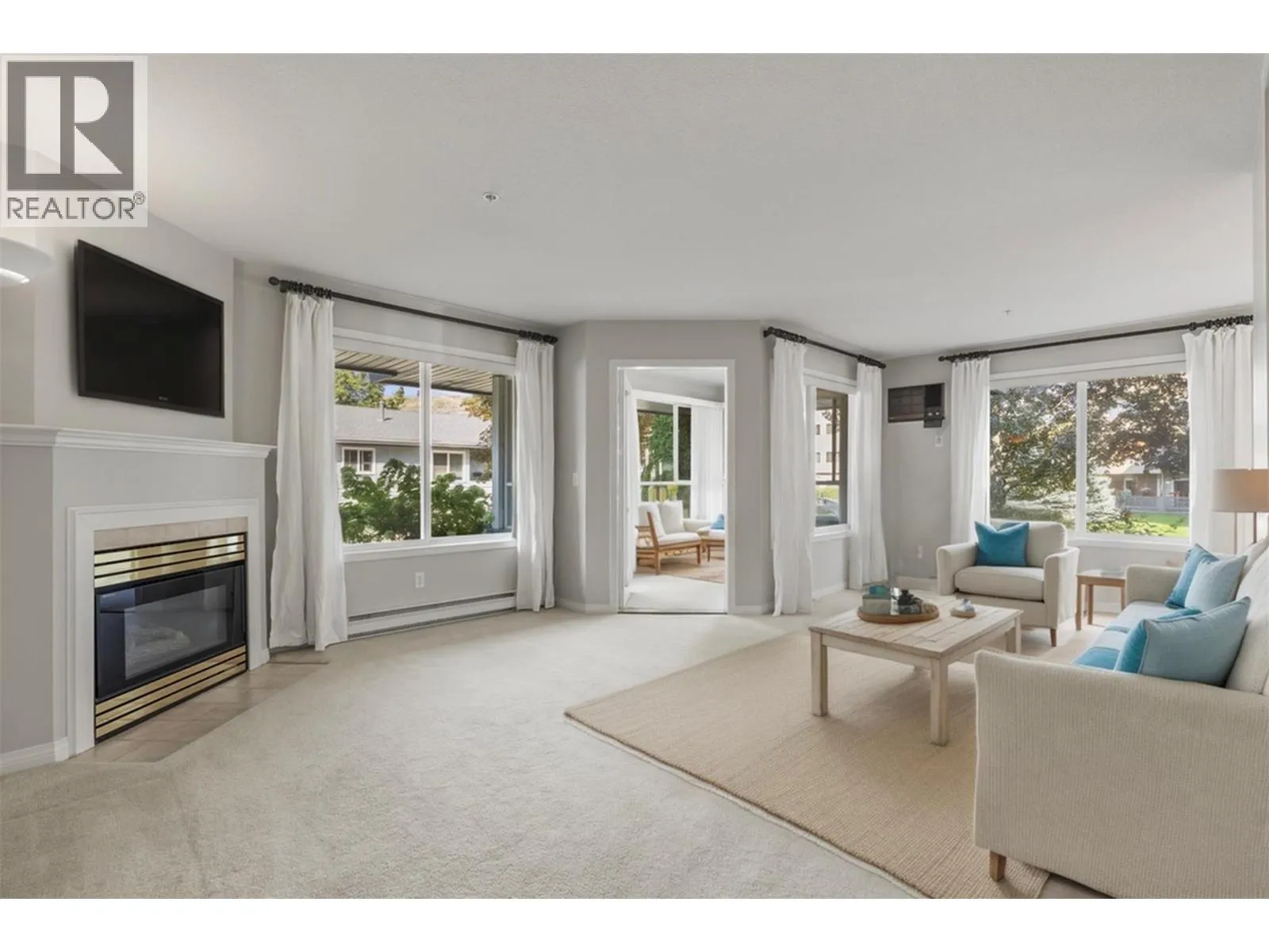 Step into Alexis Park Gardens, a beautifully maintained 55+ community just a short stroll from downtown Vernon. This spacious 2-bedroom, 2-bathroom move-in ready corner unit offers the perfect mix of comfort, convenience, and location. Situated on the main floor for easy access, this bright and welcoming suite is flooded with natural light thanks to large corner windows. The gas fireplace adds cozy charm to the living area, while the sunroom is the ideal space to enjoy your morning coffee, read, or simply unwind. The primary bedroom features a walk-in closet and ensuite, while the second bedroom offers flexibility for guests or hobbies. One parking stall and storage locker are included. Conveniently located just minutes' walk from the Schubert Centre, FreshCo, Natureâs Fare, coffee shops, and downtown dining. Pet restriction: one indoor domestic cat (id:27476)