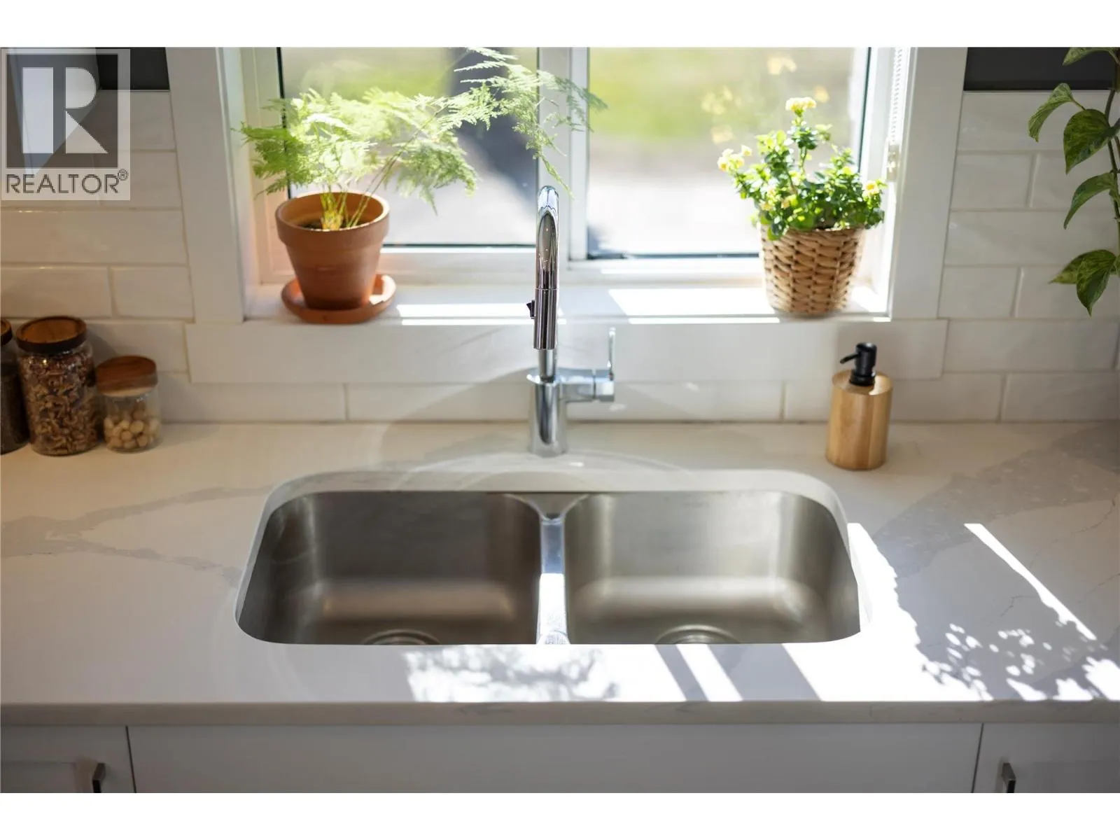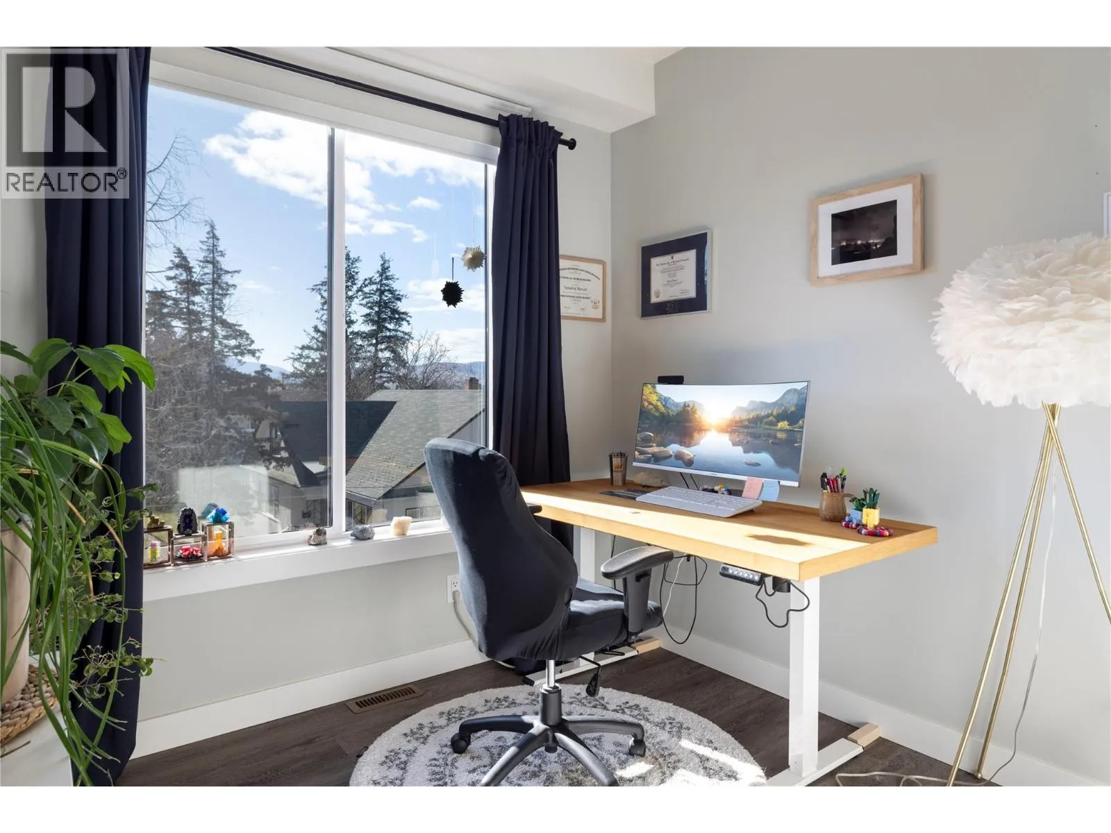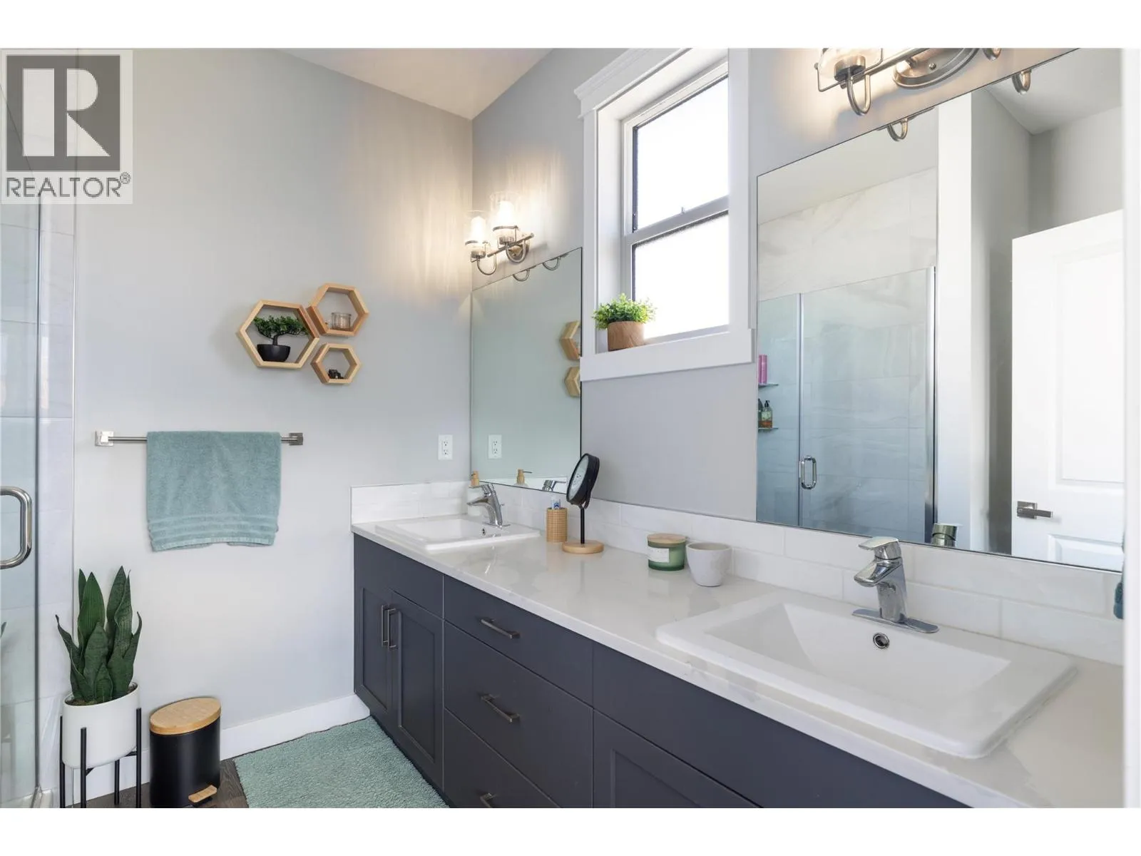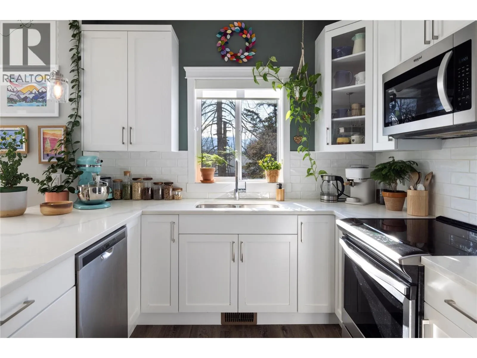 Modern corner unit townhome in the Heart of Harwood - Step into modern living with this beautifully designed three-bedroom townhouse located in the heart of Harwood. Combining contemporary style with in-town convenience, this home offers an excellent opportunity for those seeking low-maintenance, turn-key living, and a short walk to Harwood elementary school. The ground level features the front entry, and a tandem garage with the front portion offering flexibility for a second vehicle, a gym, storage, or hobby space. Upstairs, the main living area is bright and welcoming, filled with natural light and finished with luxury vinyl plank flooring throughout. The modern kitchen showcases sleek quartz countertops, stylish cabinetry, and a breakfast bar, perfect for casual dining or entertaining. The open-concept design flows seamlessly into the living area, with access to a covered balconyâan ideal spot to relax and enjoy the outdoors. The top floor provides privacy with all three bedrooms located on this level. The spacious main bedroom suite features a walk-in closet, and a beautiful ensuite with dual vanities, and a walk-in shower. Two additional bedrooms, a full bathroom, and convenient upper-level laundry complete the layout. A fantastic opportunity to enjoy modern townhouse living in one of Vernonâs most convenient neighbourhoods, close to shopping, schools, parks, and everyday amenities. (id:27476)