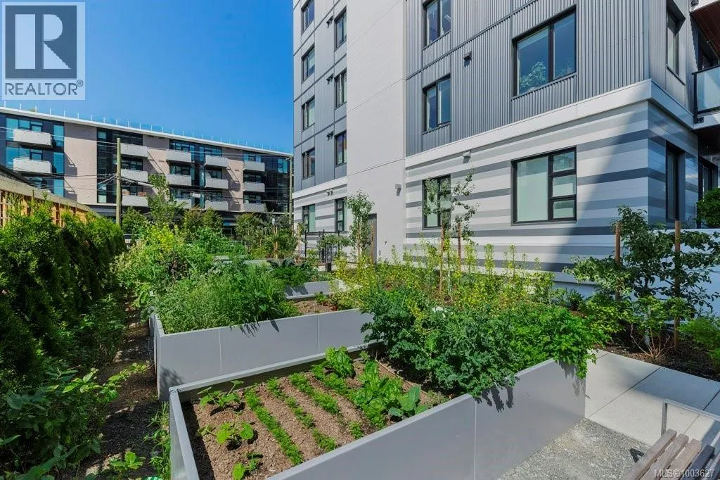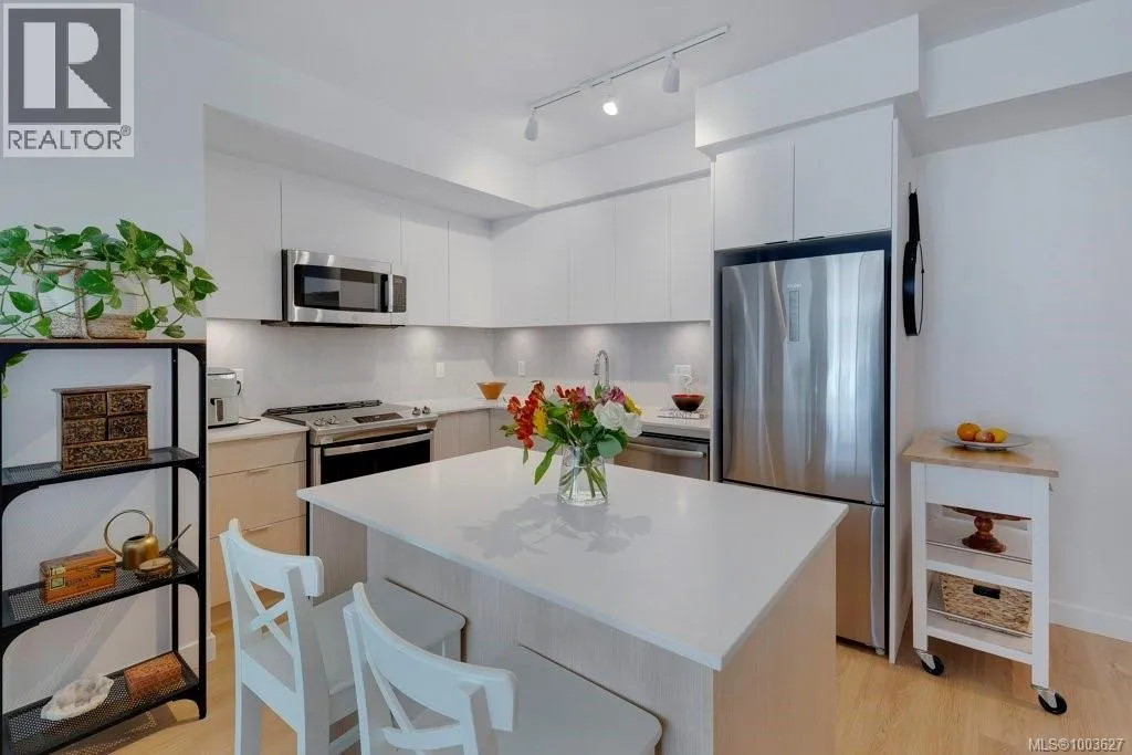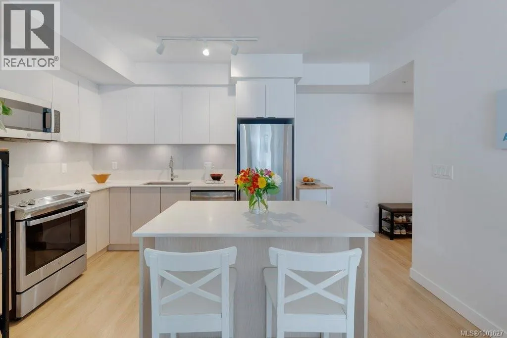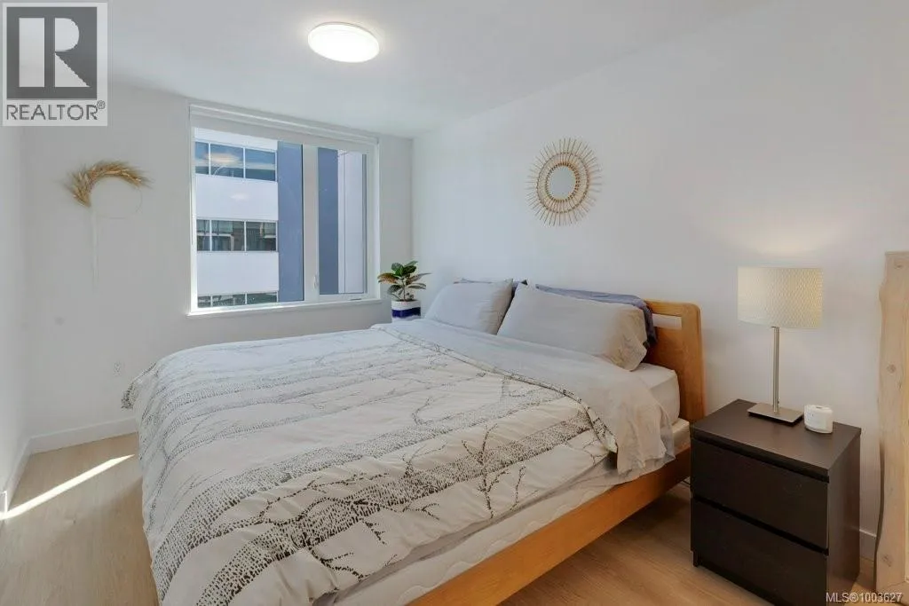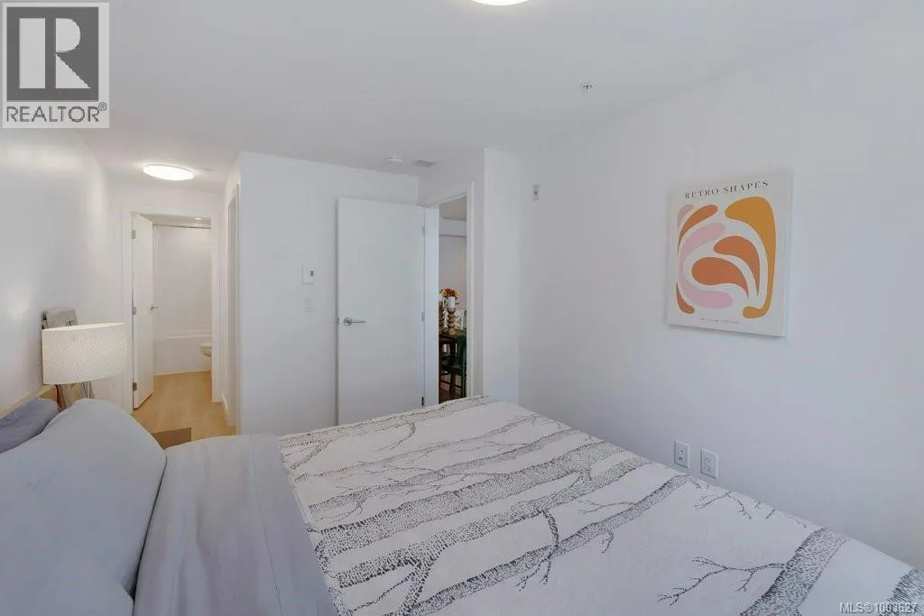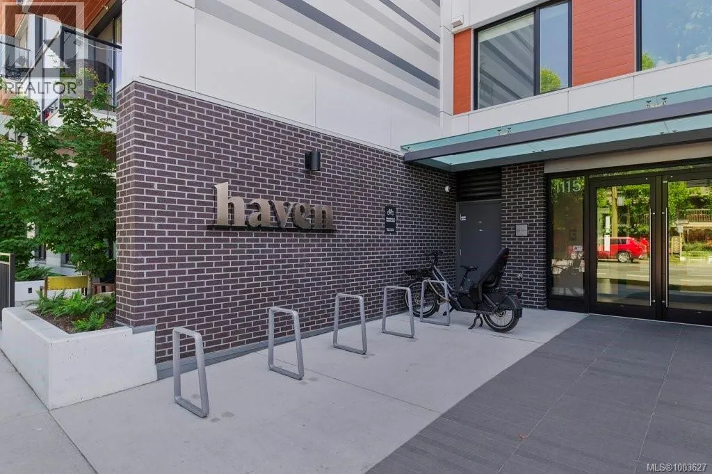 Tucked away on upper Johnson Street, Haven offers a convenient lifestyle with a near-perfect Walk Score and buses right outside your door, seamlessly blending downtown energy with Fernwood charm. Enjoy the convenience of the on-site pet run and wash station, along with peace of mind thanks to a comprehensive 2-5-10 warranty. Your home includes dedicated parking, a storage locker, and an exclusive e-bike and car-share program. Step inside this thoughtfully designed condo to a bright, open-concept living space. The 8'8'' ceilings and durable vinyl plank flooring create an inviting atmosphere. The gourmet kitchen features sleek cabinetry, stainless steel appliances, solid surface countertops, and a chic porcelain tile backsplash. For maximum privacy, the two bedrooms are situated on opposite sides of the living area. The primary bedroom easily accommodates a king-size bed and includes a spacious walk-in closet. This is the perfect place to call home. (id:27476)