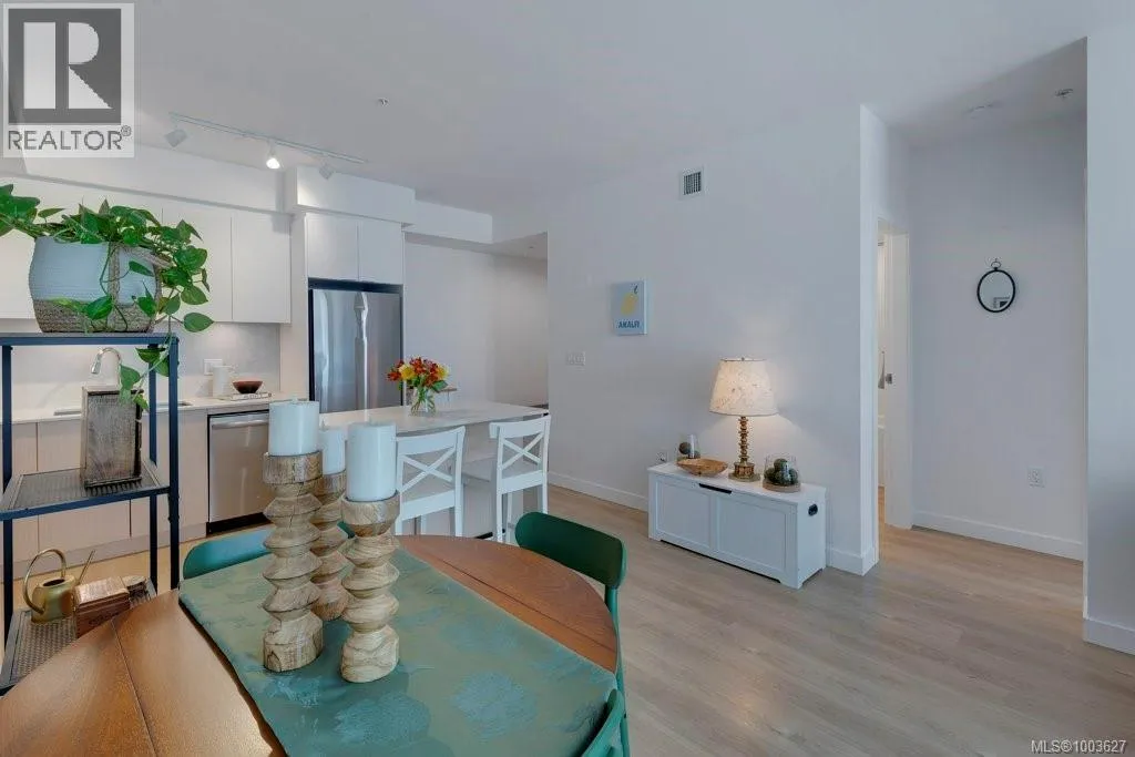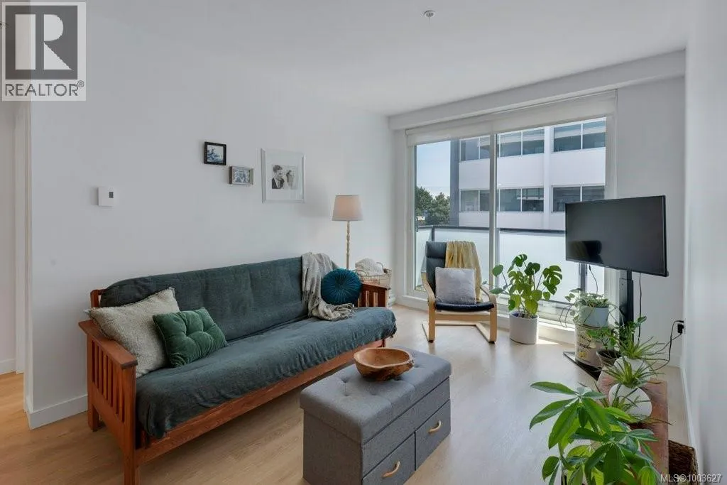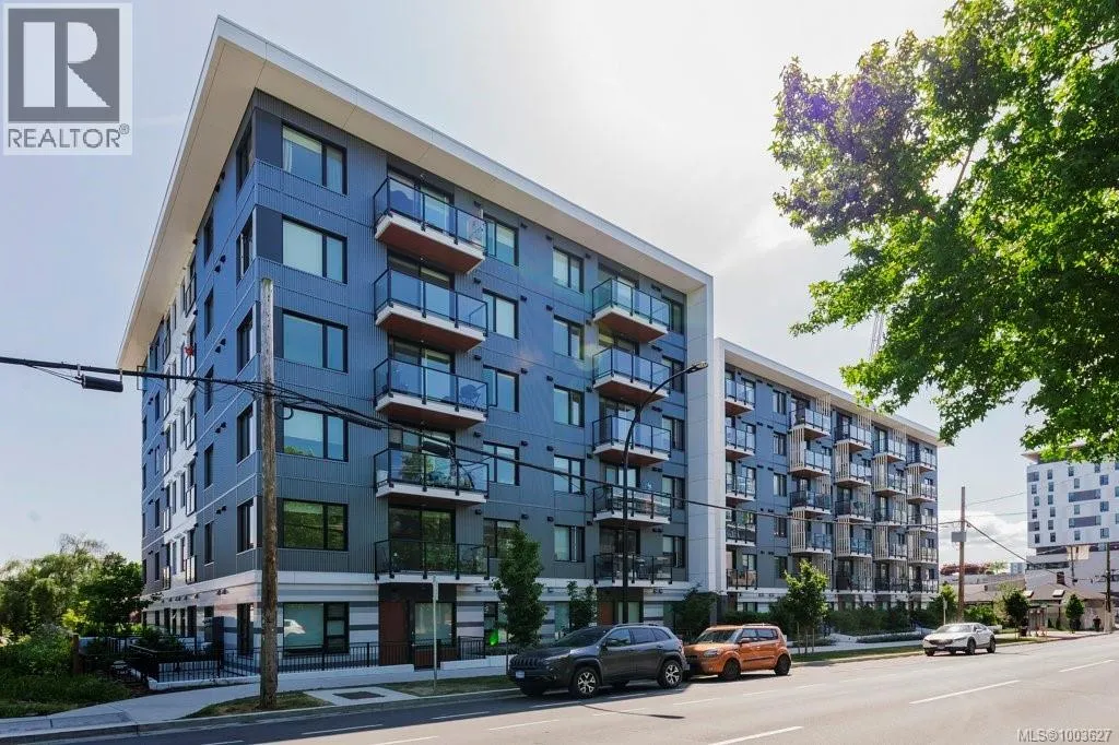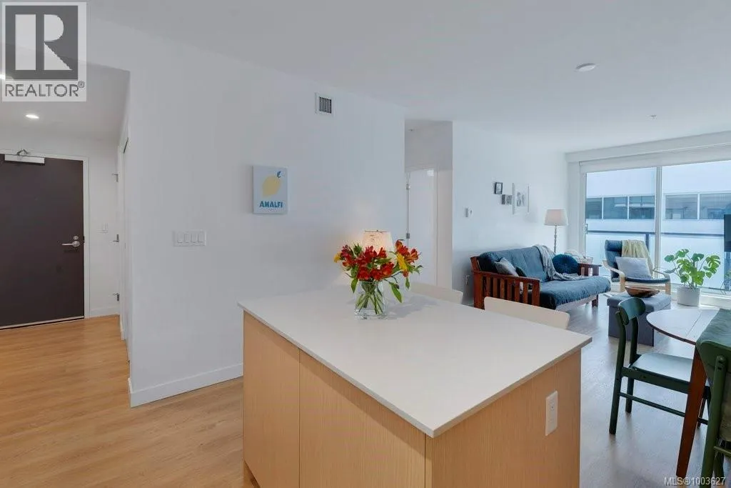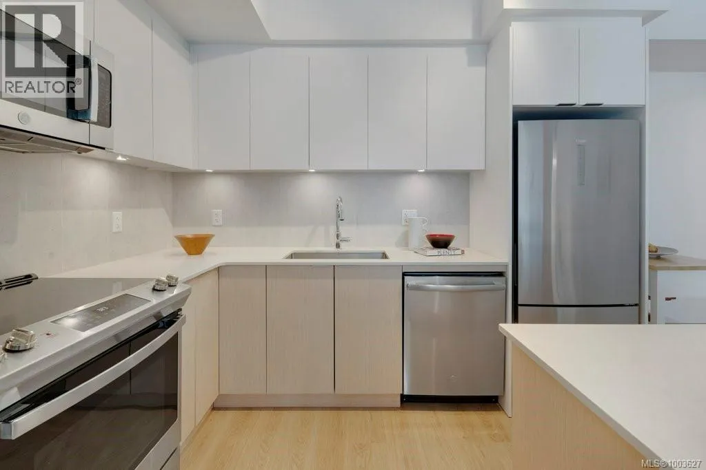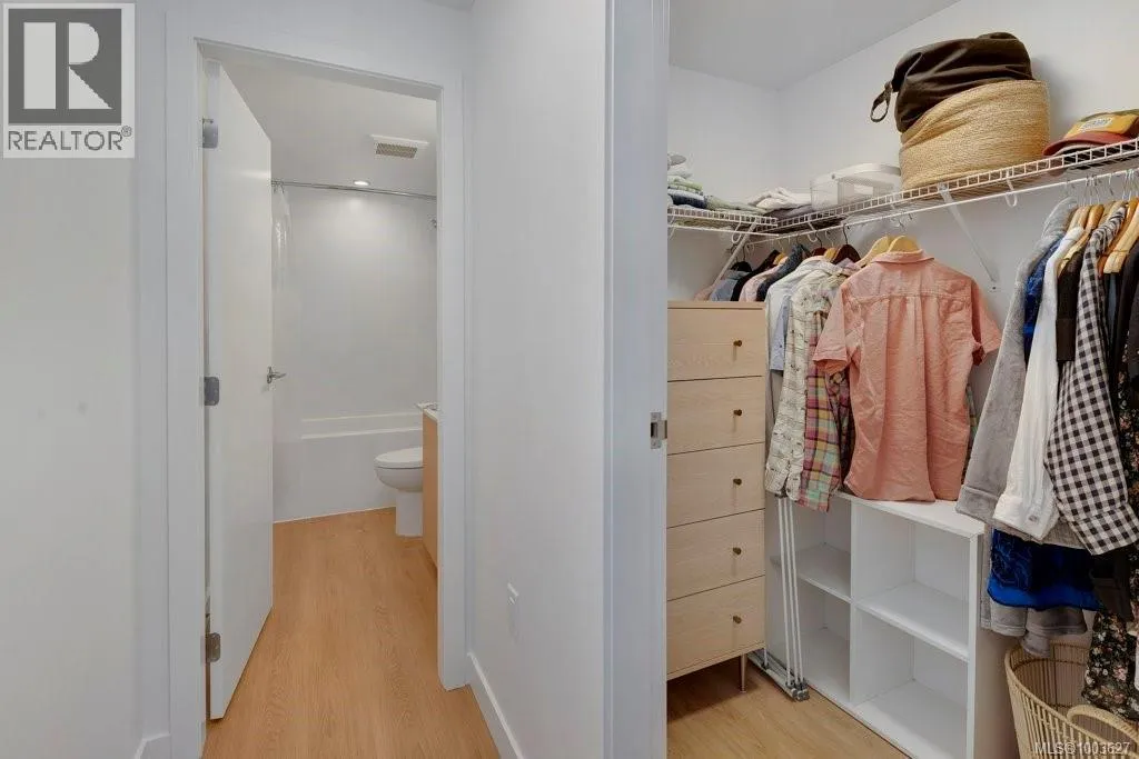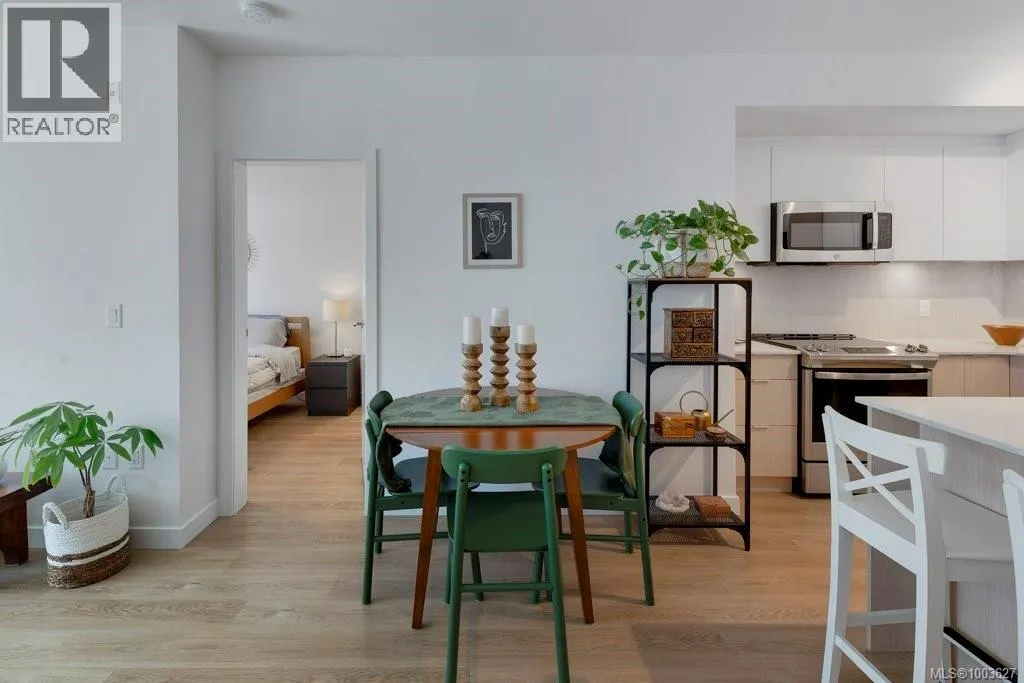 Tucked away on upper Johnson Street, Haven offers a convenient lifestyle with a near-perfect Walk Score and buses right outside your door, seamlessly blending downtown energy with Fernwood charm. Enjoy the convenience of the on-site pet run and wash station, along with peace of mind thanks to a comprehensive 2-5-10 warranty. Your home includes dedicated parking, a storage locker, and an exclusive e-bike and car-share program. Step inside this thoughtfully designed condo to a bright, open-concept living space. The 8'8'' ceilings and durable vinyl plank flooring create an inviting atmosphere. The gourmet kitchen features sleek cabinetry, stainless steel appliances, solid surface countertops, and a chic porcelain tile backsplash. For maximum privacy, the two bedrooms are situated on opposite sides of the living area. The primary bedroom easily accommodates a king-size bed and includes a spacious walk-in closet. This is the perfect place to call home. (id:27476)