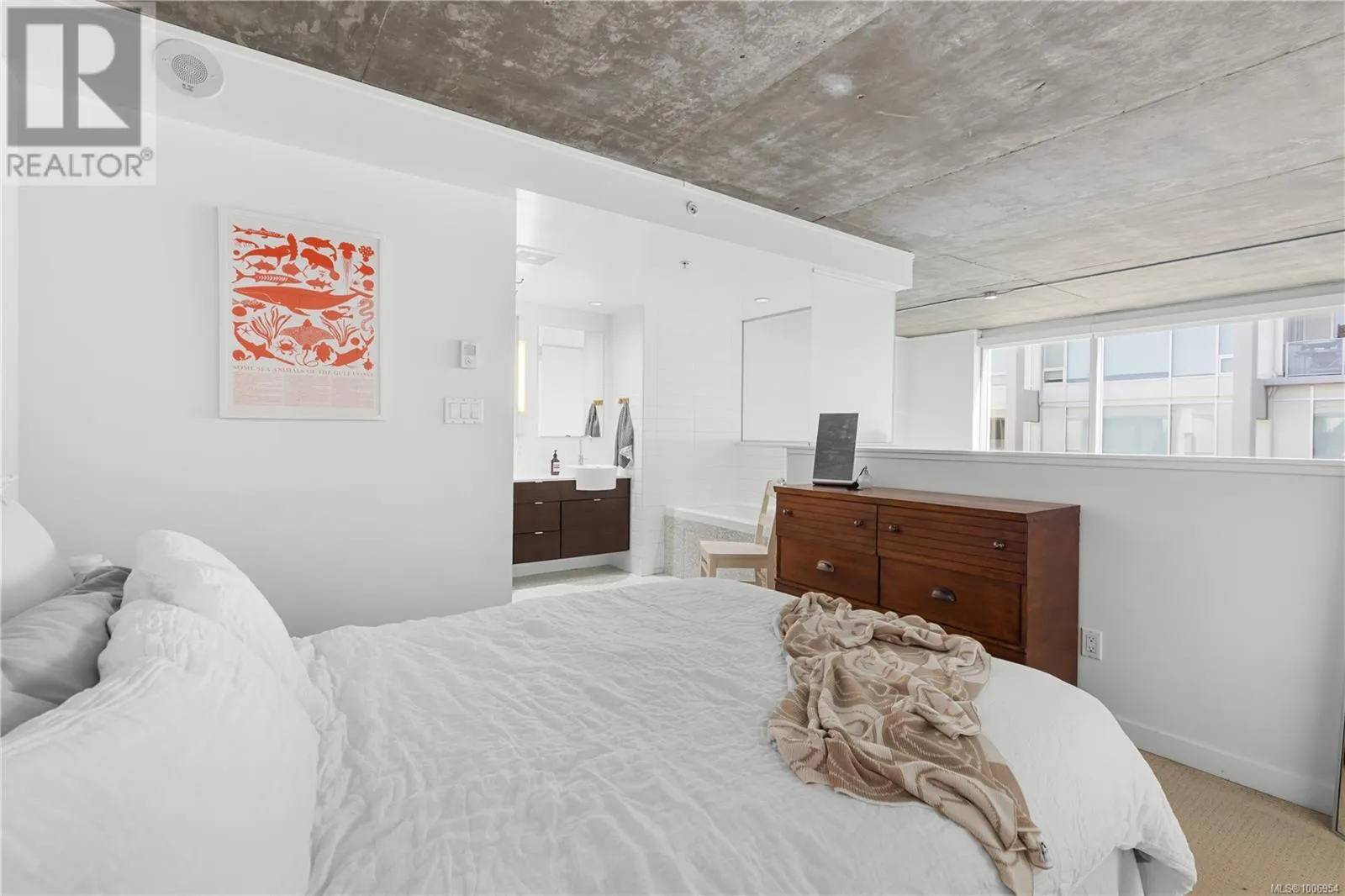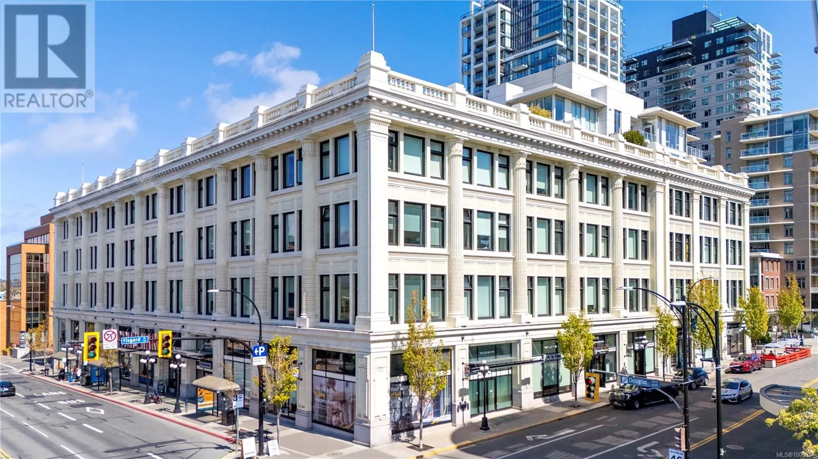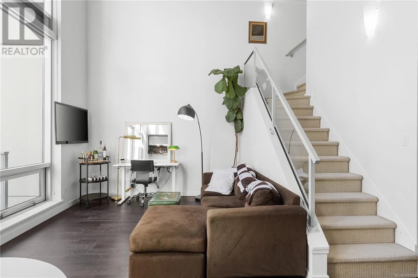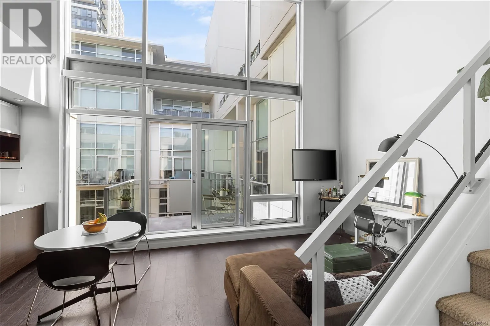 Light and Luxurious Loft in The Hudson Welcome to this meticulously maintained two-bedroom, two-bathroom residence in the Hudson, one of downtown Victoriaâs most sought-after landmark buildings. This quiet, courtyard-facing unit boasts a sun-soaked living space framed by expansive, oversized windows that flood the home with natural light. Step inside to a stunning main level featuring soaring 17-foot ceilings, an open-concept layout, and thoughtfully designed living area. The spacious living room flows seamlessly into the dining area and a well-appointed kitchen, with in-suite laundry tucked conveniently nearby. A three-piece bathroom and a generously sized bedroom complete the main floor. Upstairs, retreat to the large primary bedroom with ample closet space and a spa-inspired ensuite featuring double sinks, a deep soaker tub, and a separate walk-in shower. You will enjoy a wide range of amenities, including secure underground parking, a storage locker, bike storage, and access to a spectacular rooftop deck with complete with BBQs and sweeping sunset views. The strata fee includes heat, air conditioning, and hot water. Pets are welcome! Live just steps from shops, restaurants, transit, and the Inner Harbour, everything you love about downtown Victoria is right outside your door. (id:27476)