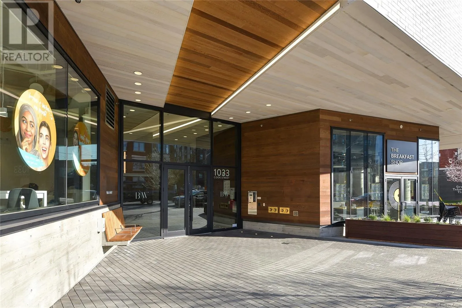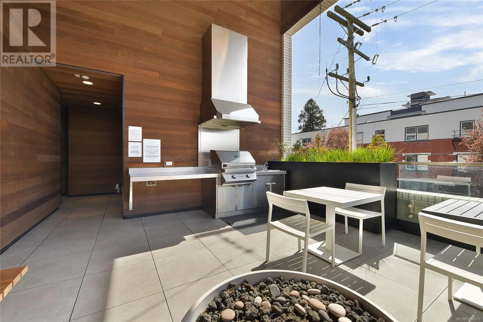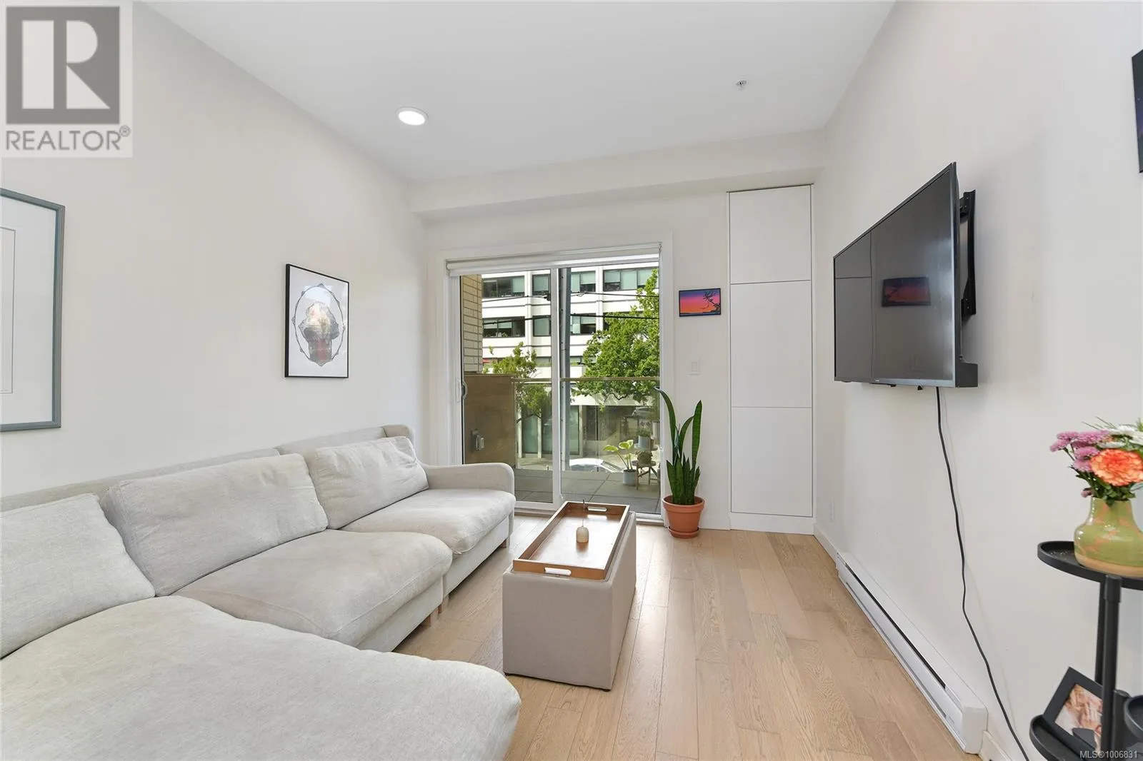 Modern and refined one bed + den residence in the award-winning Black & White by Abstract Developments. A generous foyer leads to a versatile den, ideal for remote work or added flexibility. The open layout connects dining and living spaces with custom built-ins and opens to a quiet north-facing balcony. Oak floors throughout, with soft wool carpet in the spacious bedroom. The streamlined kitchen features upgraded stainless appliances, quartz counters, gas cooktop, and integrated fridge within custom cabinetry. The spa-inspired bath includes a soaker tub, polished porcelain tile, and ambient under-cabinet lighting. Amenities include a communal outdoor lounge with kitchen and firepit, EV charging, car share, bike room, pet-friendly policy, dog wash station and secure storage. Walkable to downtown, Cook Street Village, shops, yoga, gyms, dining, and the best of Victoria. (id:27476)