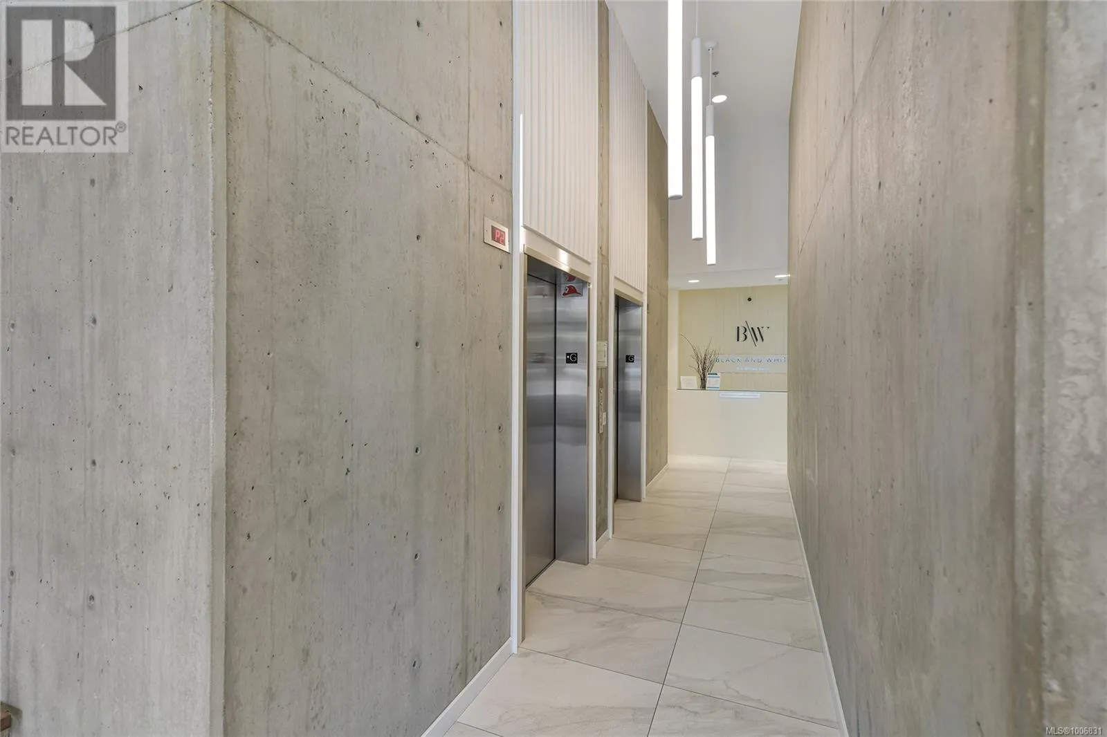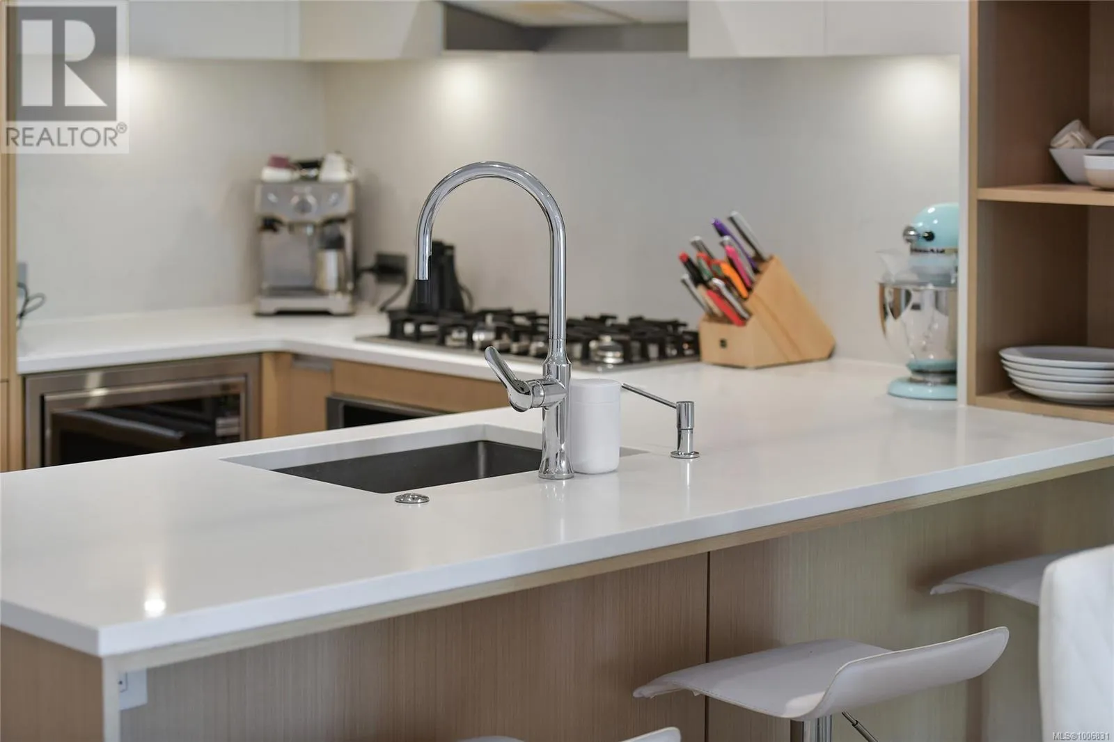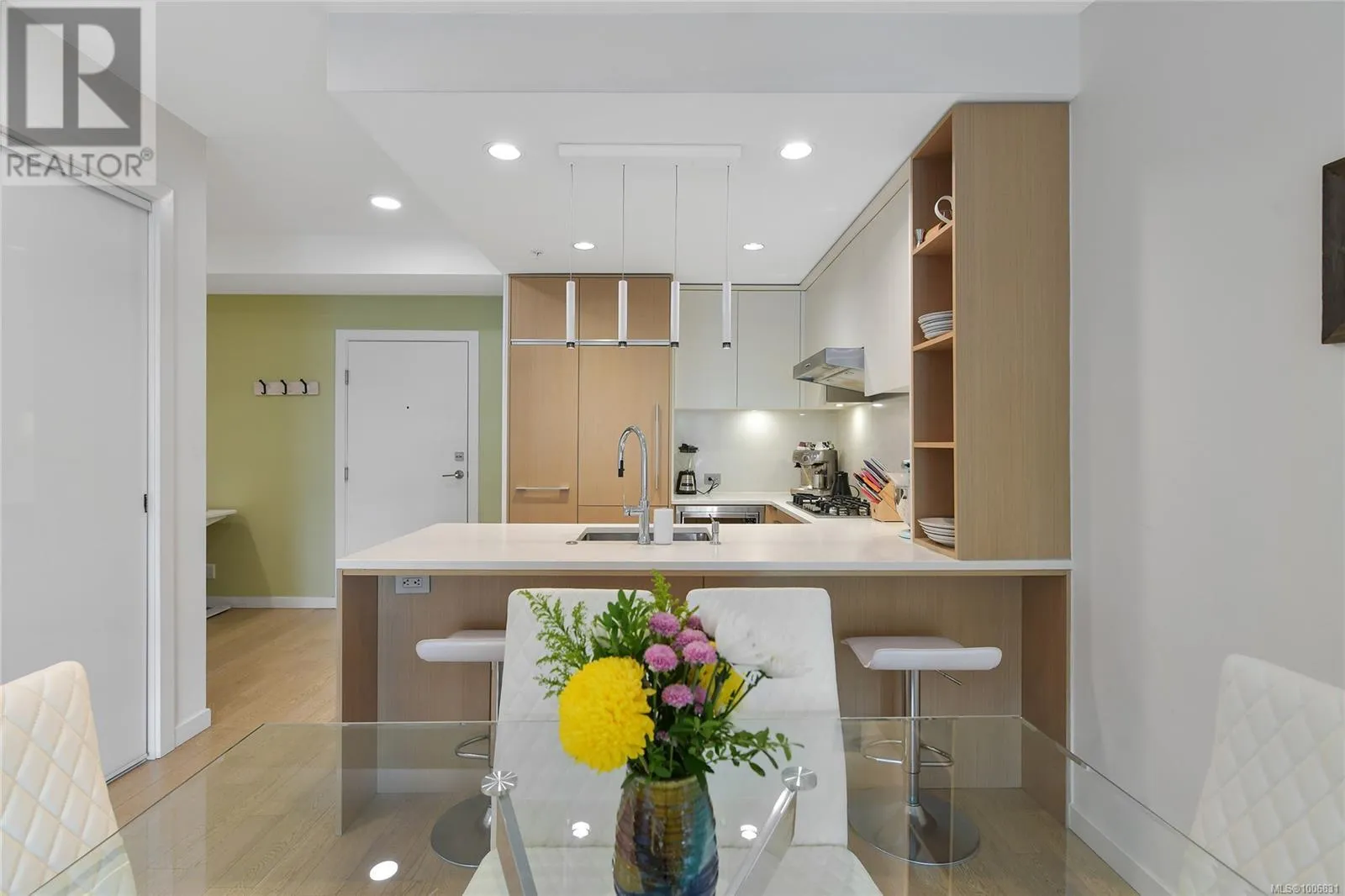Modern and refined one bed + den residence in the award-winning Black & White by Abstract Developments. A generous foyer leads to a versatile den, ideal for remote work or added flexibility. The open layout connects dining and living spaces with custom built-ins and opens to a quiet north-facing balcony. Oak floors throughout, with soft wool carpet in the spacious bedroom. The streamlined kitchen features upgraded stainless appliances, quartz counters, gas cooktop, and integrated fridge within custom cabinetry. The spa-inspired bath includes a soaker tub, polished porcelain tile, and ambient under-cabinet lighting. Amenities include a communal outdoor lounge with kitchen and firepit, EV charging, car share, bike room, pet-friendly policy, dog wash station and secure storage. Walkable to downtown, Cook Street Village, shops, yoga, gyms, dining, and the best of Victoria. (id:27476)